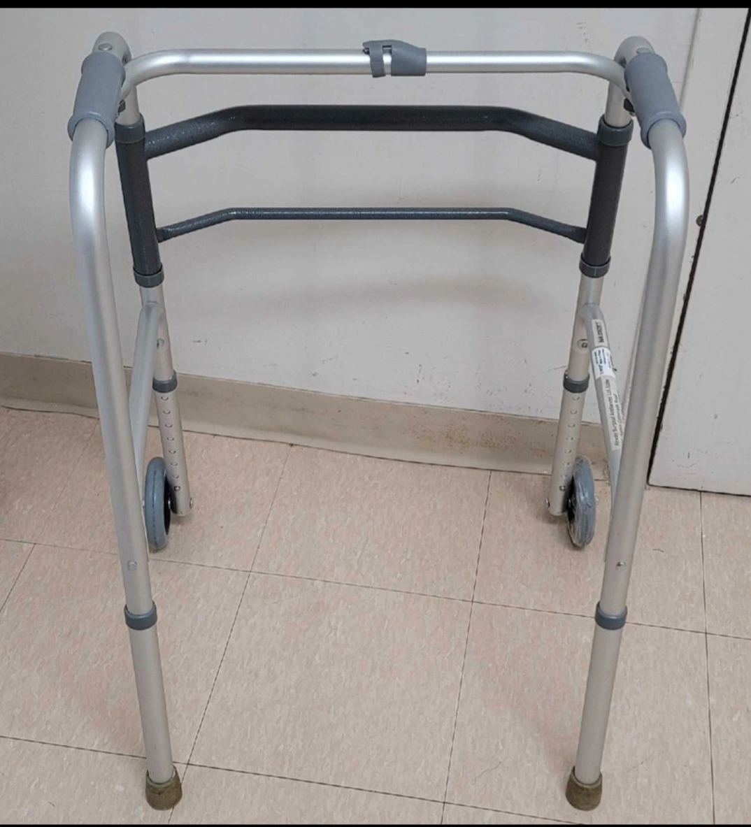 Silver metal frame. Gray padded handles. Two front wheels for easy movement. A walker helps improve mobility, making daily tasks easier.