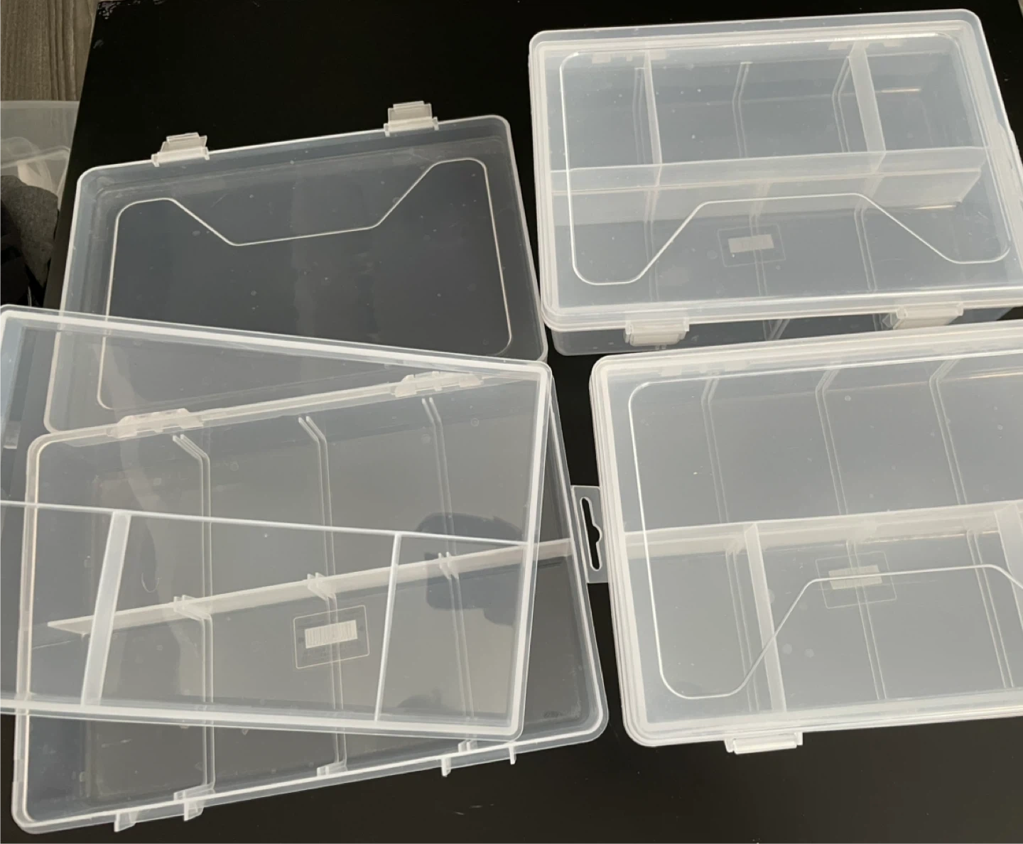 3x Clear plastic storage boxes. Several compartments inside. Great for organizing small items. These boxes can help you stay organized and find things easily.