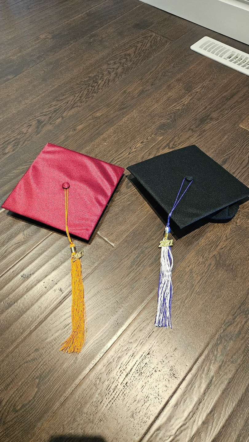 (red one sold) Two graduation caps in different colours. One in red and the other in black. Each cap with a tassel. A great item to keep as a memory of a special day or as a costume or prop.