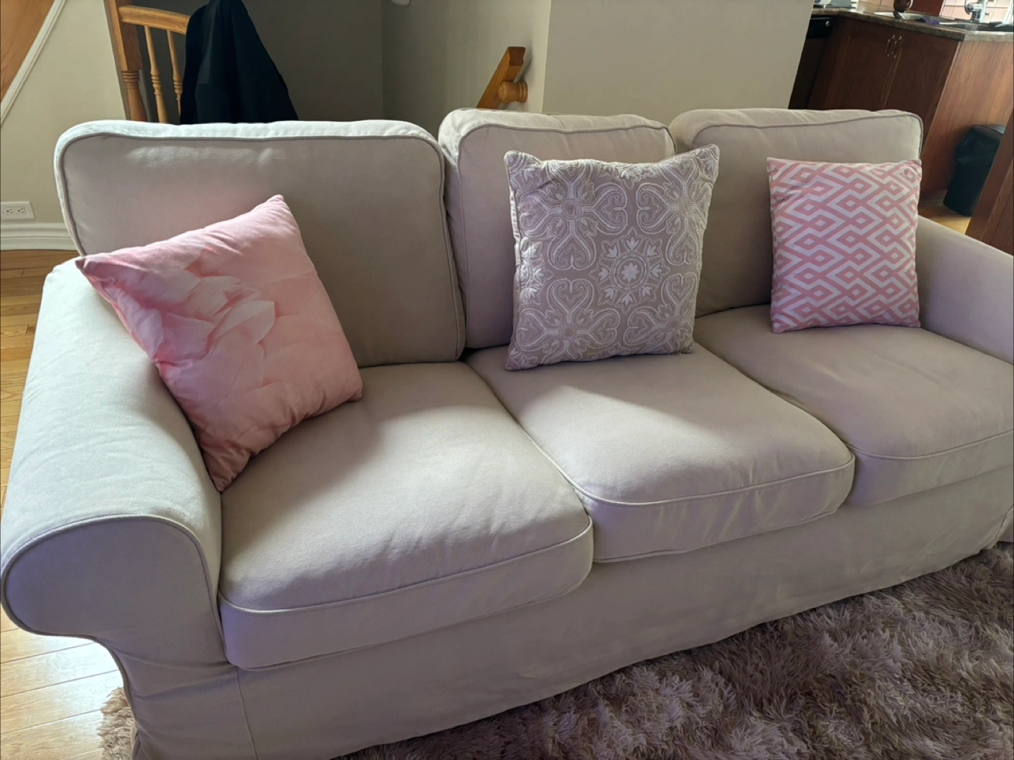 Beige sofa with three seat cushions. Includes several throw pillows. Features rounded arms and a skirted base. This sofa is perfect for cozying up with a good book.
