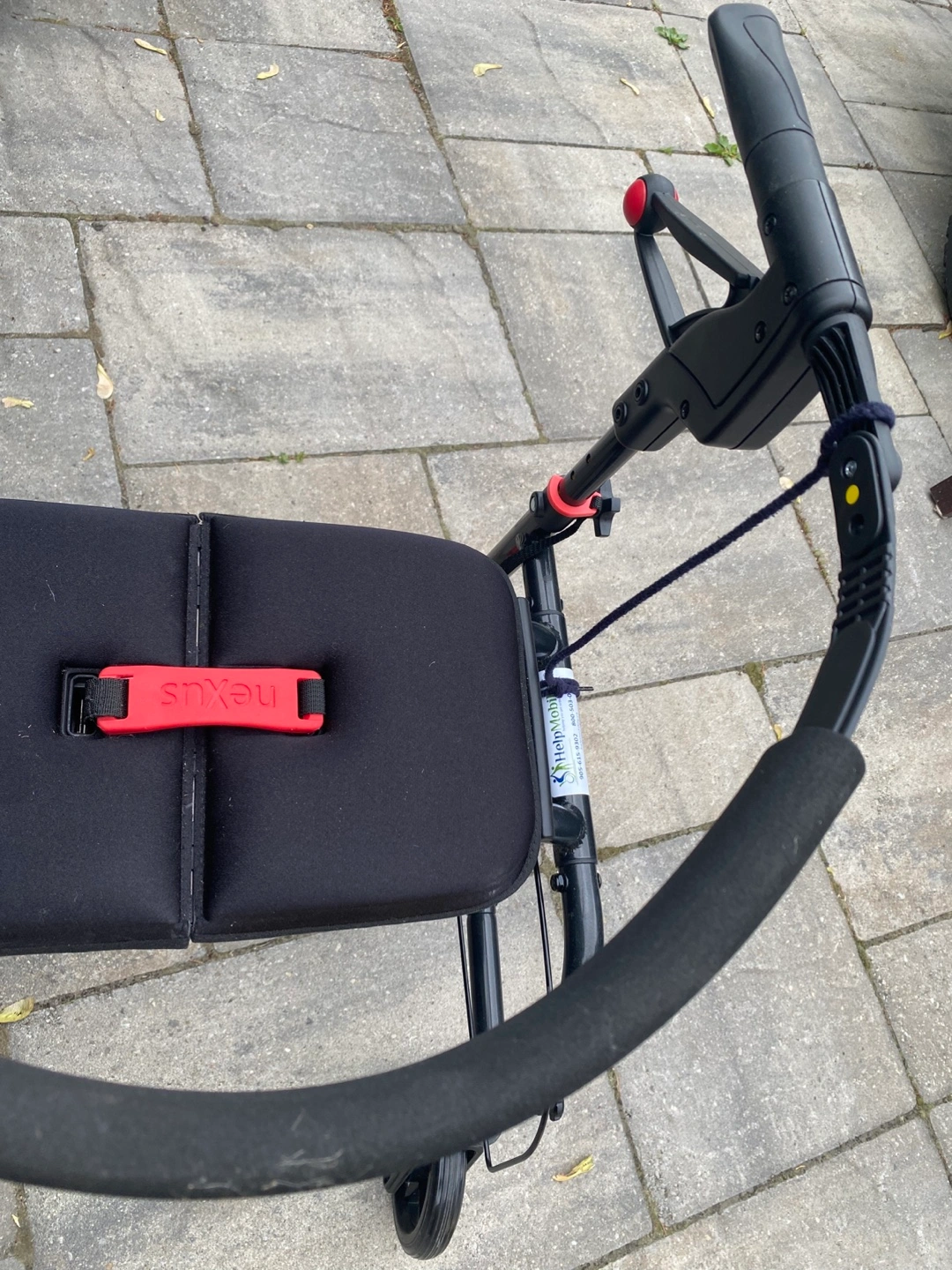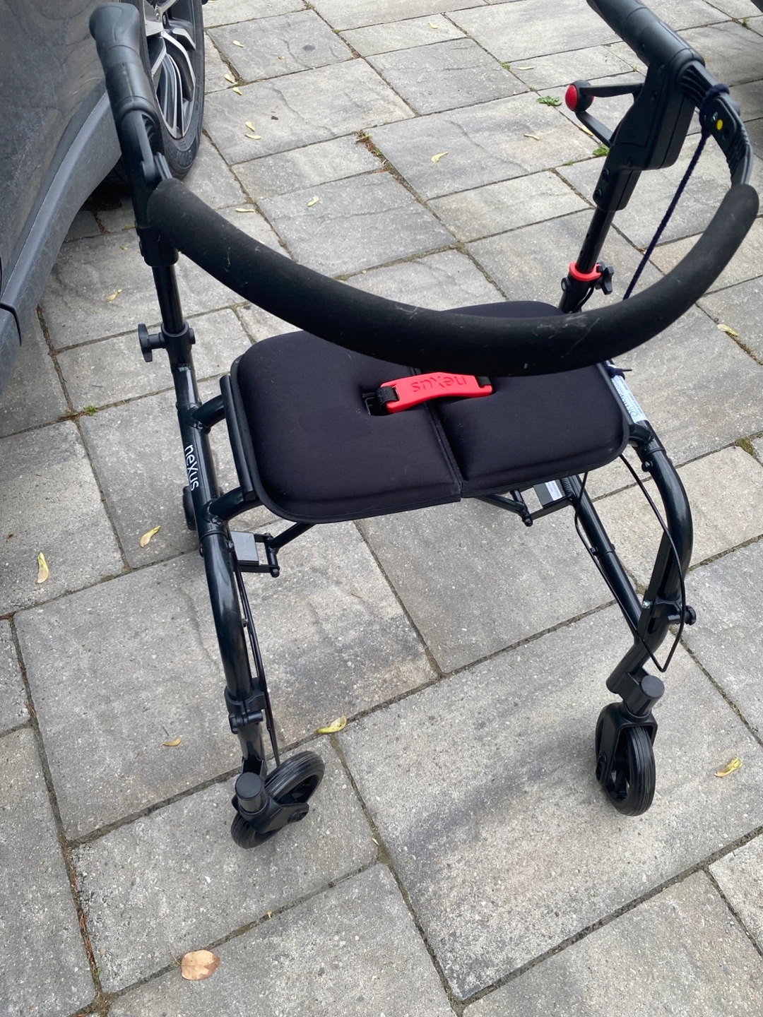 Rolling walker in black with a black seat. Red accents can be seen. The walker is on wheels for ease of use. Taking a stroll with this walker can be a relaxing experience.