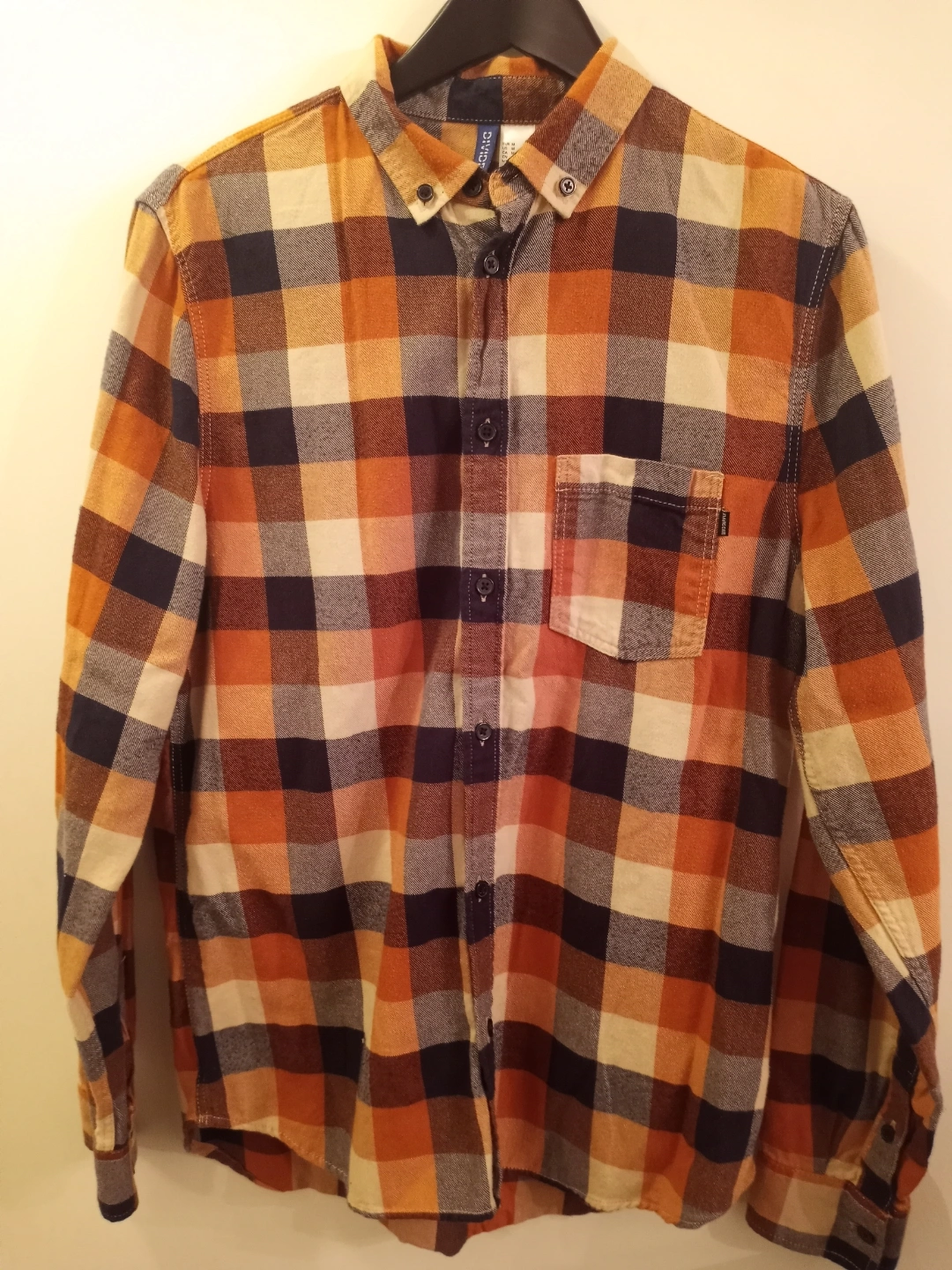 Shirt in a plaid pattern. Features button-down collar and a pocket on the chest. The buttons appear to be black. This shirt would be great for a casual winter day.