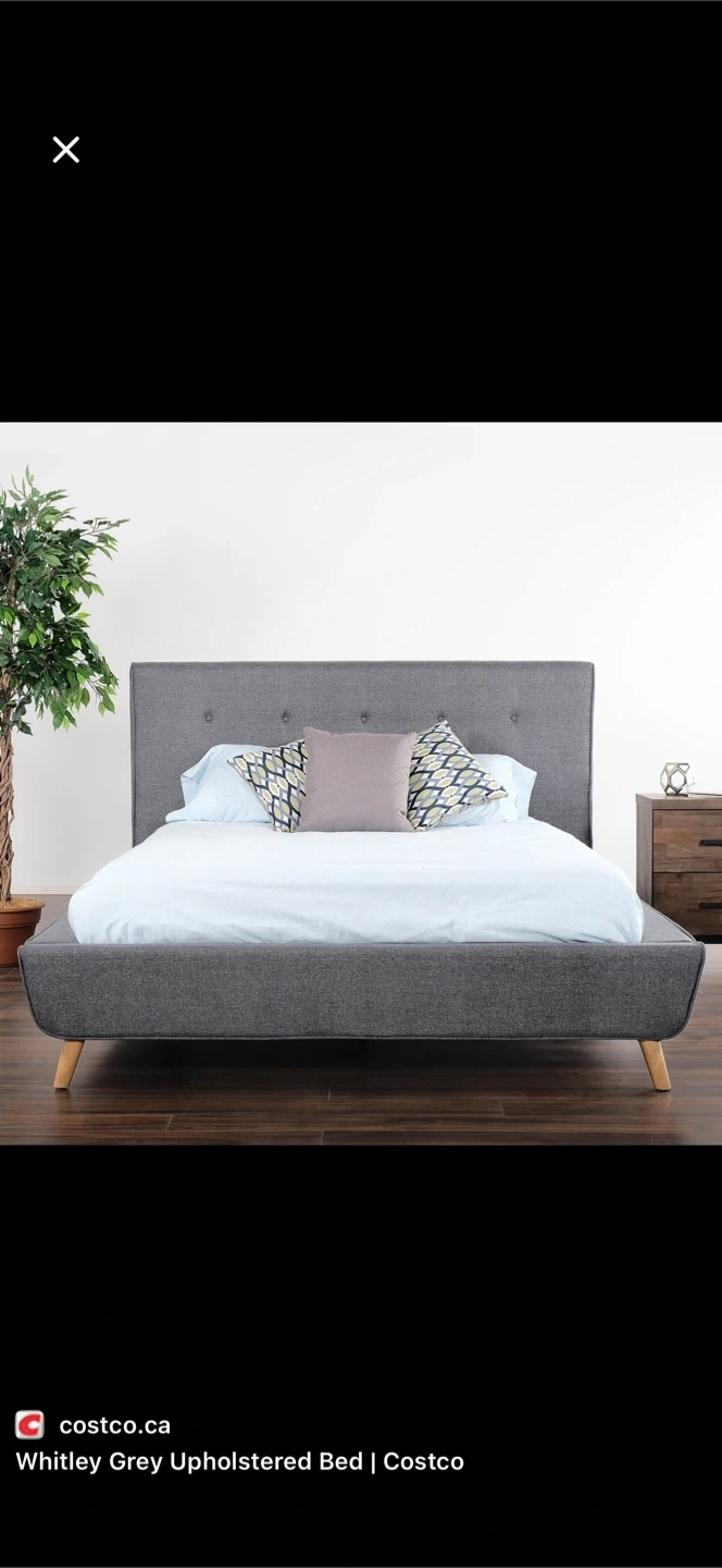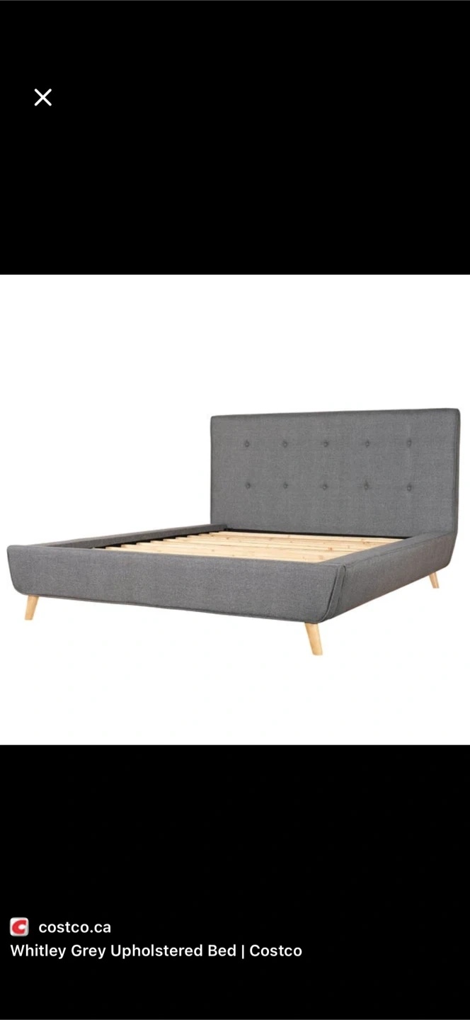 Beautiful Whitley grey upholstered bed frame with a button-tufted headboard. Modern and elegant design that works with many bedroom styles. The grey linen fabric and light wood legs give it a clean, contemporary look.
