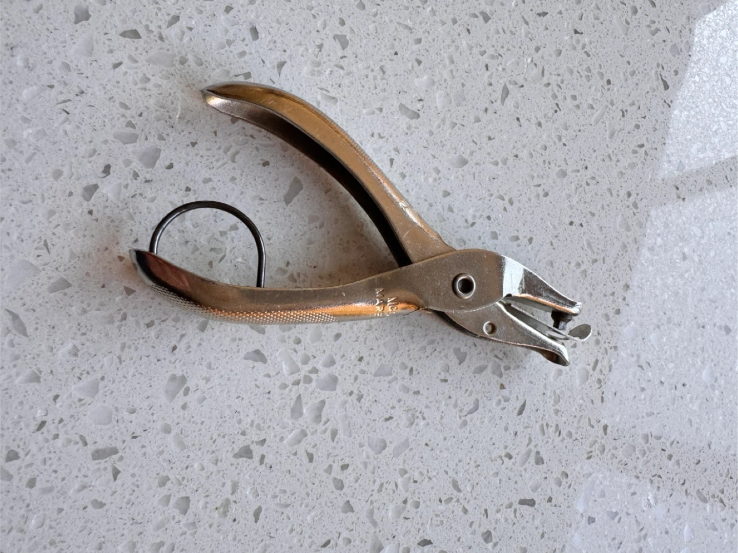 This is a compact, single-hole punch made of metal. It has a built-in loop for hanging or storage. Ideal for small crafting projects or quick hole punching needs.