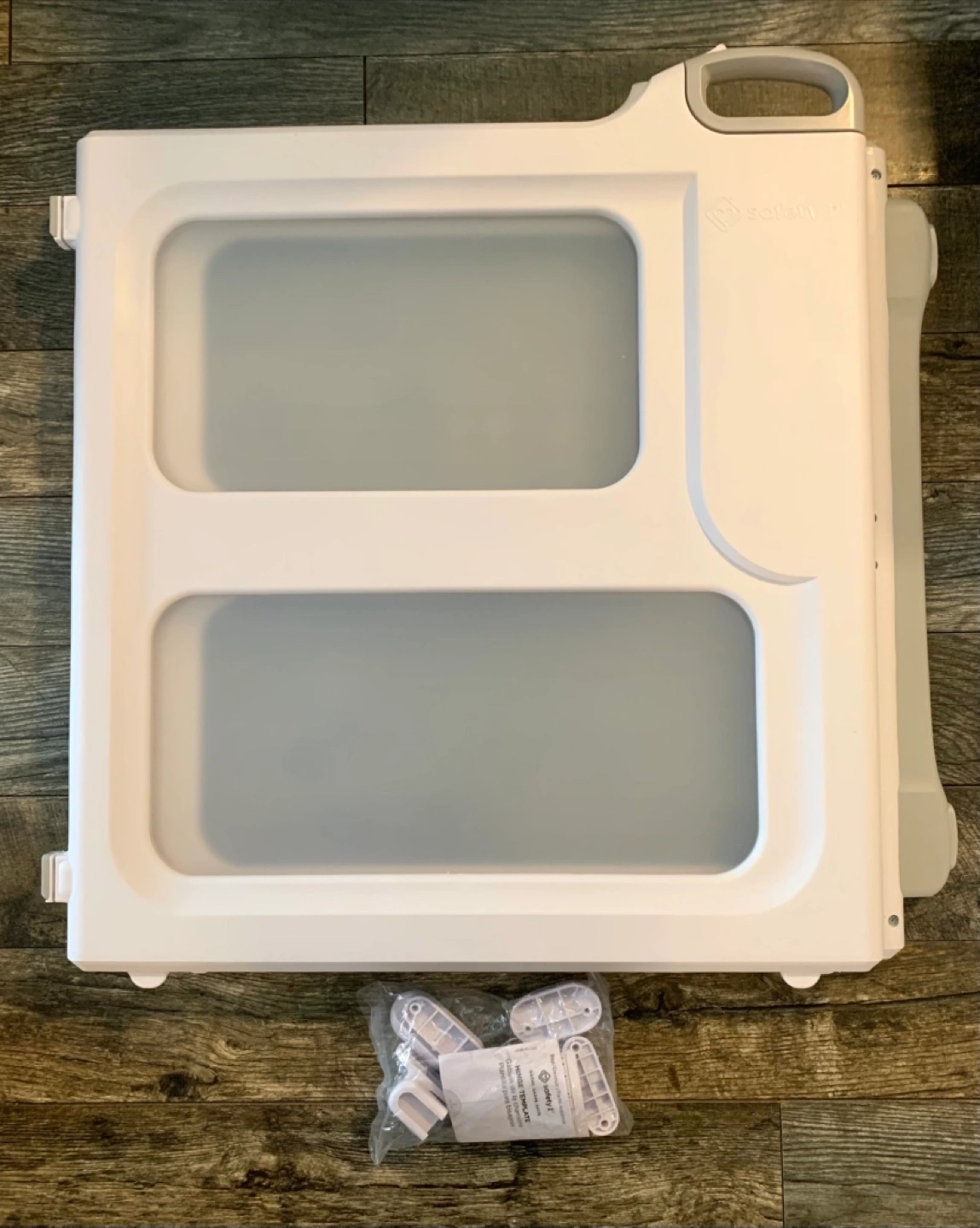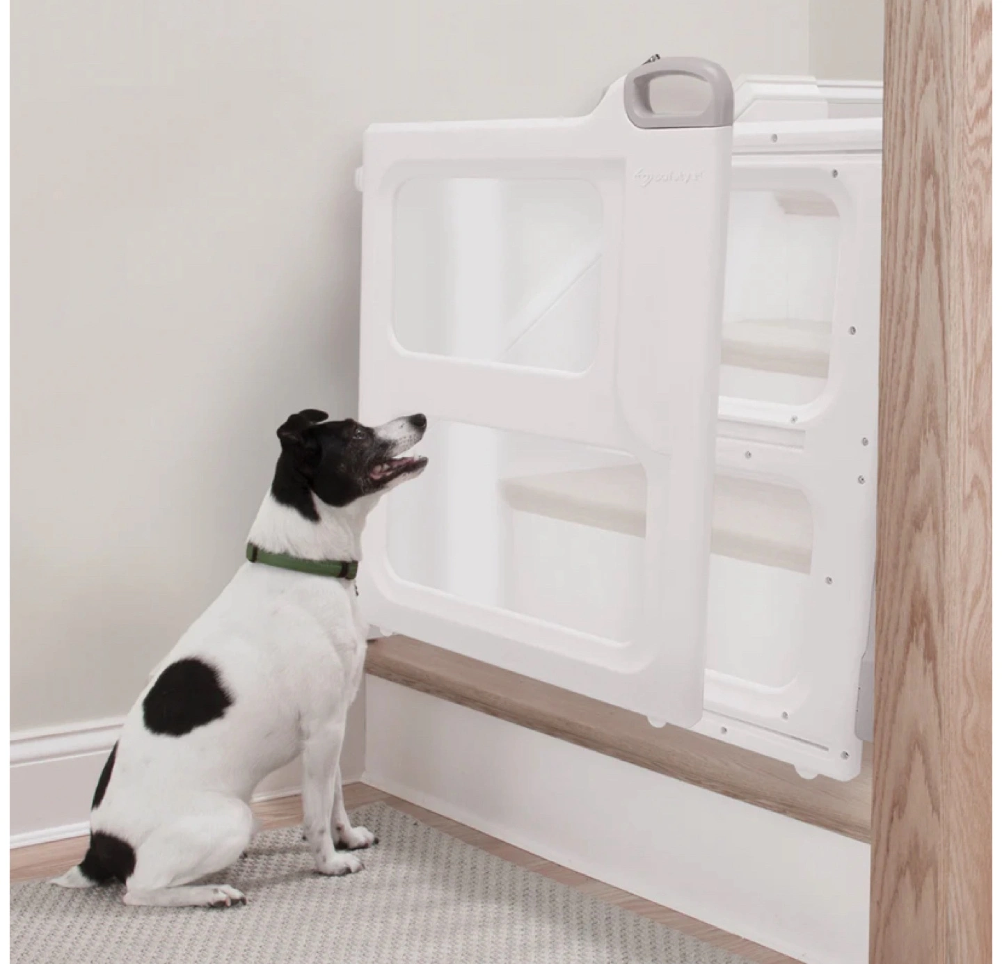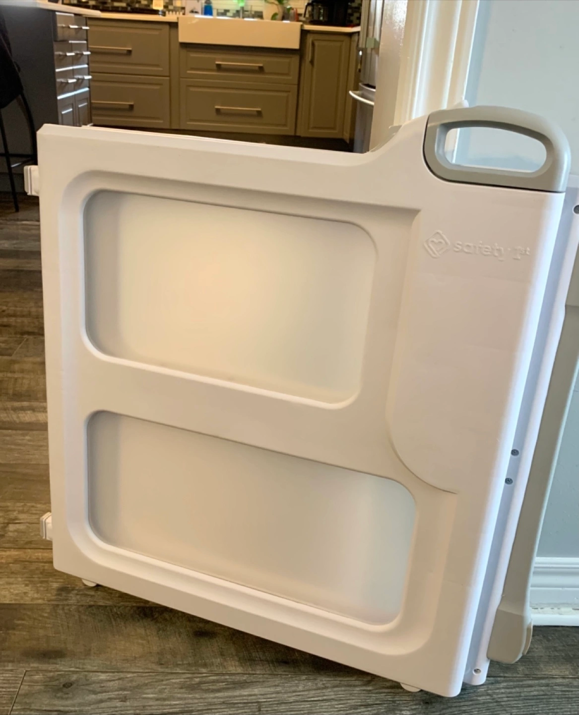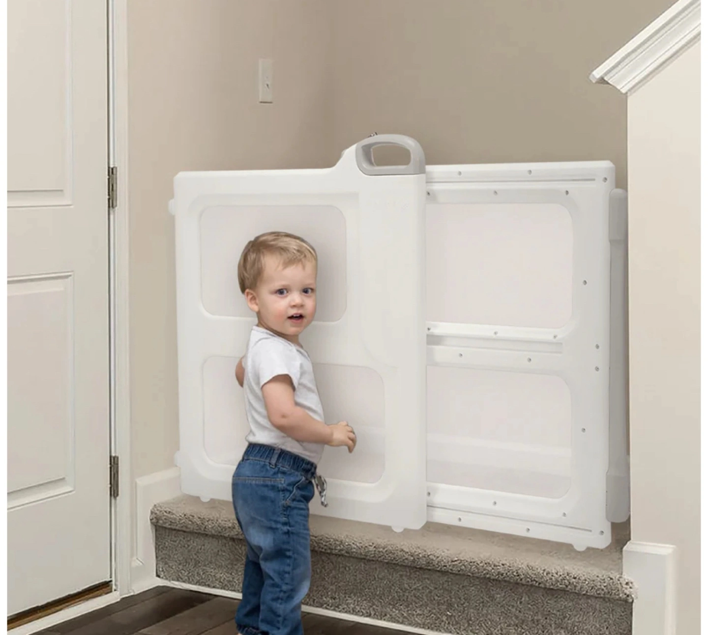 Adjustable width doorway gate, perfect for keeping children and pets safe. Features a handle and a sturdy design, with transparent panels. A great addition to any home, offering peace of mind.