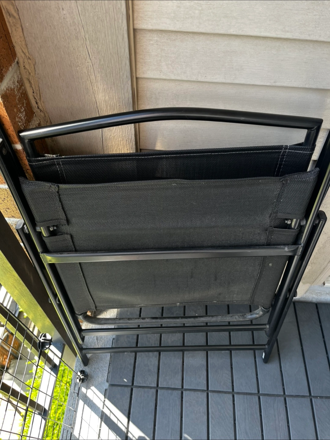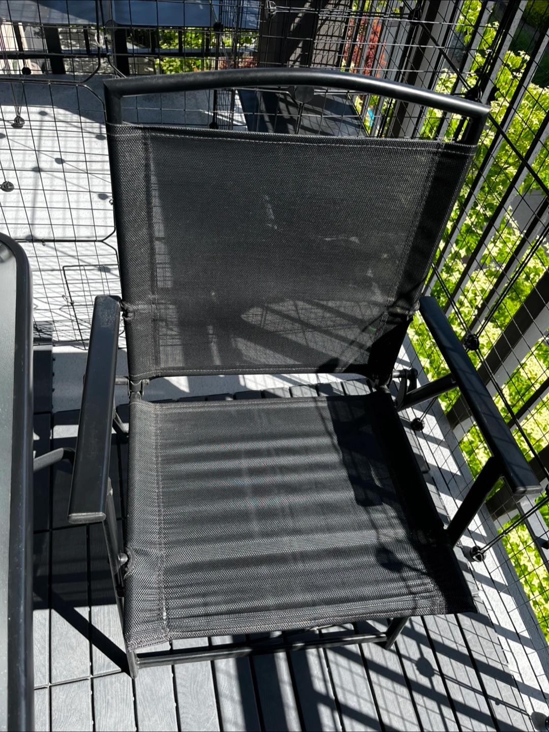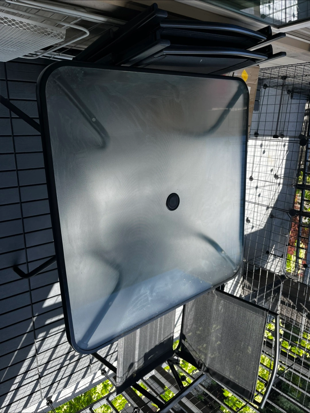Table with a glass top, set upon a metal frame. Includes four black mesh foldable chairs, with metal frames.