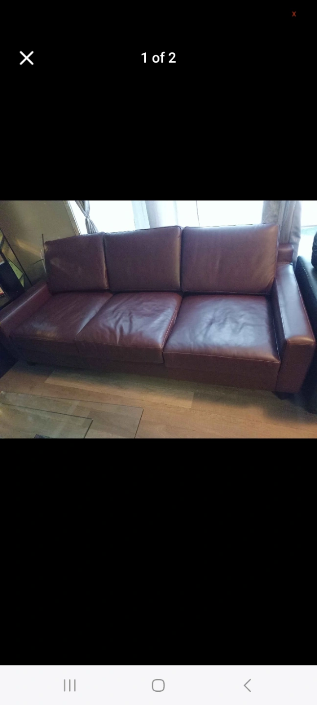 Sofa in a beautiful burgundy/brown colour. Cushioned seating. Could be a great addition to your living room, providing a comfortable place to relax after a long day.