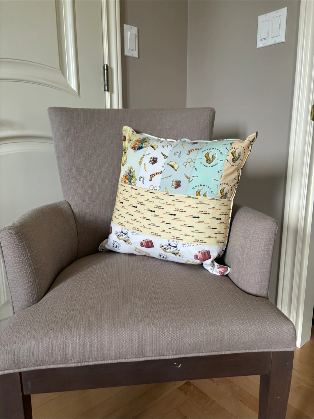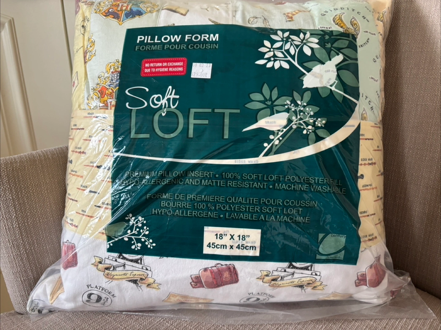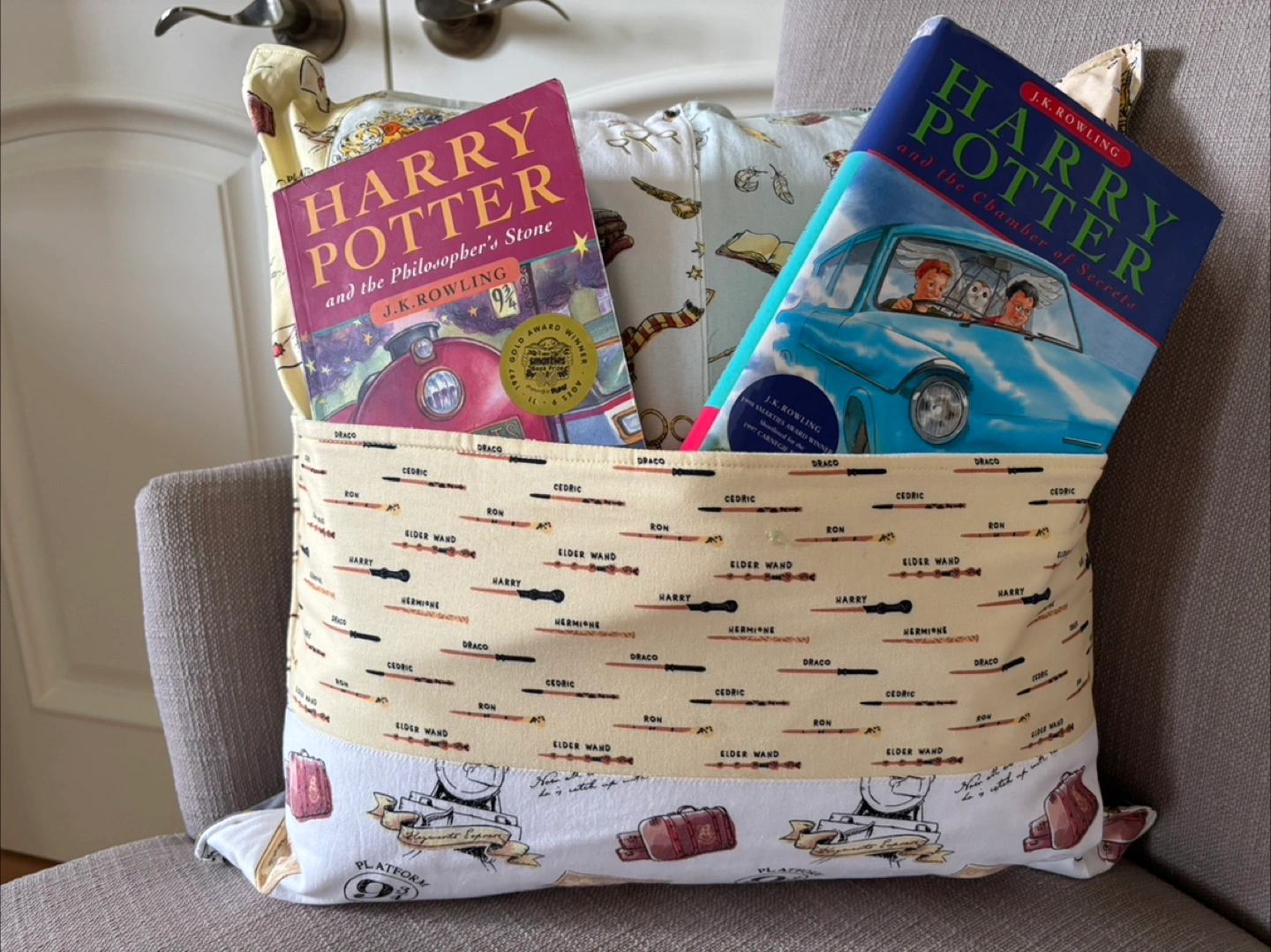 Pillow in several patterns. Decorated with various Harry Potter images. Pocket at the front to hold books. A comforting addition to your reading nook. Books not included. Pillow form cost $29.00 (this is without pillow covering) Zipper at the back. Pillow case only - $15.00.