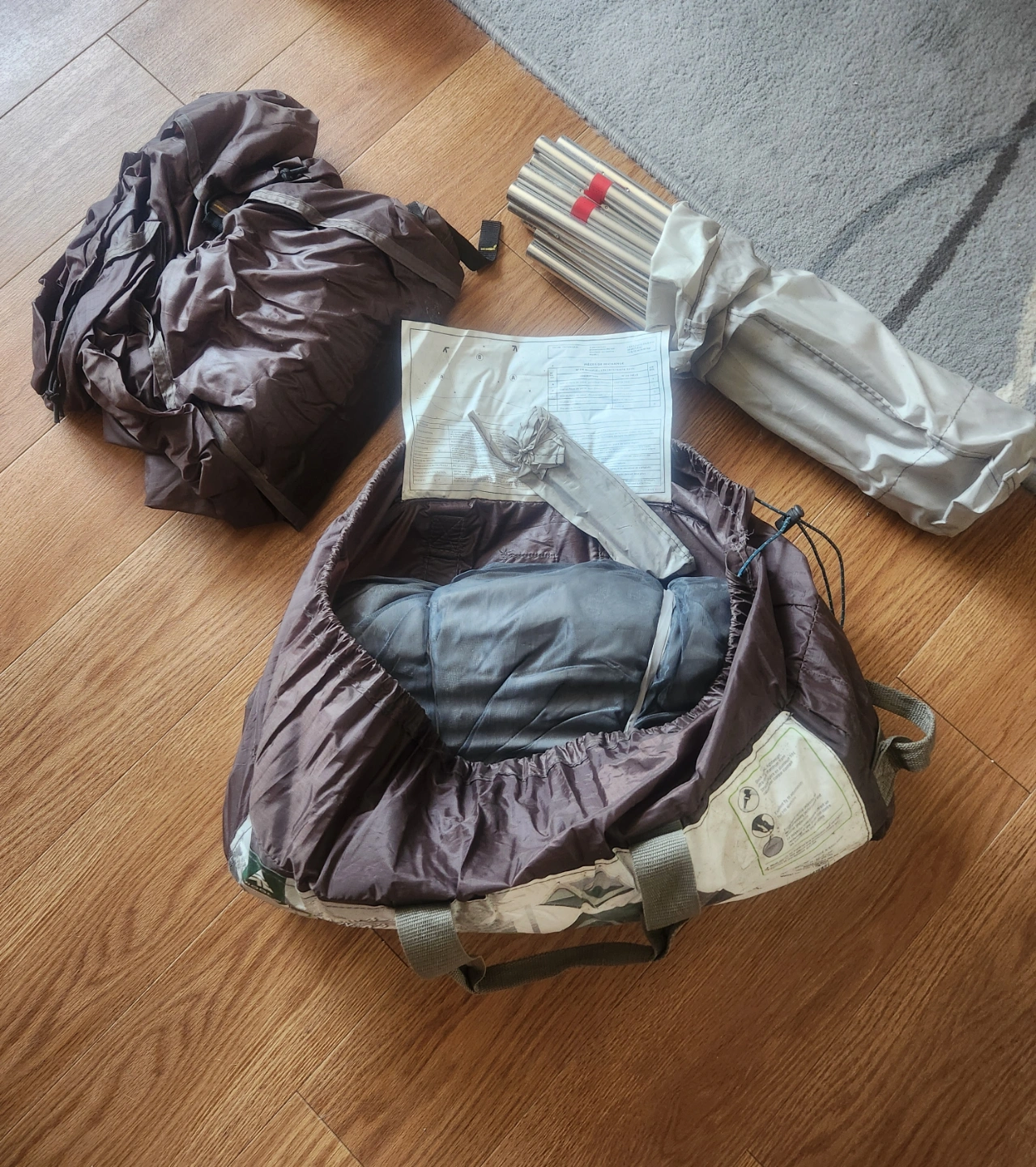 Camping tent in a carry bag. Has a rain fly. Includes tent poles.