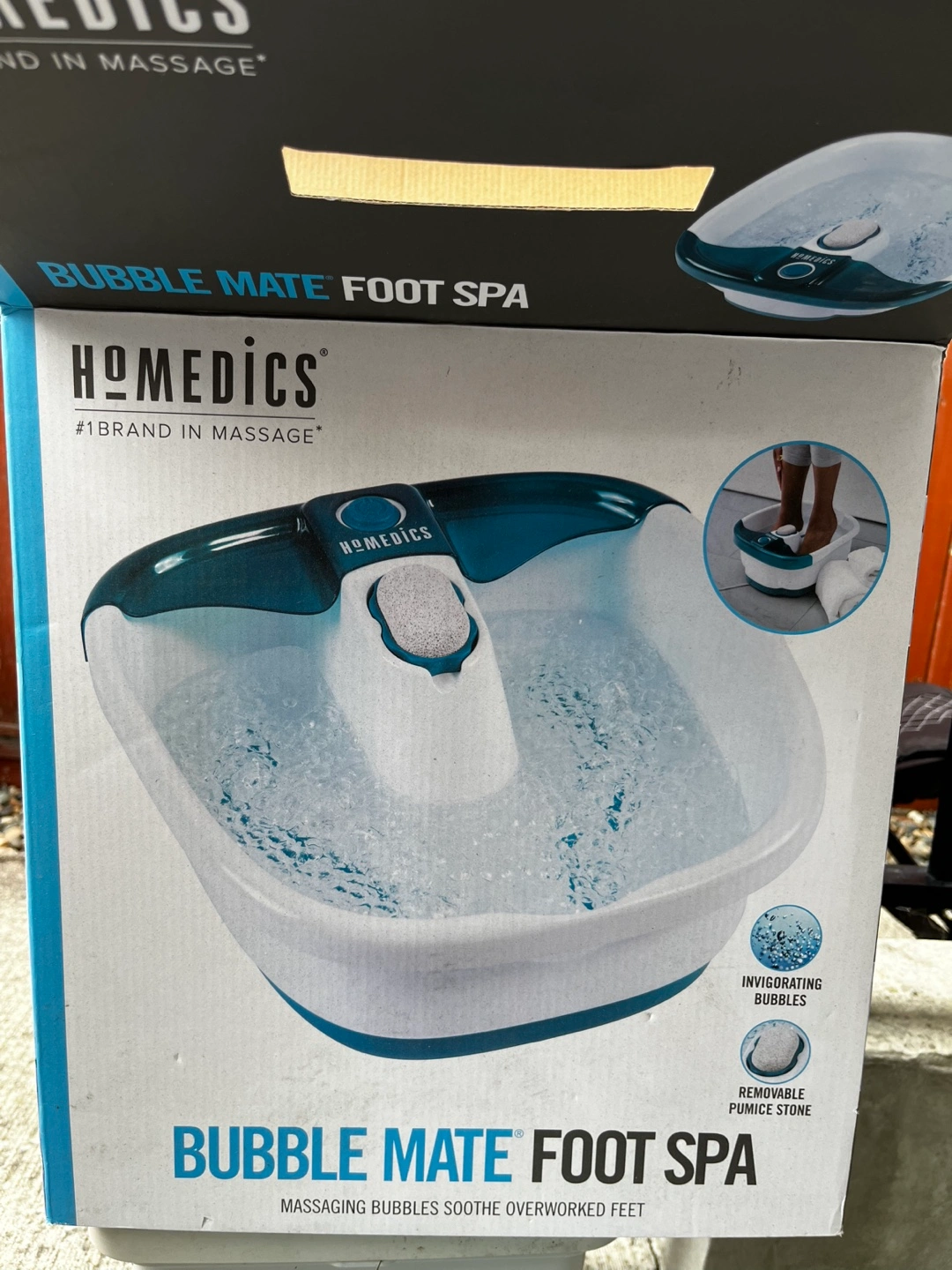 Buy & SellHoMedics Bubble Mate Foot SpaHoMedics Bubble Mate Foot Spa$23In home foot spa, still in the packaging. Comes with a pumice stone and other accessories. A perfect way to relax and unwind after a long day.ConditionLike newBrandHoMedicsWHERE TO MEETStarbucksView MapSELLERverifiedVicaSunset1316 reviews0 chats·1 favorites·16 views