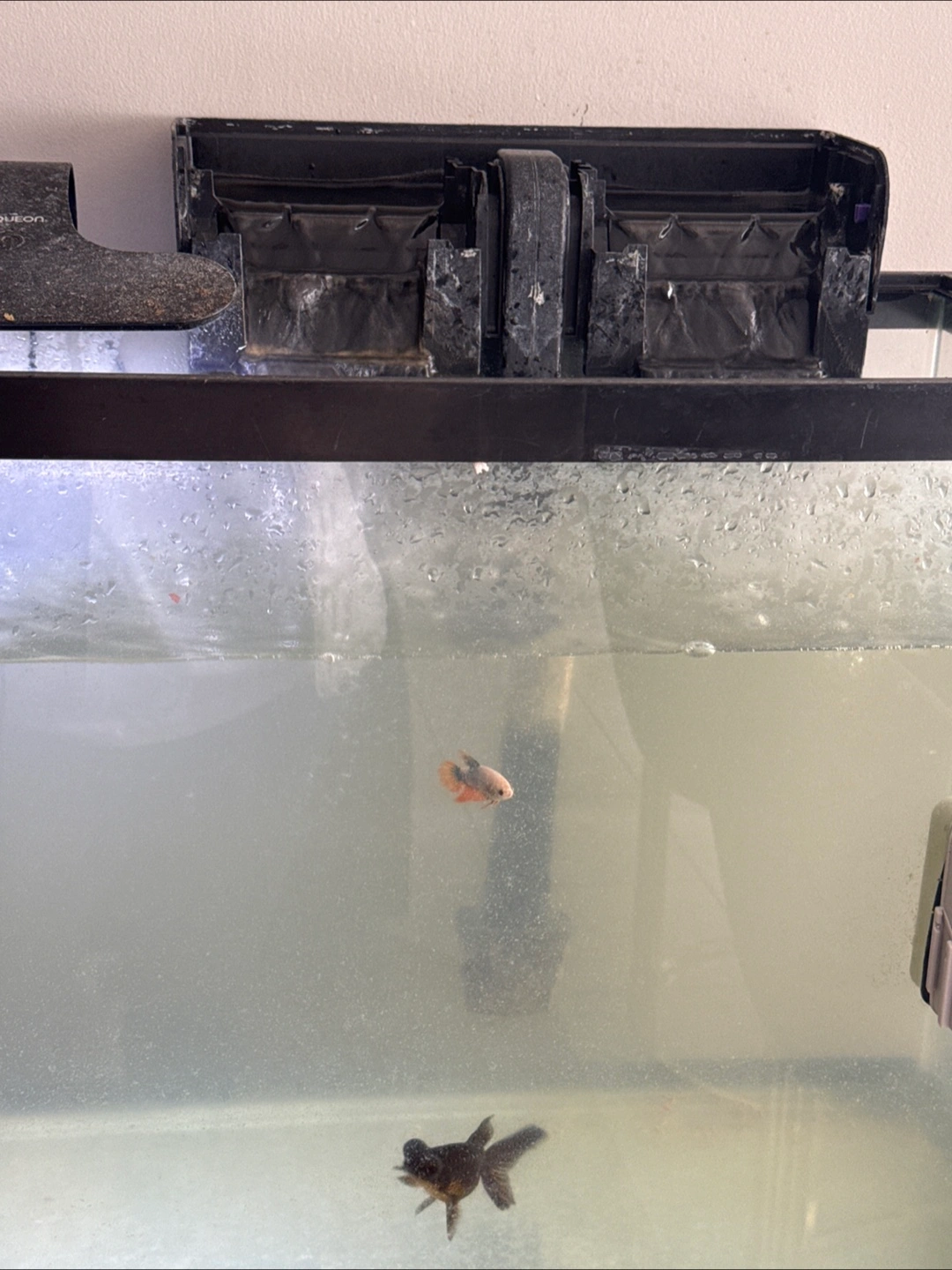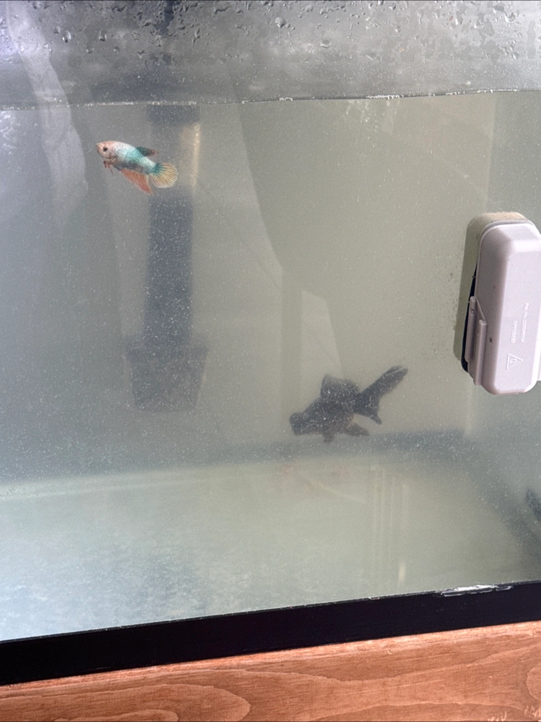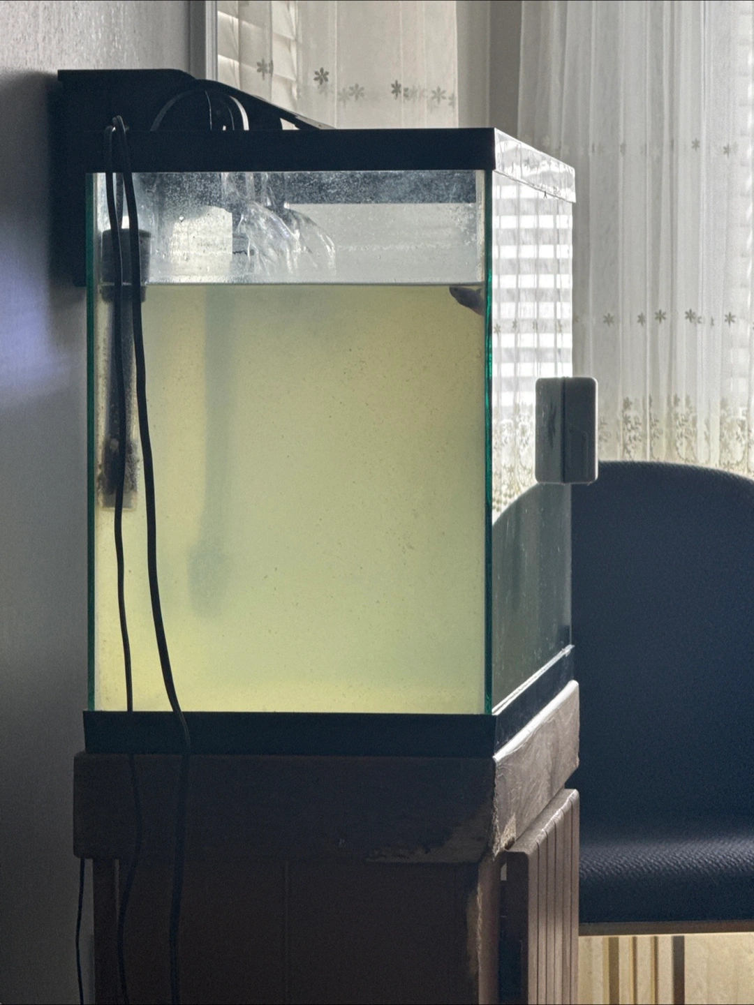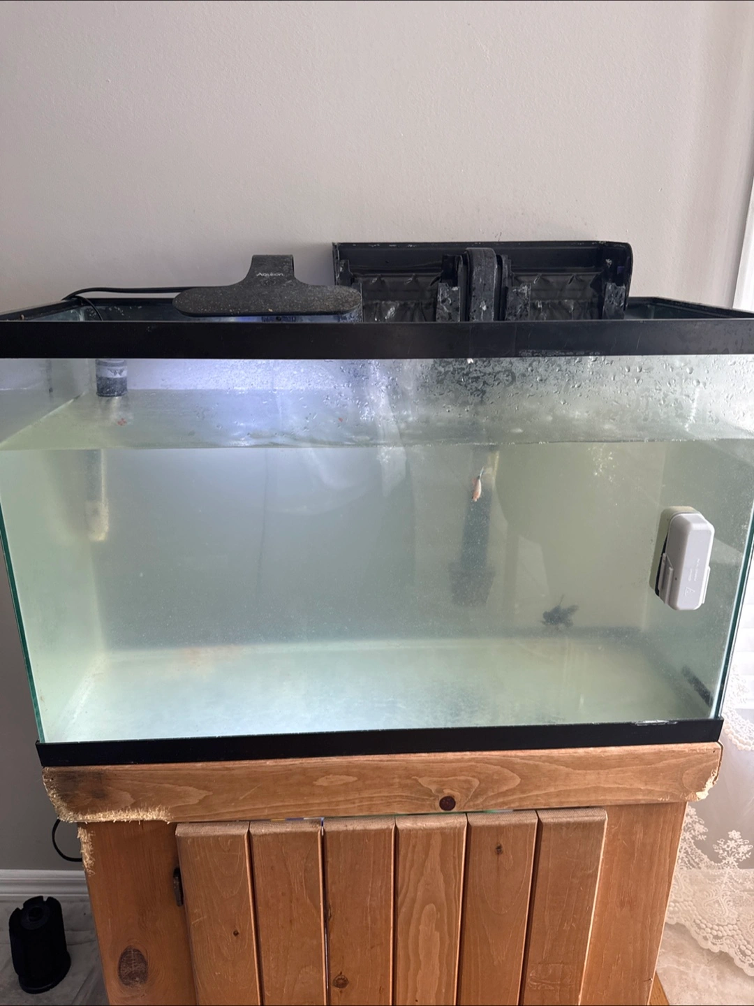 Rectangular glass tank. Includes a filter and a magnetic cleaner. Mounted on a wooden stand. Placing this in your home can be relaxing and help you unwind.
