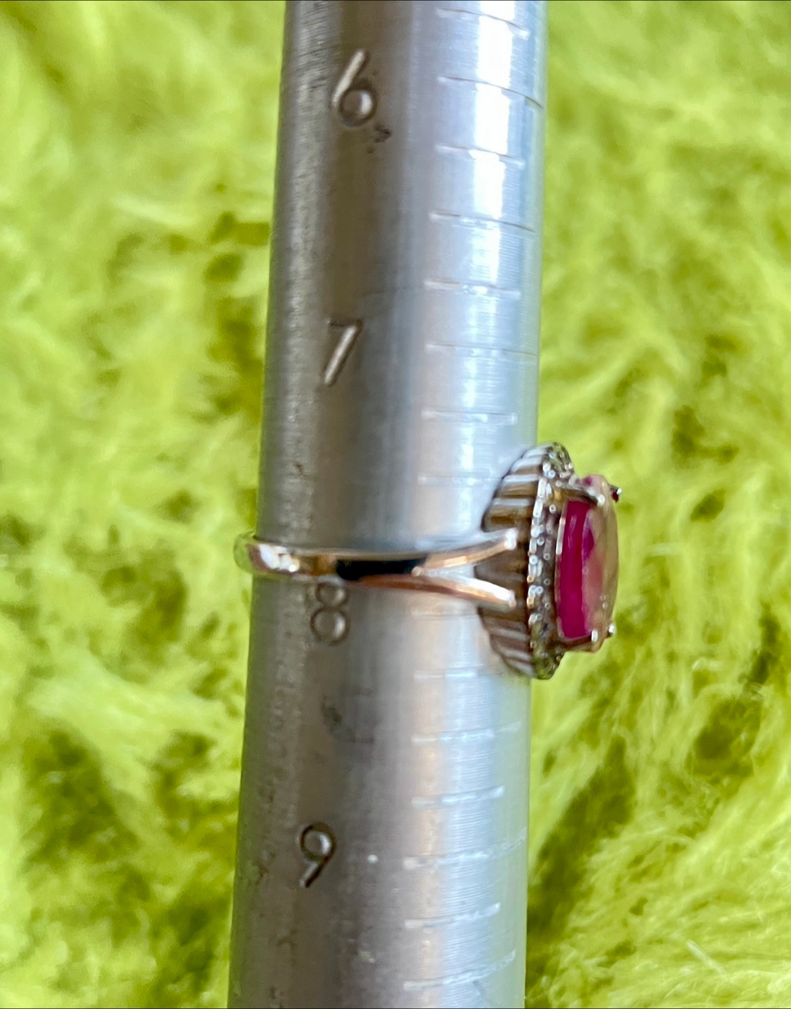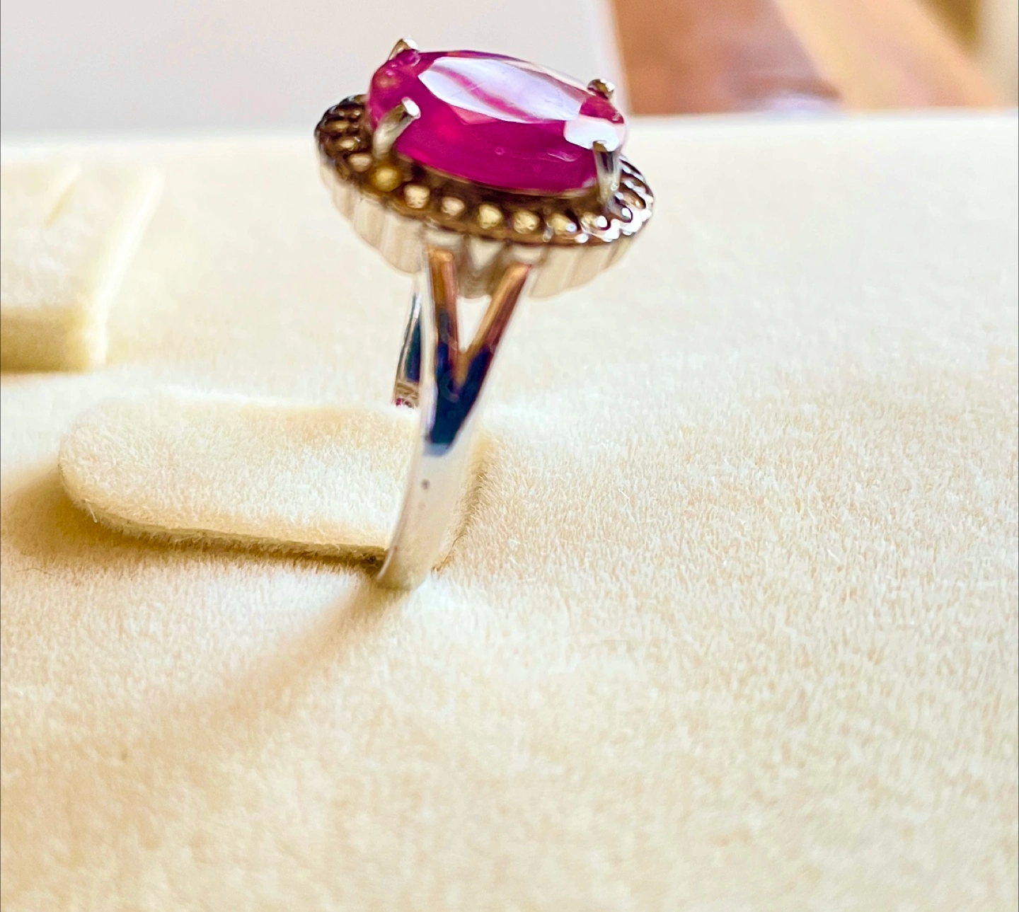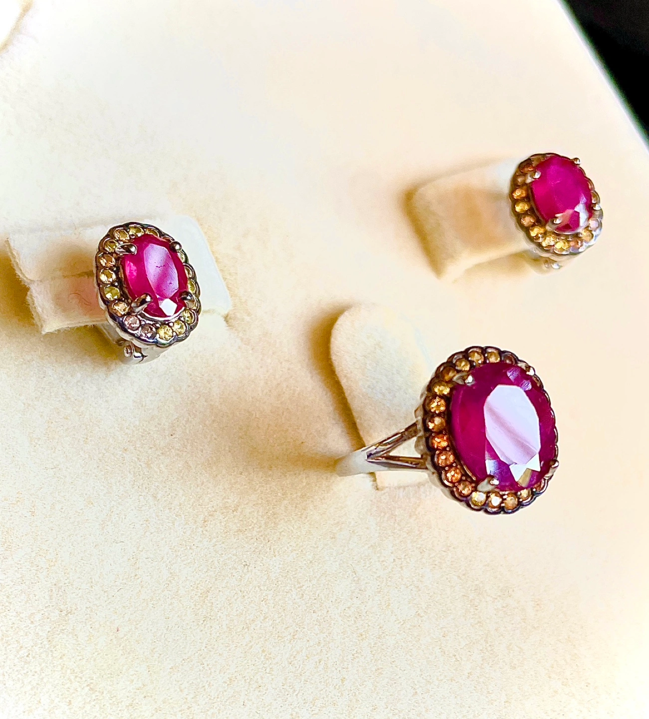 The set includes a Ring and a pair of Earrings. Both Main stone are Ruby surrounded by Yellow Sapphire .