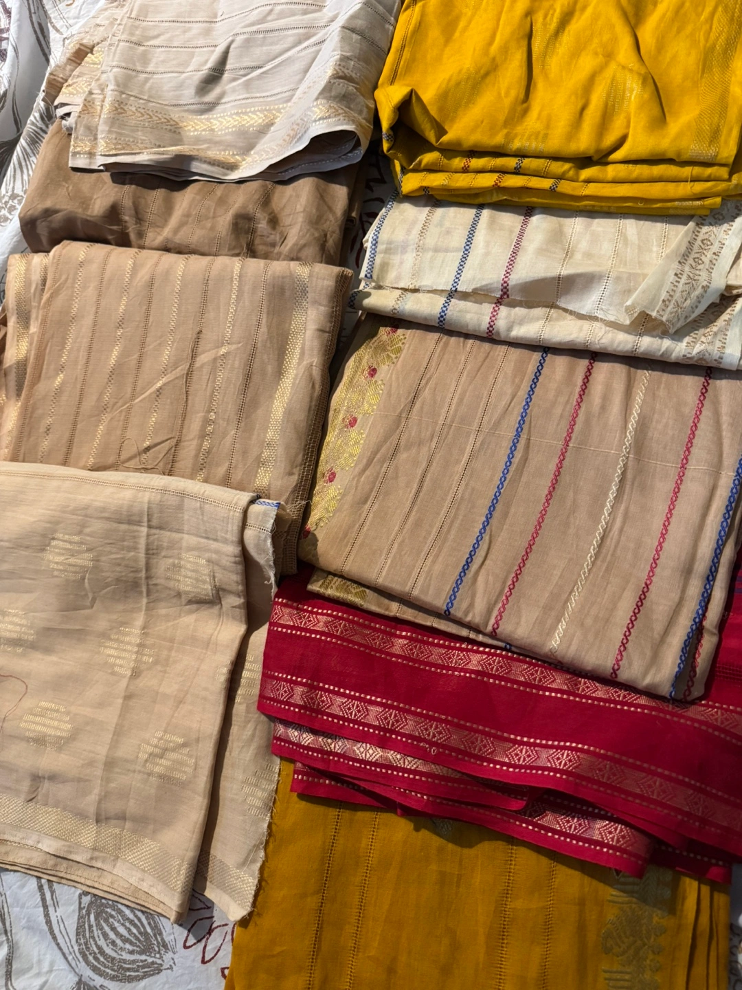 104Various textiles in different colours. Some appear to have patterned edges and stripes. You could make a soft, comforting pillow from some of these.