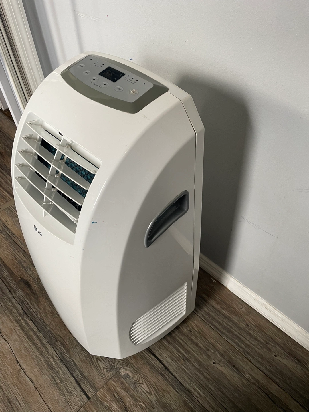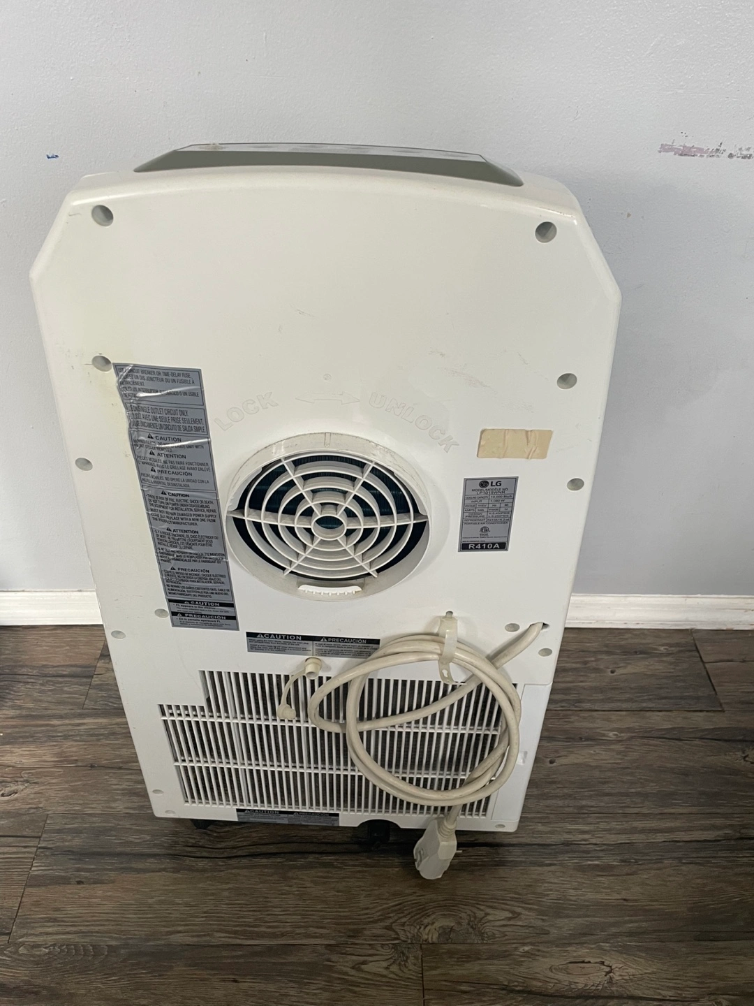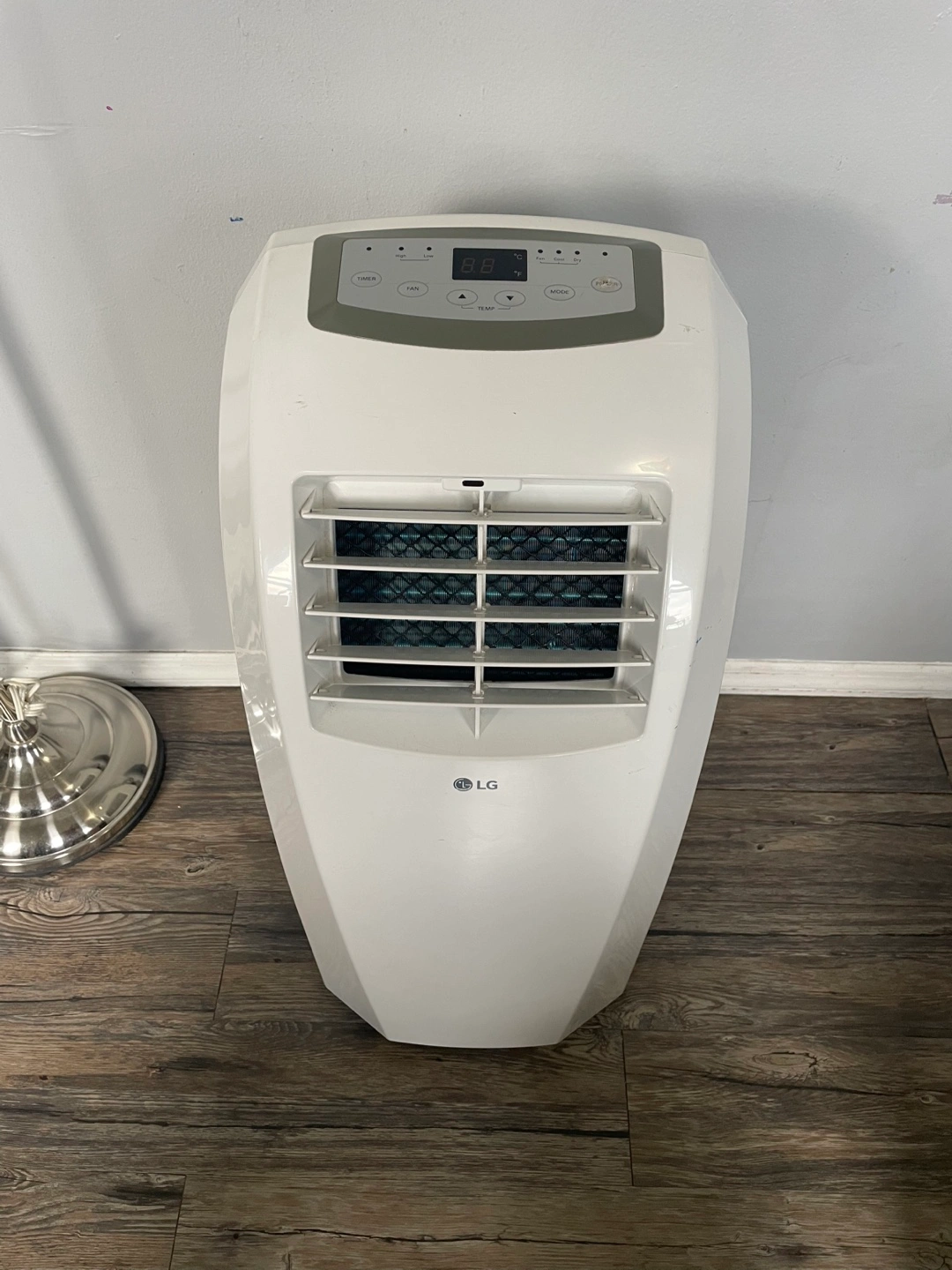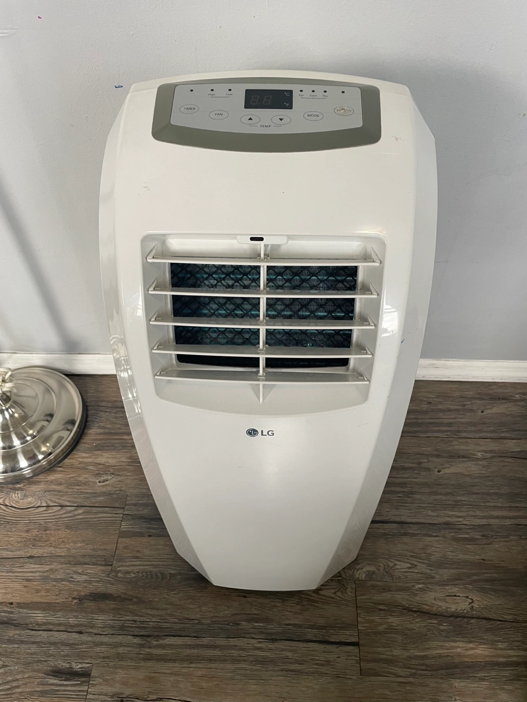 The LG LP1015WNR is a 10,000 BTU portable air conditioner with a dehumidification capacity of 2.6 pints per hour. It's designed for rooms up to 300 sq ft. The unit features a programmable 24-hour on/off timer, multiple fan speeds, and an auto cool function. It also includes a washable air filter and an included window installation kit.