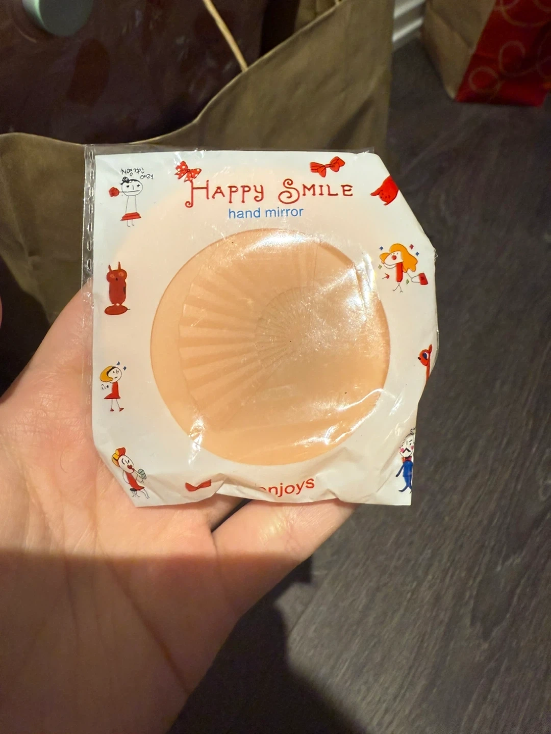 A sweet handheld mirror featuring a happy puppy design and a small pink handheld mirror. It's perfect for quick touch-ups on the go.