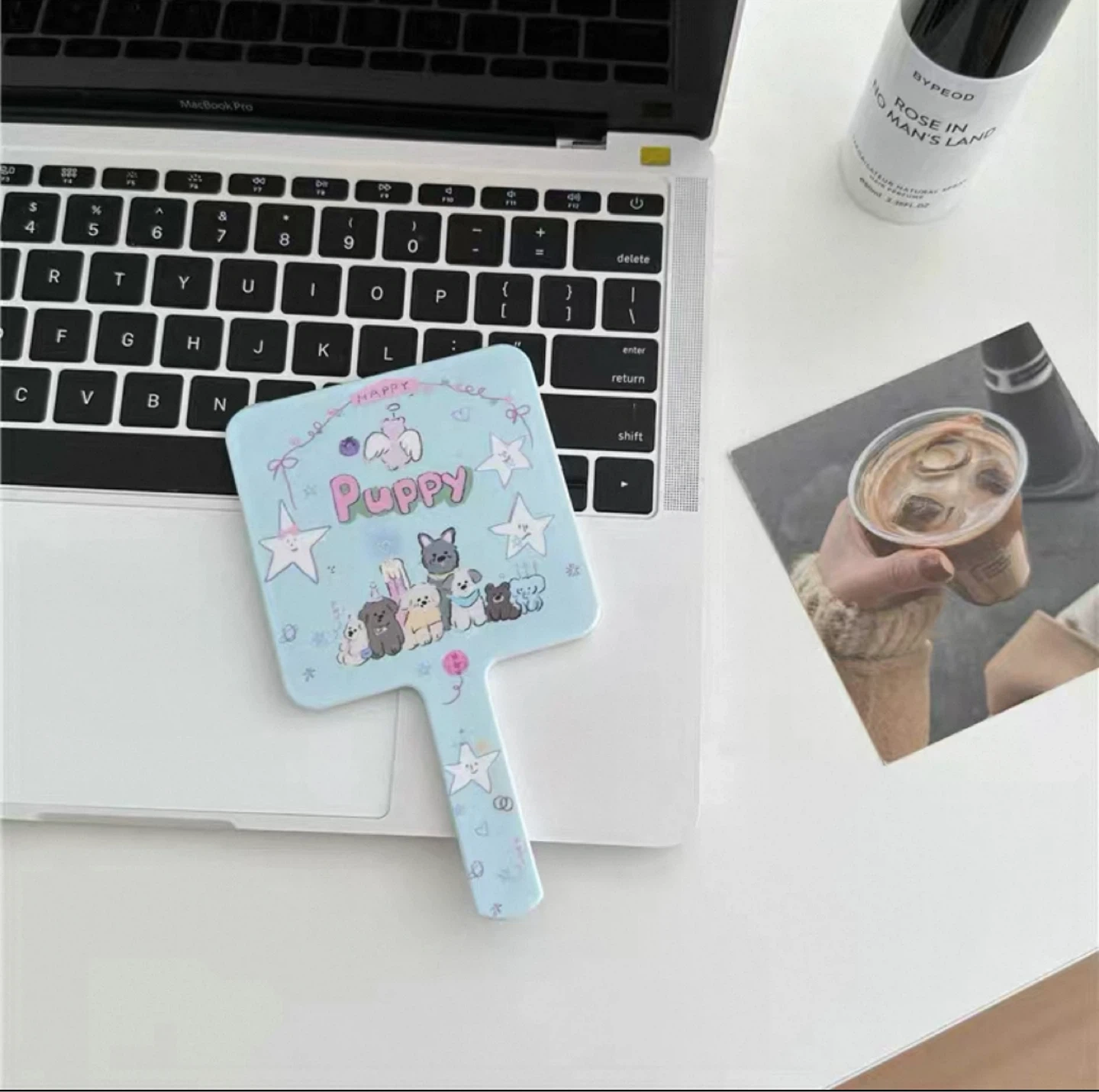 A sweet handheld mirror featuring a happy puppy design and a small pink handheld mirror. It's perfect for quick touch-ups on the go.
