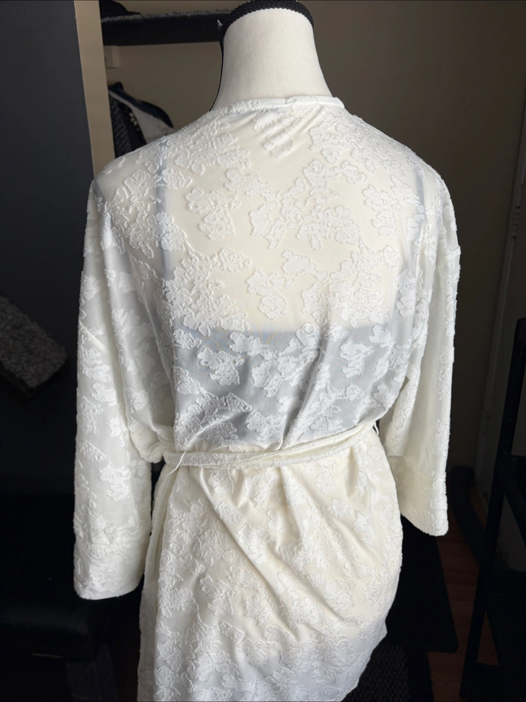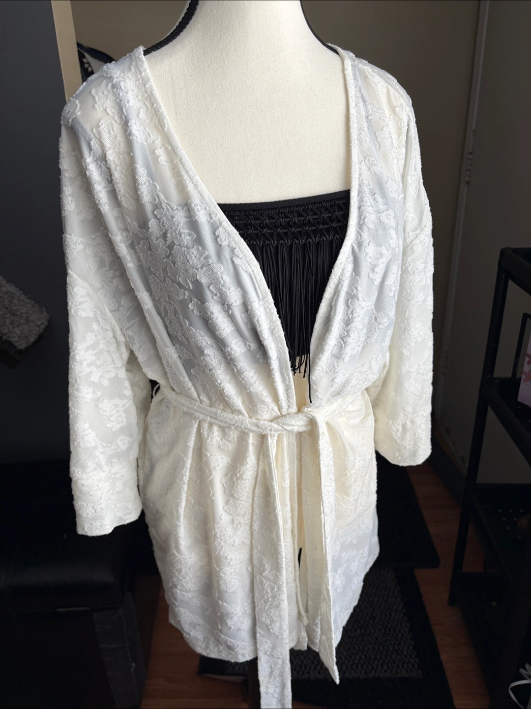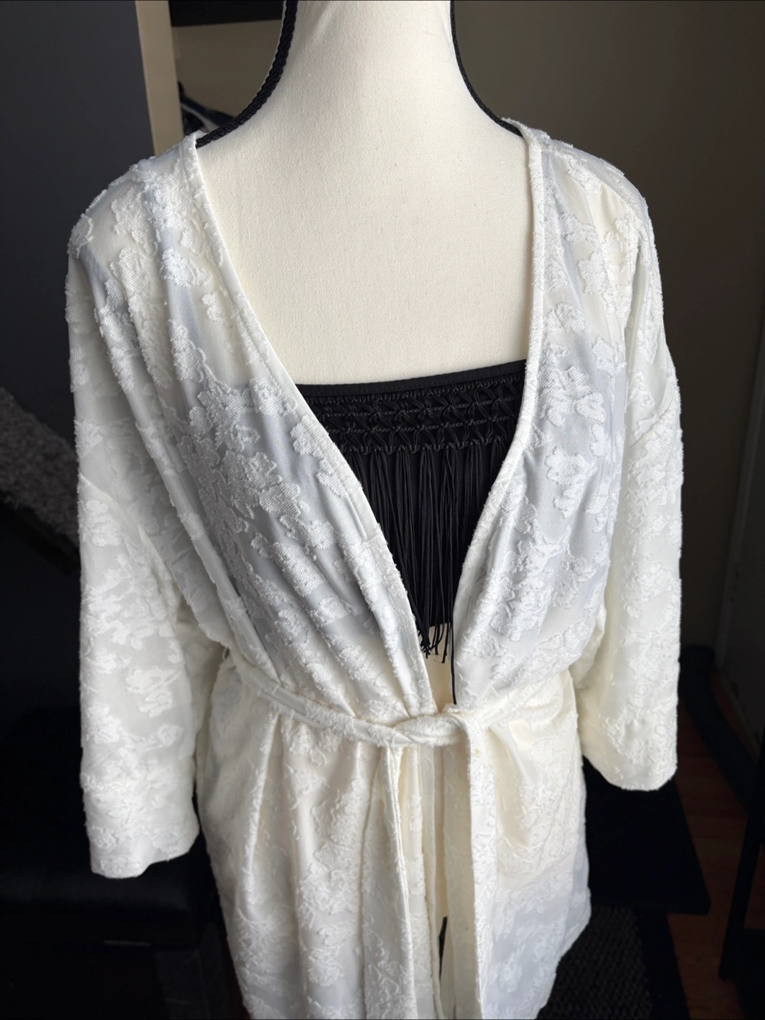 White kimono with waist tie. Patterned design. Long sleeves. Size M