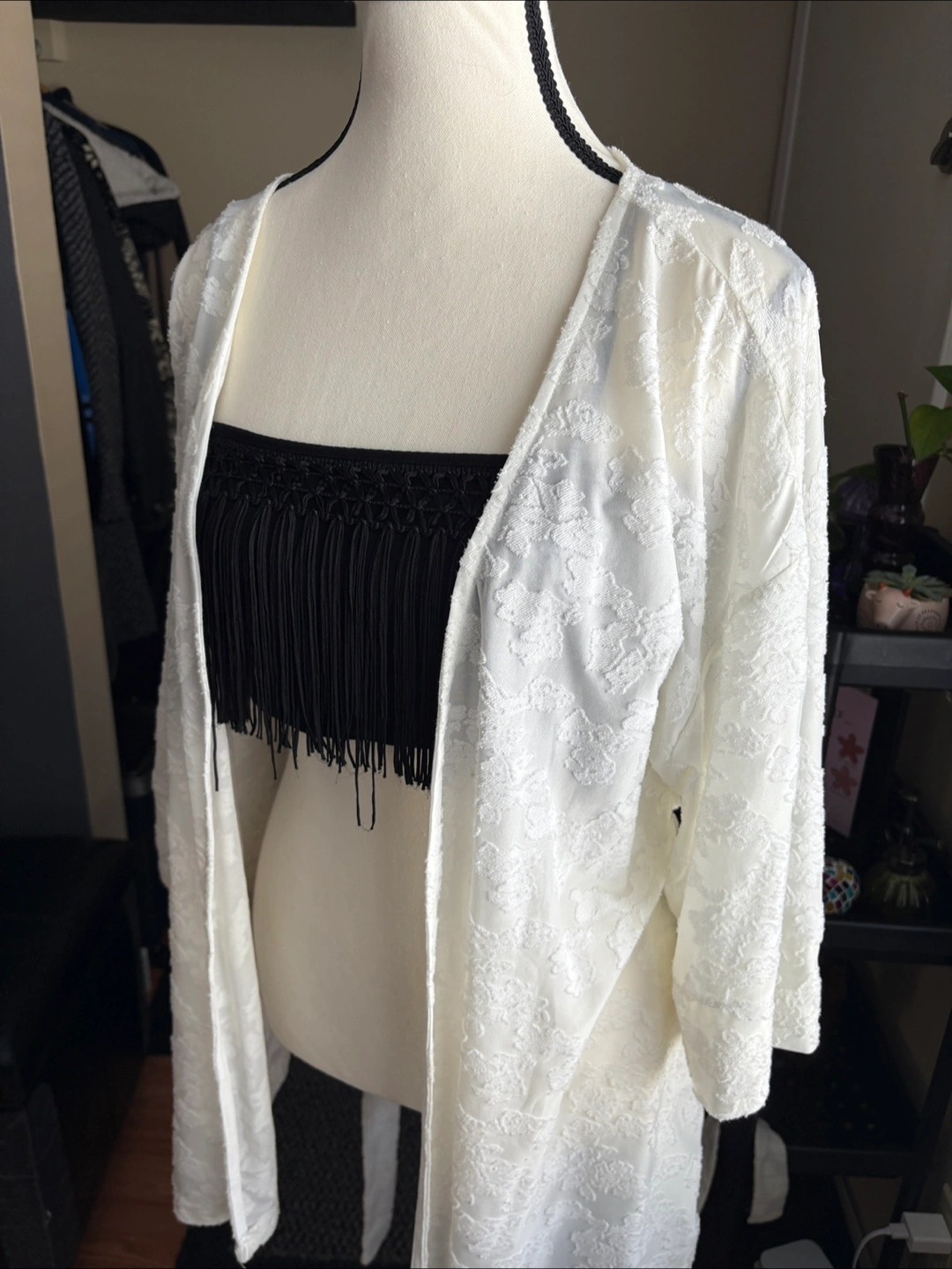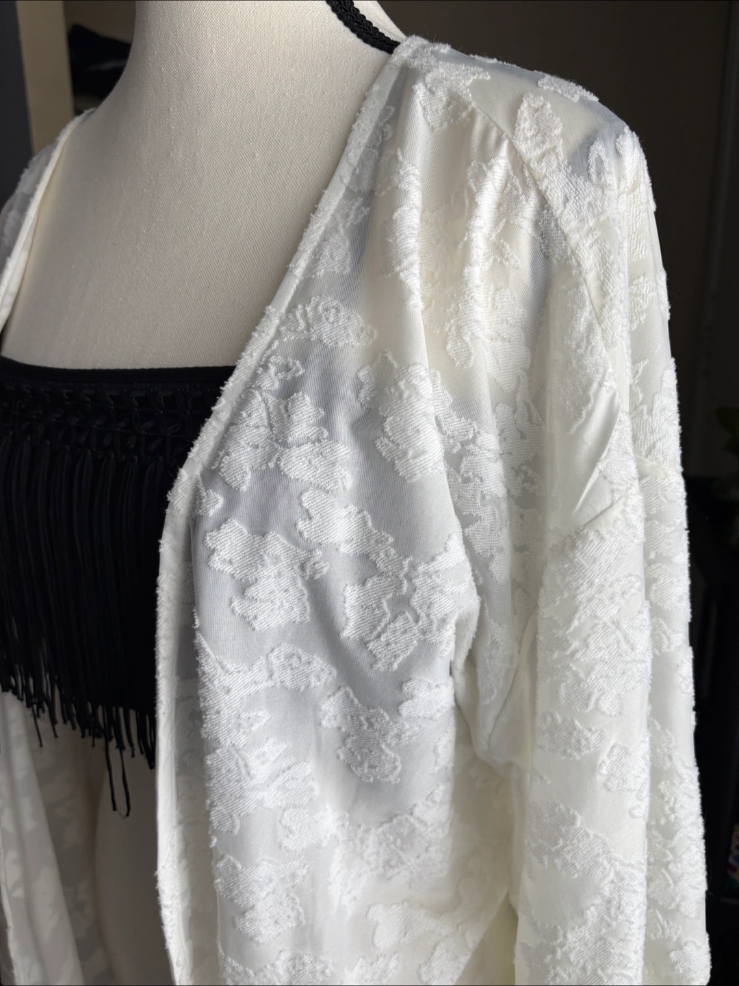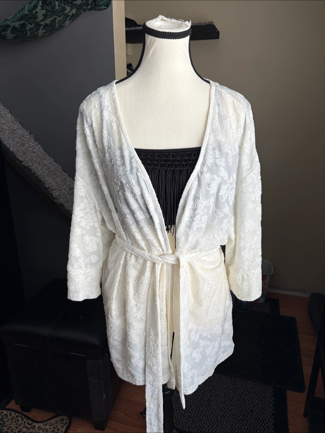 White kimono with waist tie. Patterned design. Long sleeves. Size M