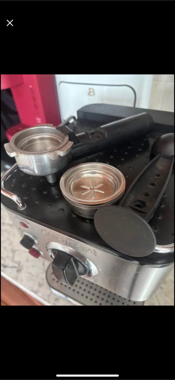 Espresso machine with stainless steel finish. Has a black knob and red lights. Can be a great way to starting your day peacefully. Includes all accessories.