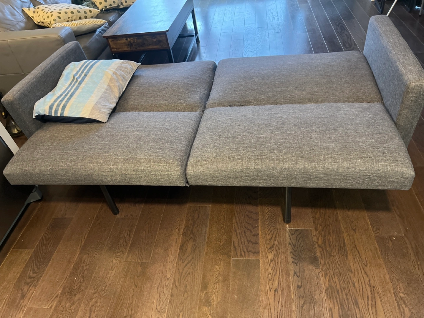 Gray fabric sofa. Can be used as a couch and a bed. A great addition to any room, making it ideal for a relaxing moment or a peaceful sleep.