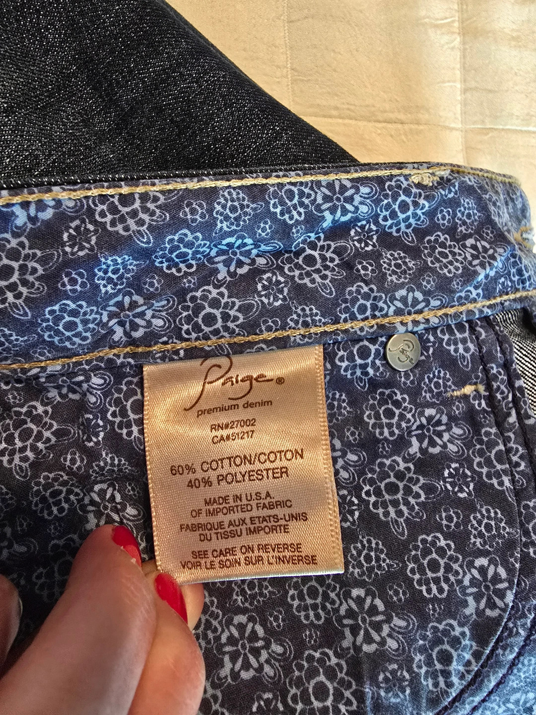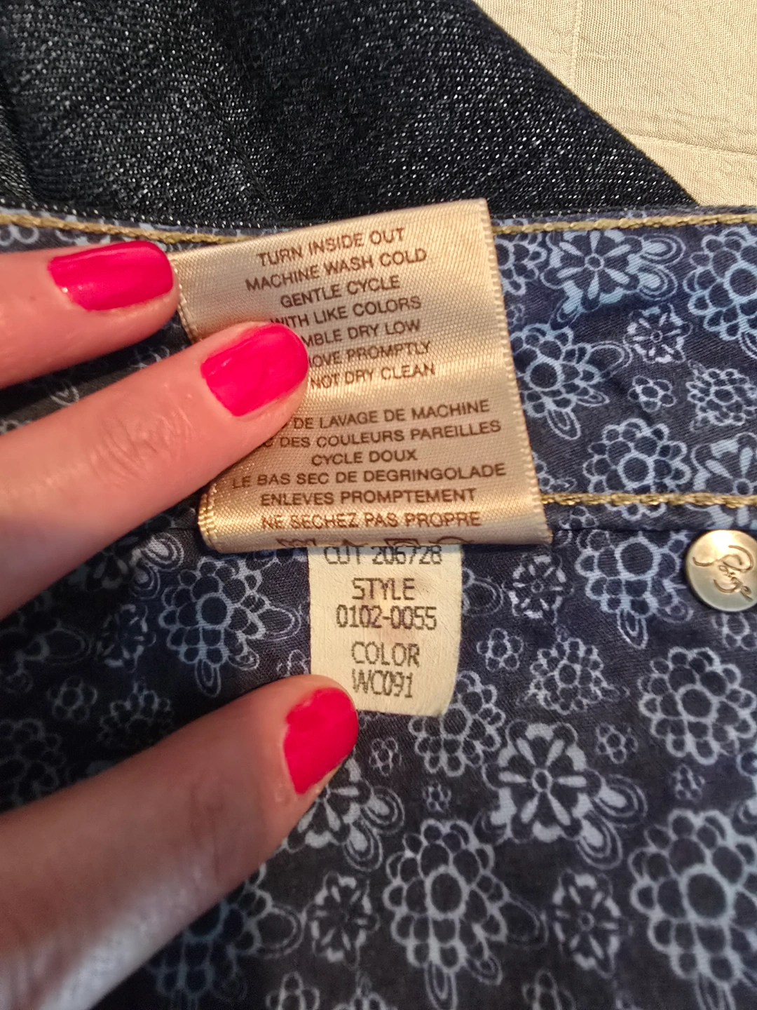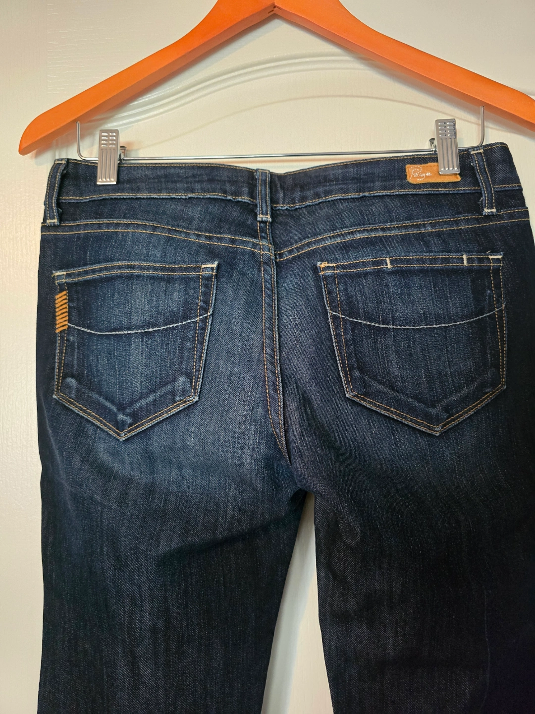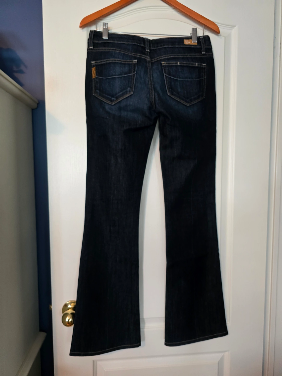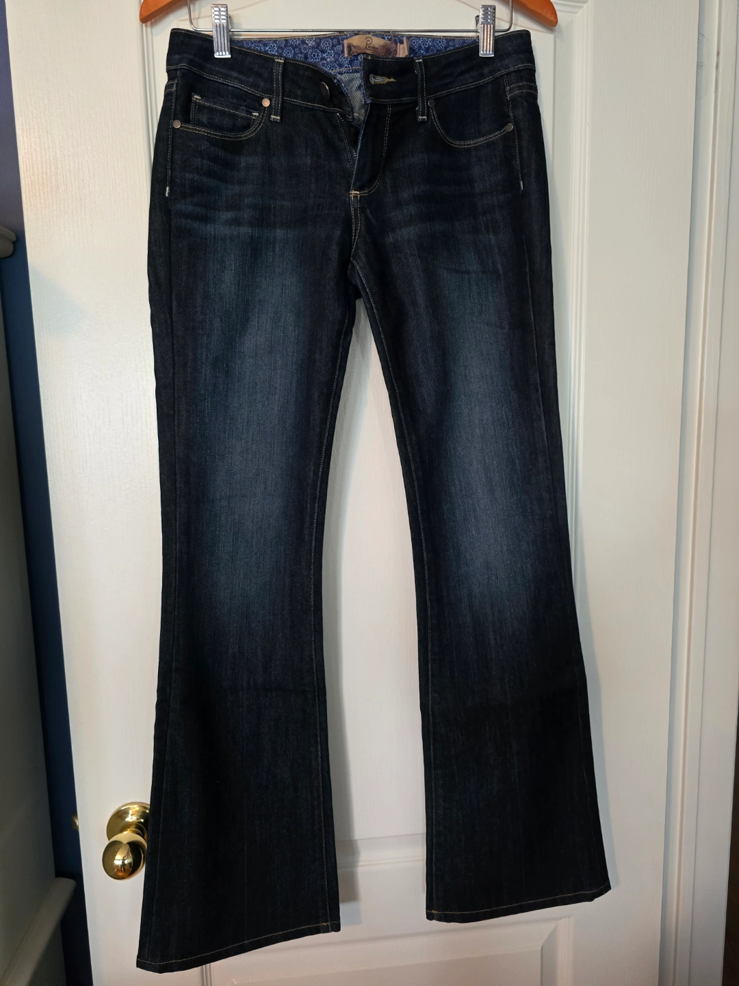 Dark wash jeans with a patterned interior. Has a bootcut design. Pair it with your favourite sweater and enjoy some downtime. these are lightly used, mint condition. Smoke free home. inseam 31.5 inches & rise is 7.5 inches