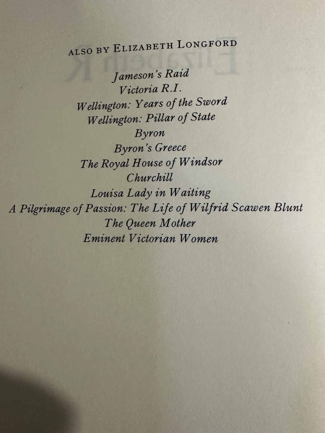 Features a biography of Elizabeth R. Cover art of a photo of Elizabeth. Additional books by Elizabeth Longford are listed. A perfect book for a relaxing afternoon.