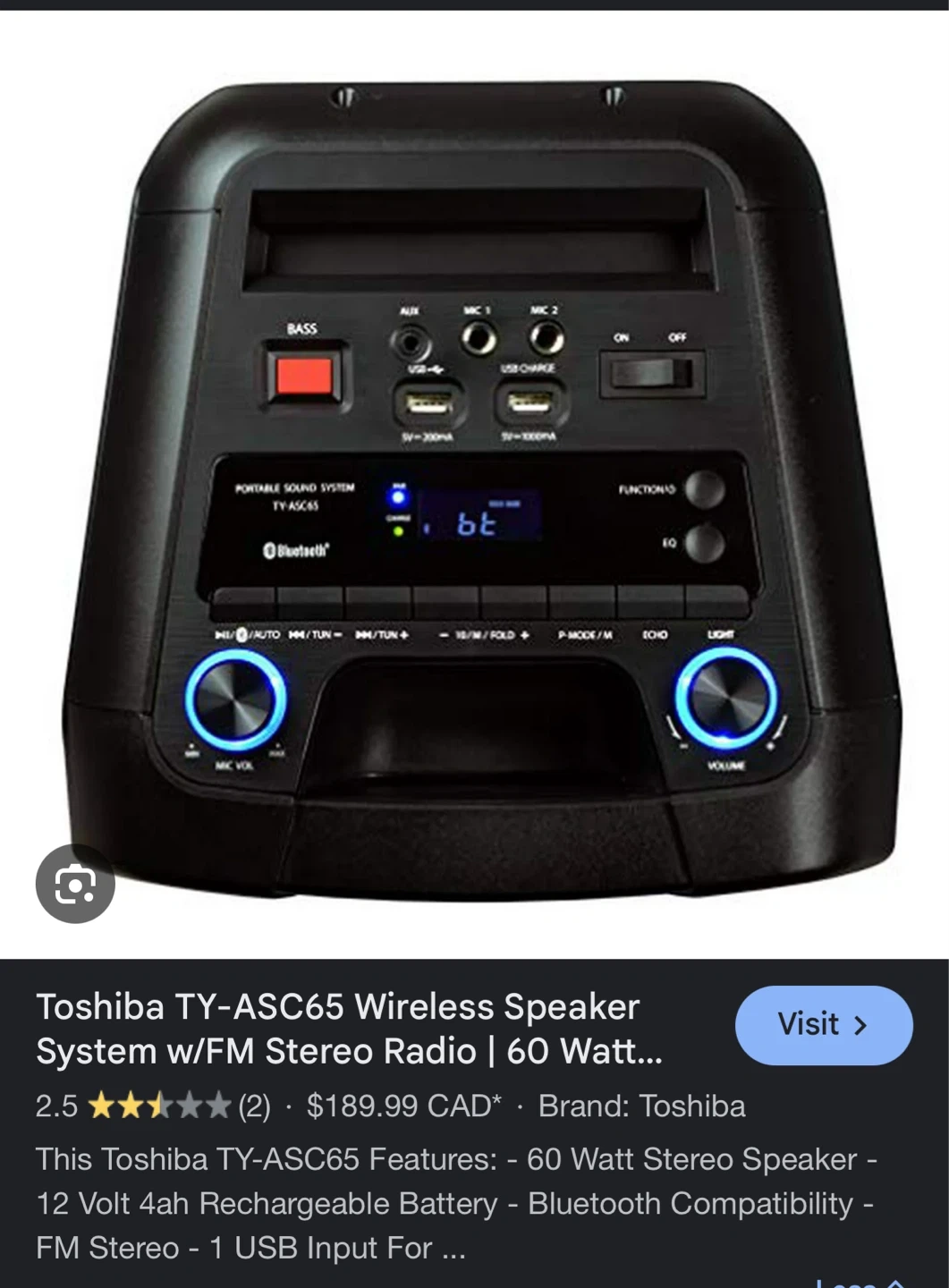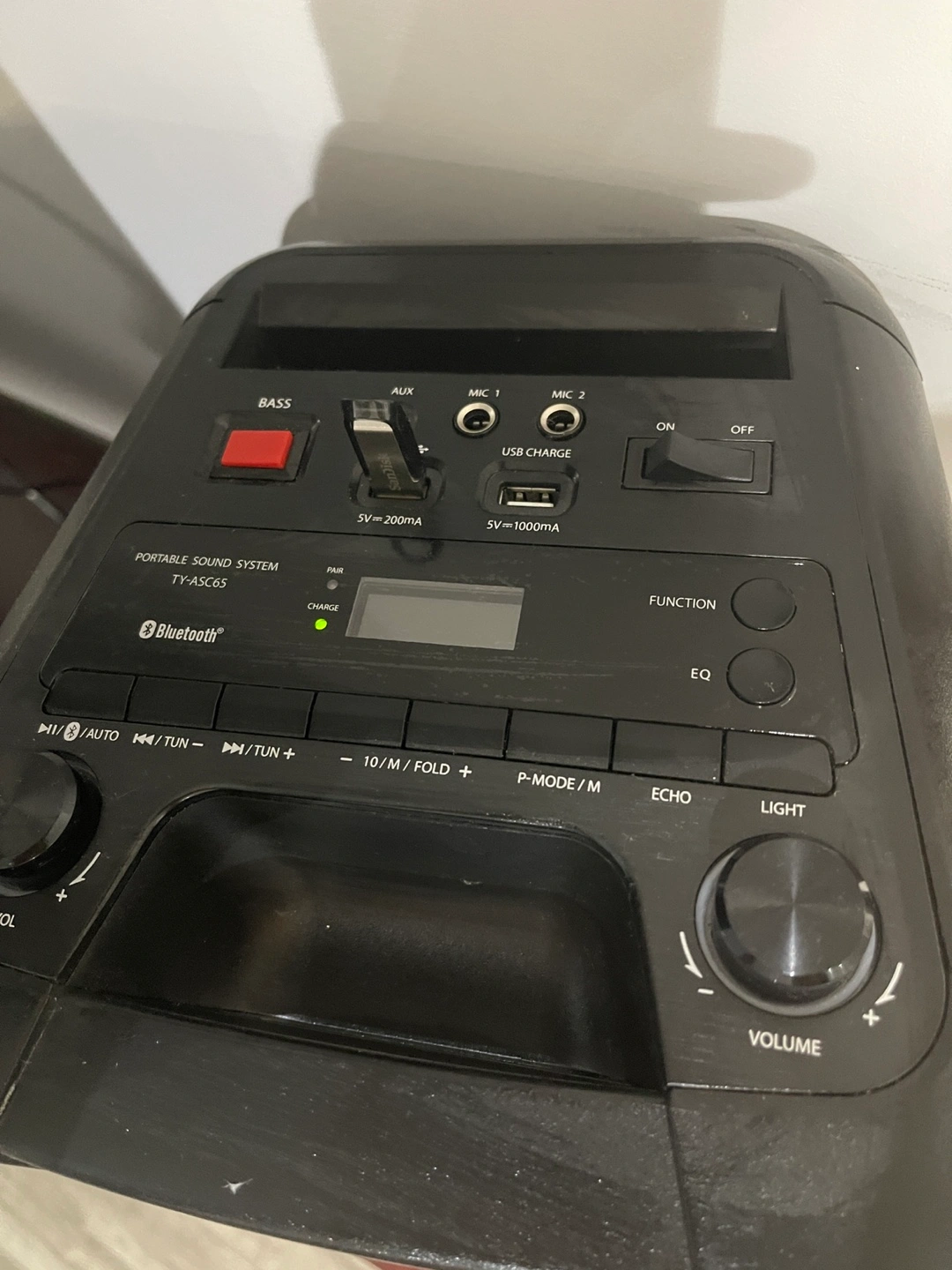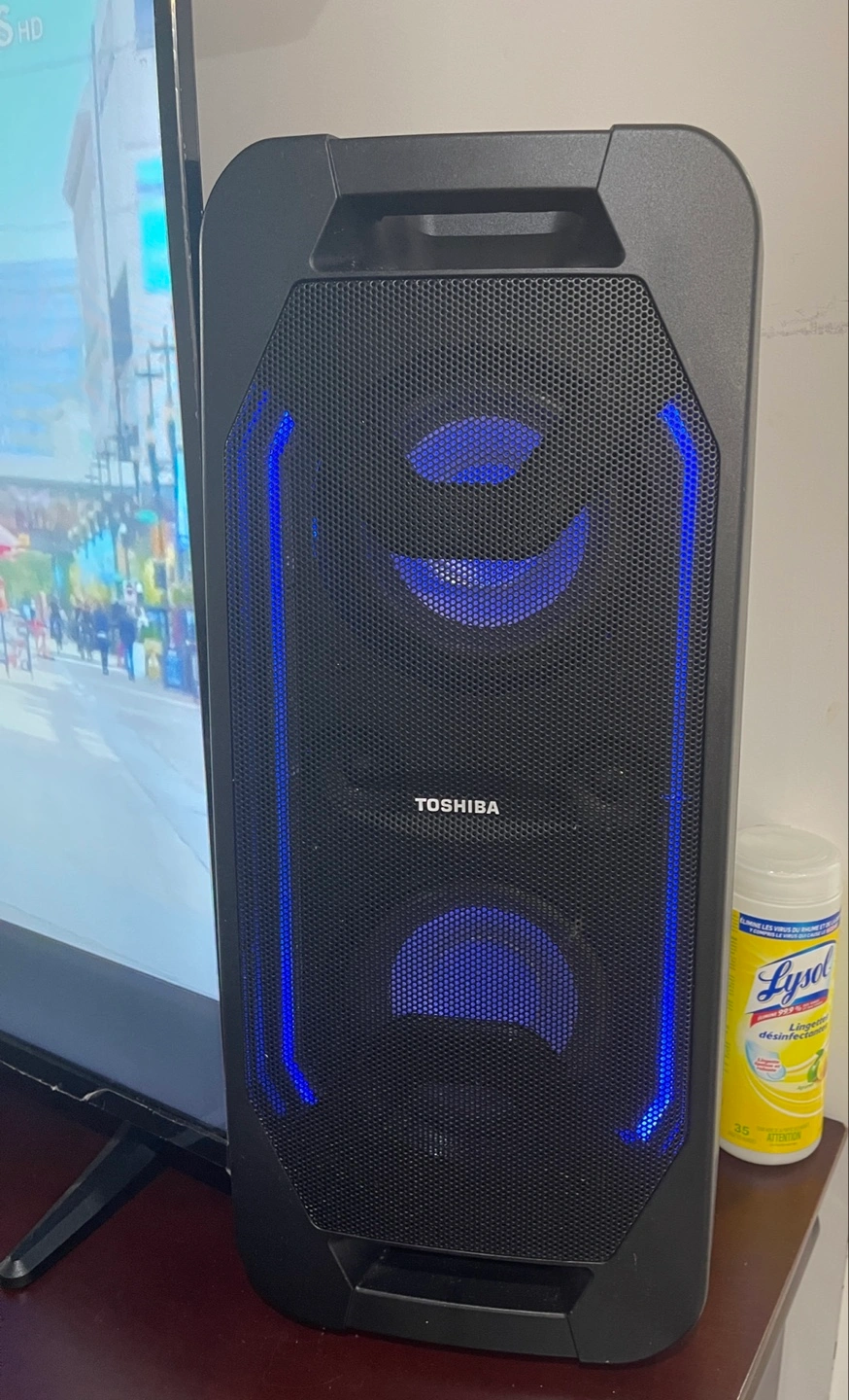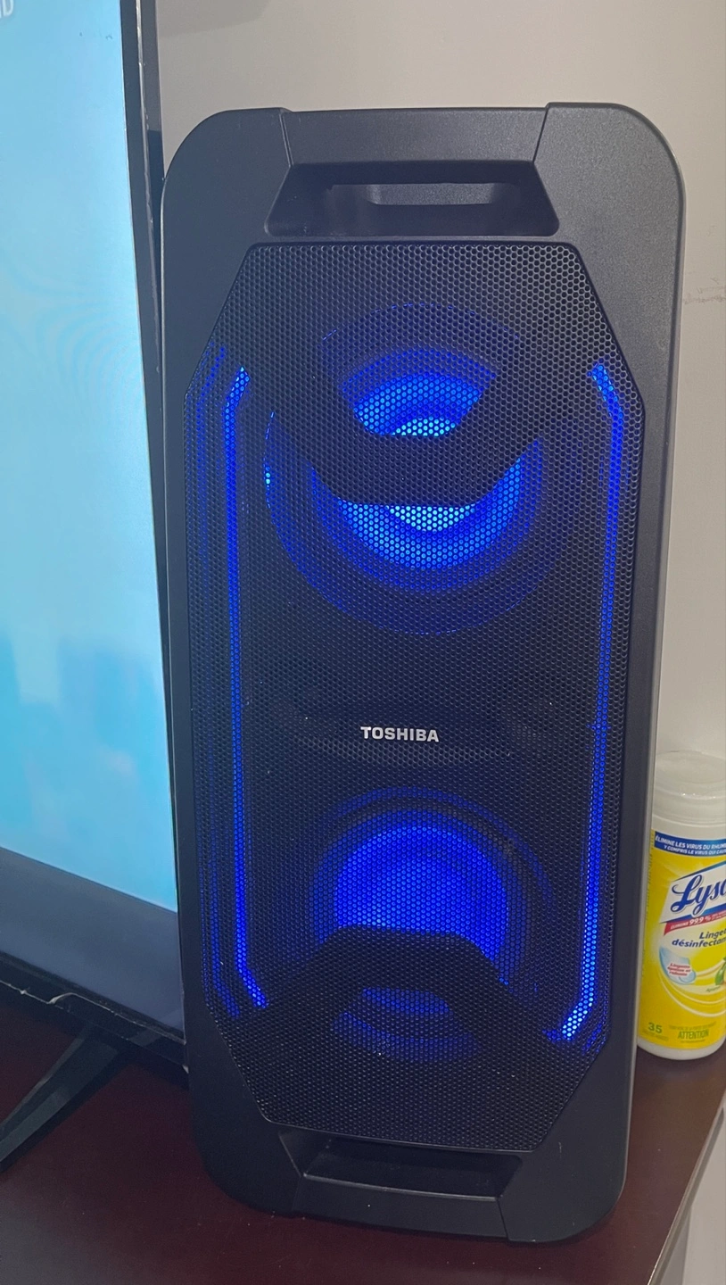 83Black speaker. Handle at the top. Features different colour lights. Has different control buttons with Bluetooth connectivity. This speaker is perfect for creating a chill atmosphere with your favourite music.