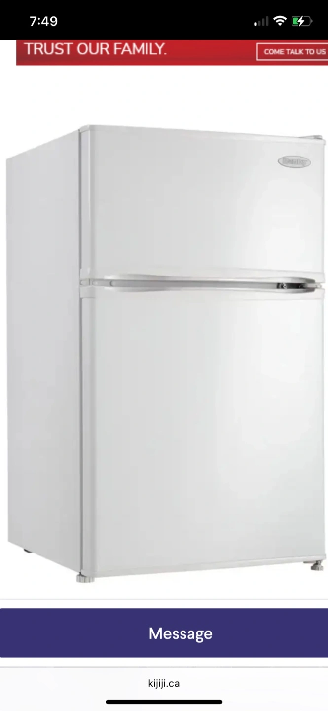 White compact refrigerator. Top freezer, and fridge compartment. Shelves and door storage. Consider this small appliance for extra food storage at your fingertips, it can ease your mind.