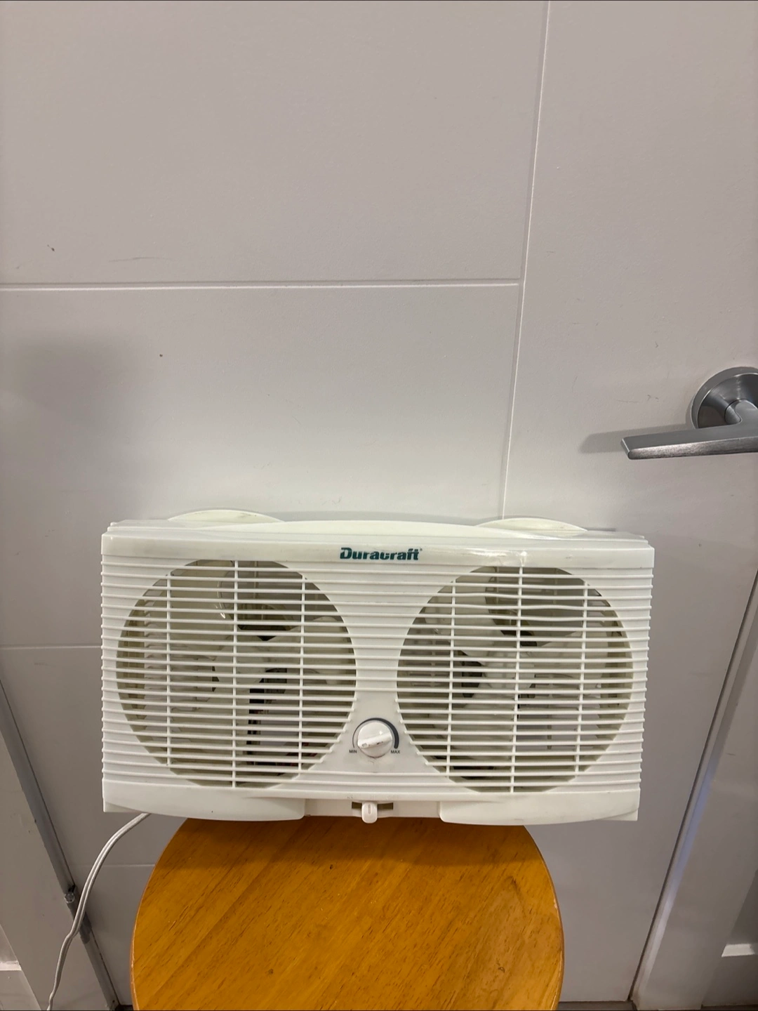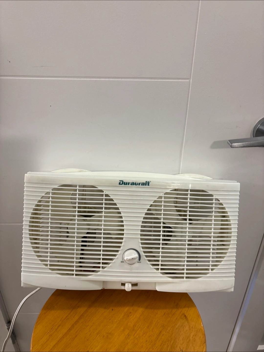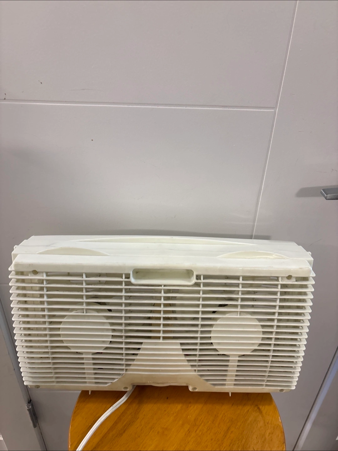 White window fan with two separate fans. Features a control knob and a handle. Can be used to create a peaceful breeze on a hot day.