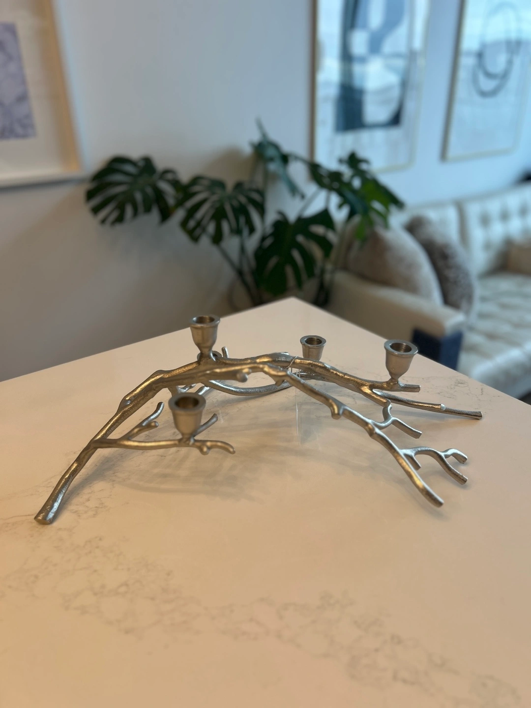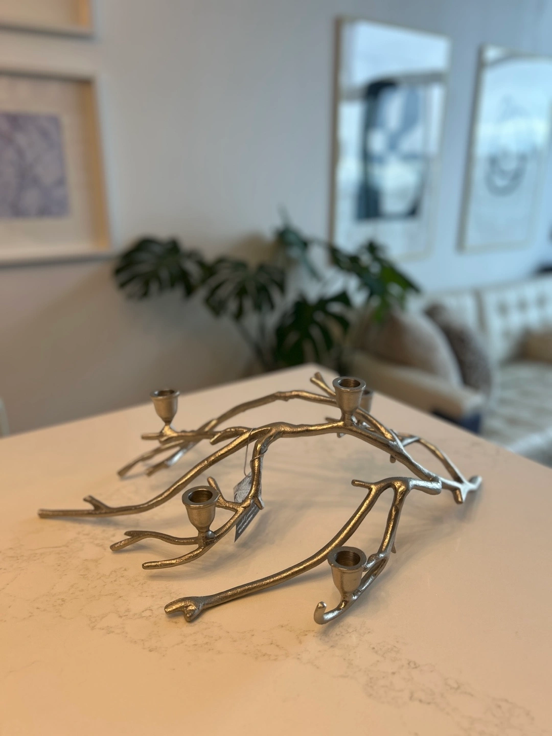 Candlestick holder shaped like tree branches. Made of silver metal. Features 5 candle holders. A perfect addition to create a relaxing and cozy atmosphere.