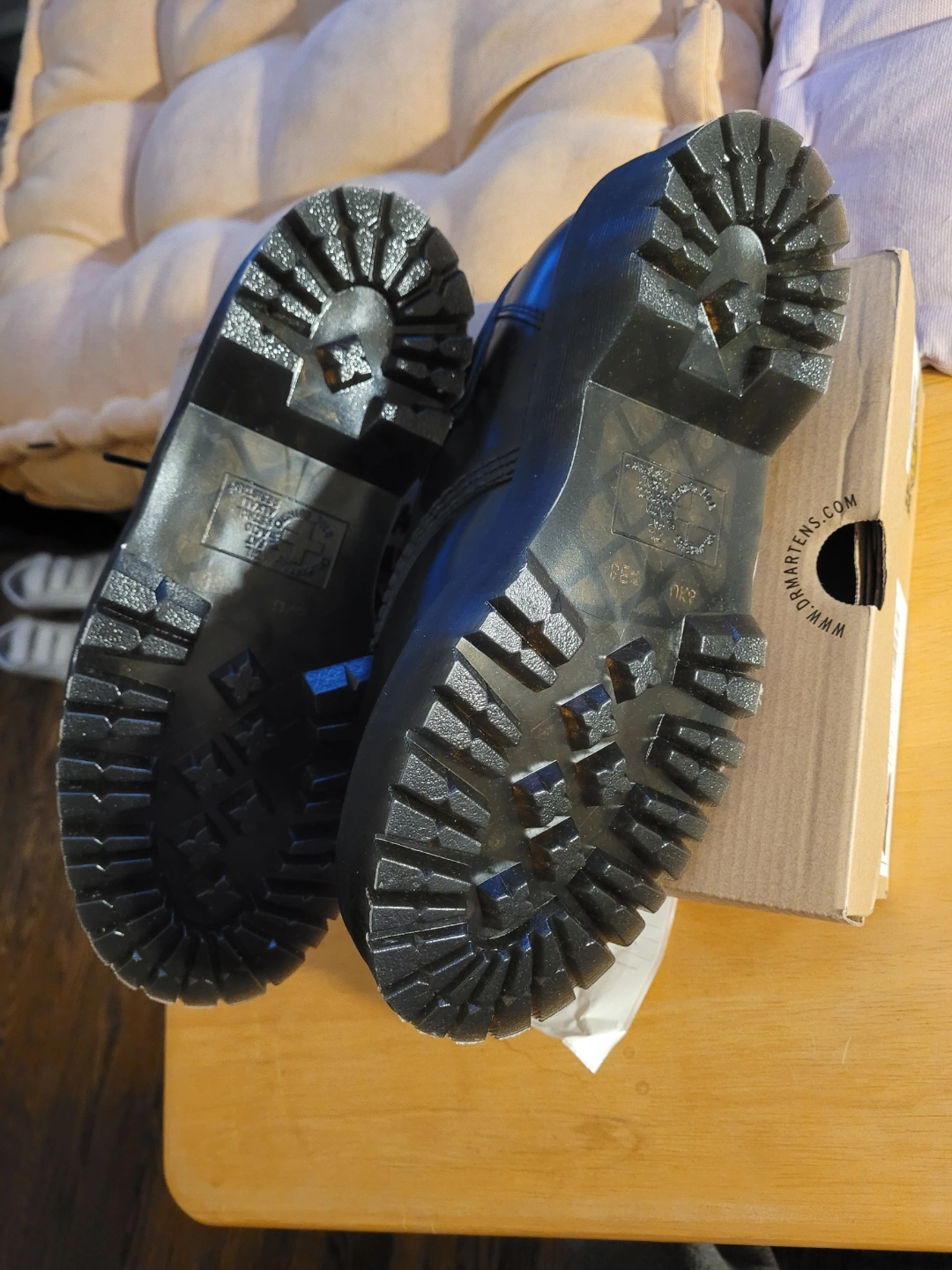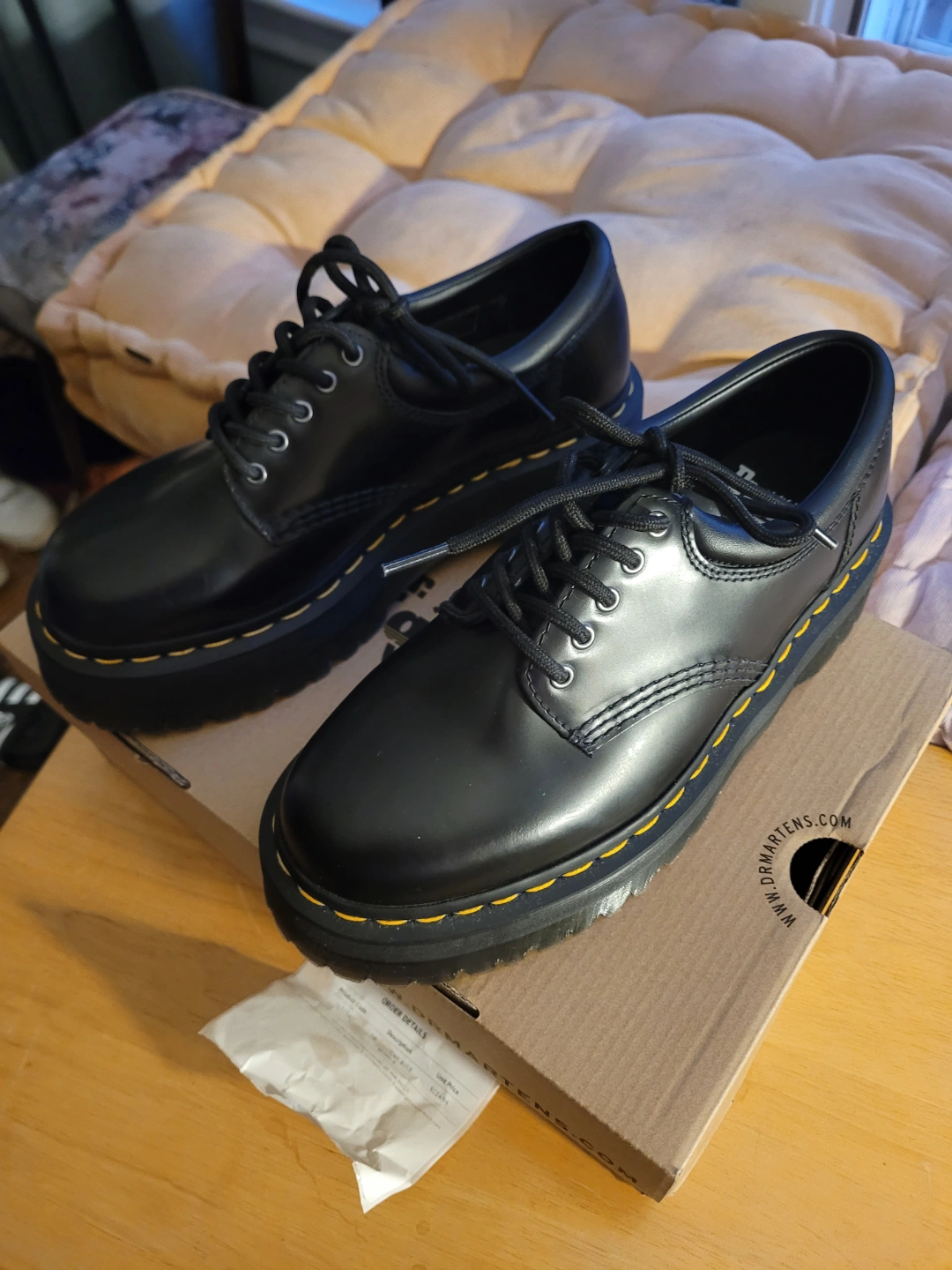 Doc Martens Black 8053 Quad Leather Platform Shoes - size 8 women's- polished smooth. Original price $235. Brand new in box - received as a gift but they don't fit me!