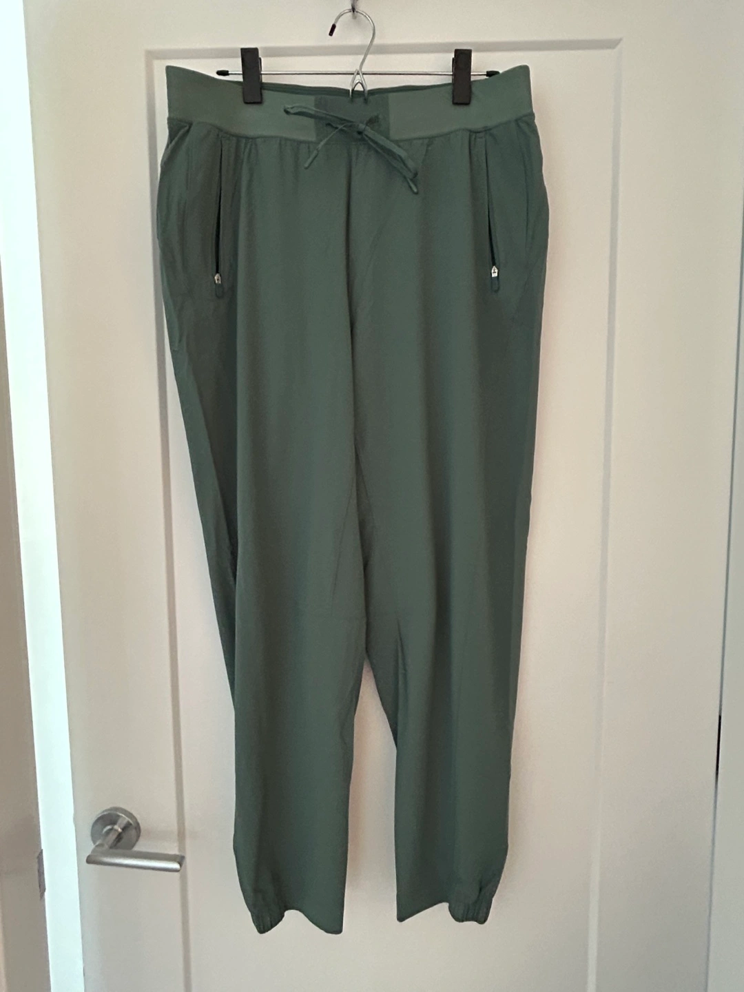 Nylon pants in a sage green. Features a drawstring waist. Two pockets on the front. These joggers are perfect for relaxing at home.