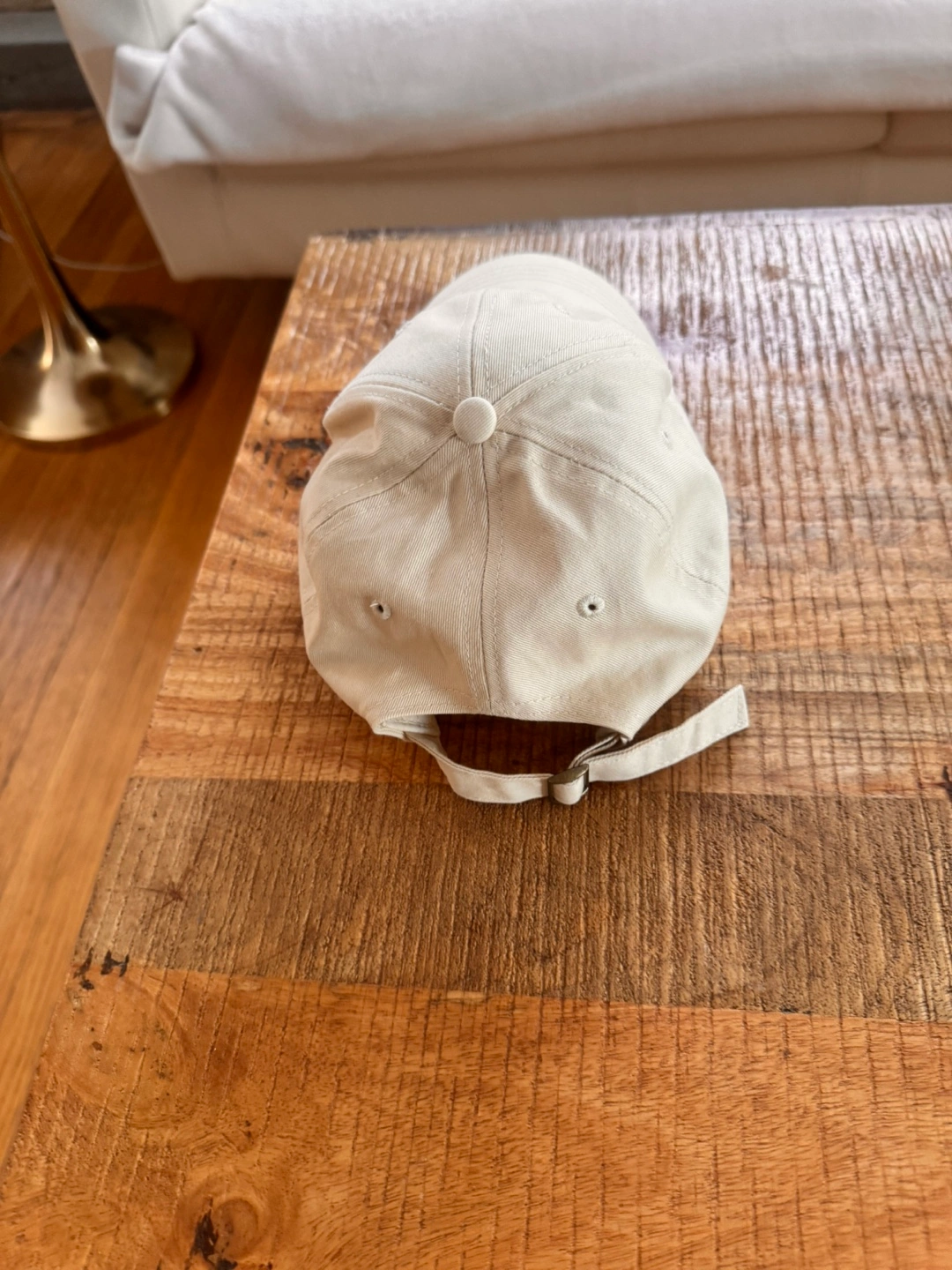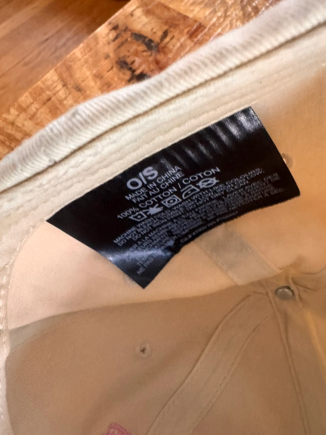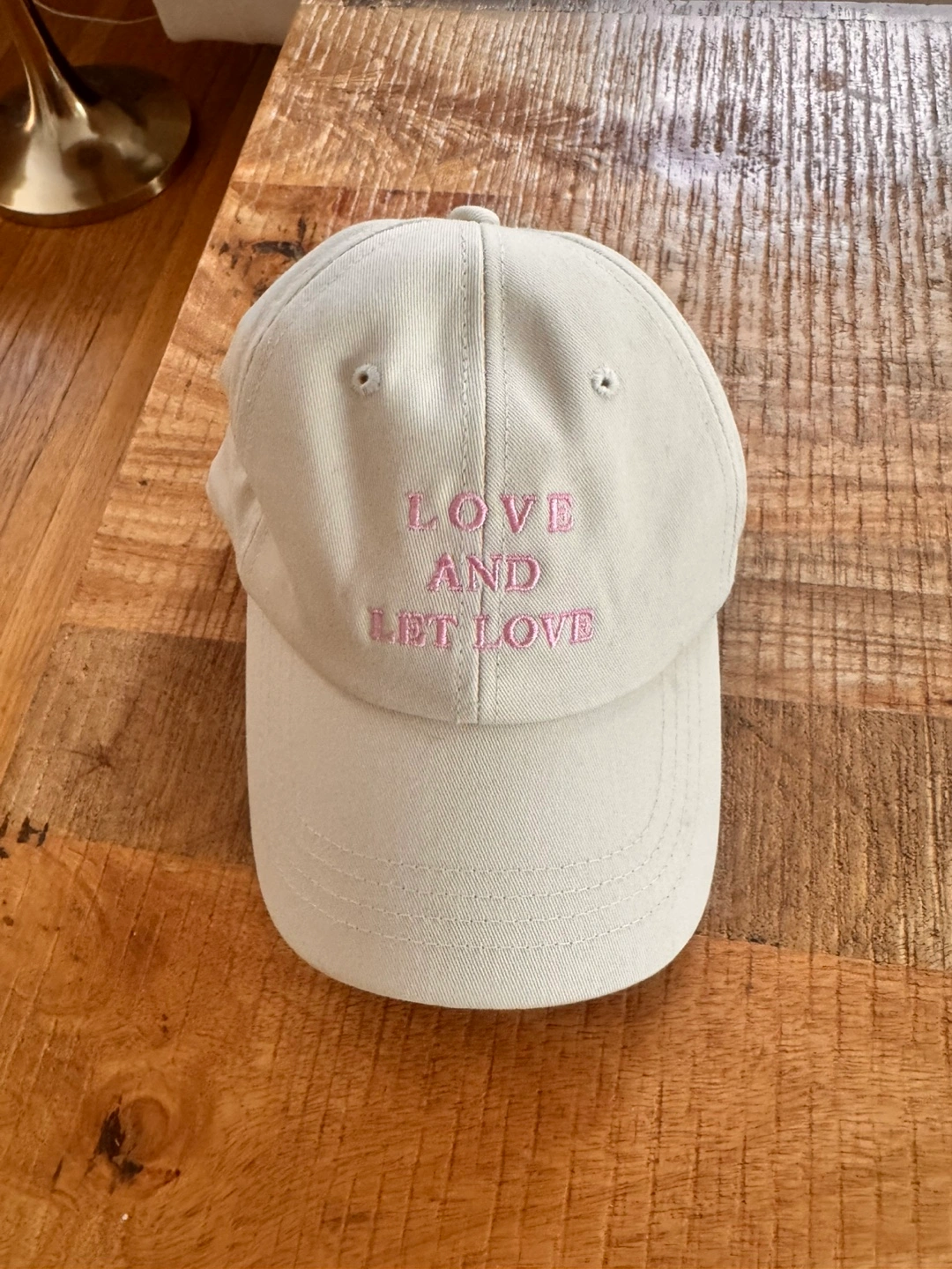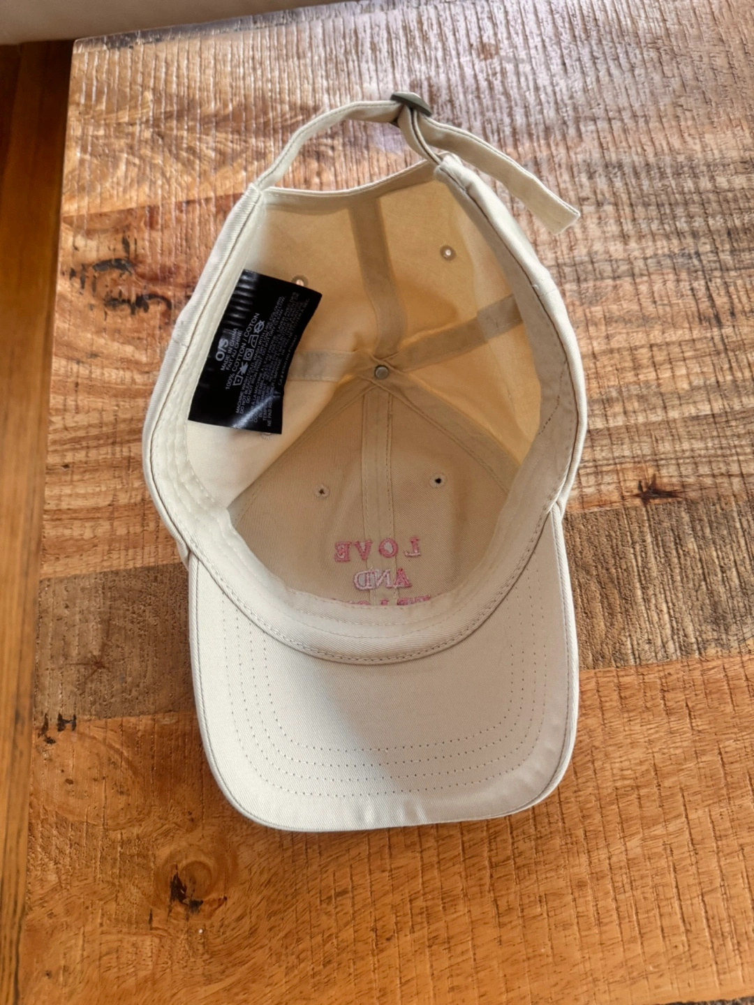 A neutral-toned baseball cap. Features pink embroidery. The brim is curved. A great piece to protect your eyes from the sun.