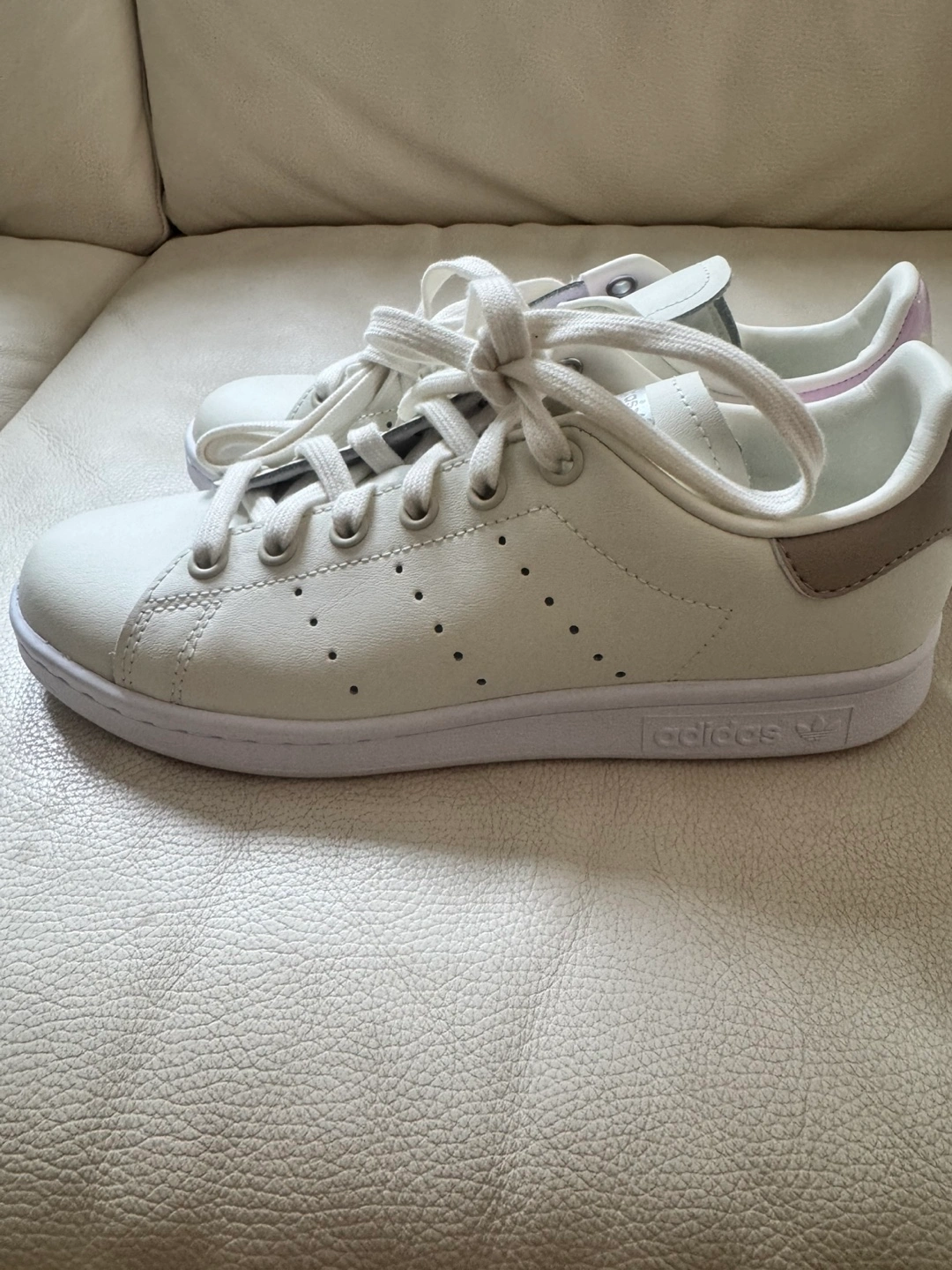 White sneakers with laces. Perforated detail on the side. Pastel colour accents at the back. A peaceful walk in these is a great way to unwind. Fits a little bigger reasonable offers too low will be ignored and serious buyers.