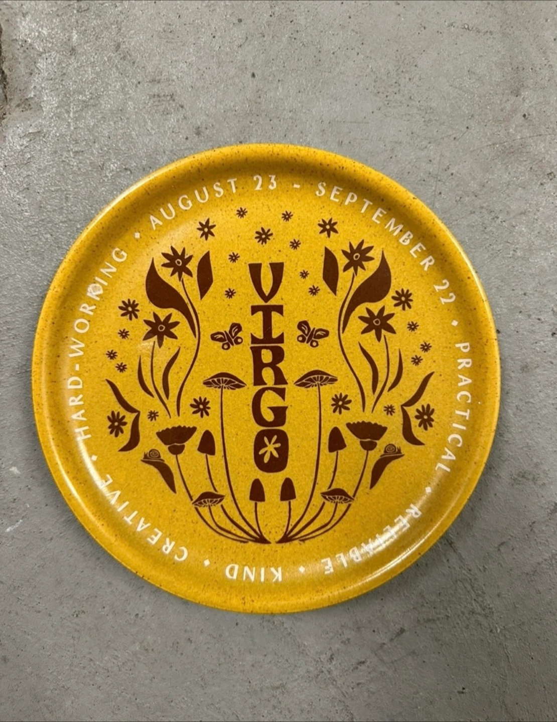 1000+Yellow tray. Features illustrations, text. Words like "Virgo", "Creative", "Kind", and dates. A lovely tray for serving your favourite foods.