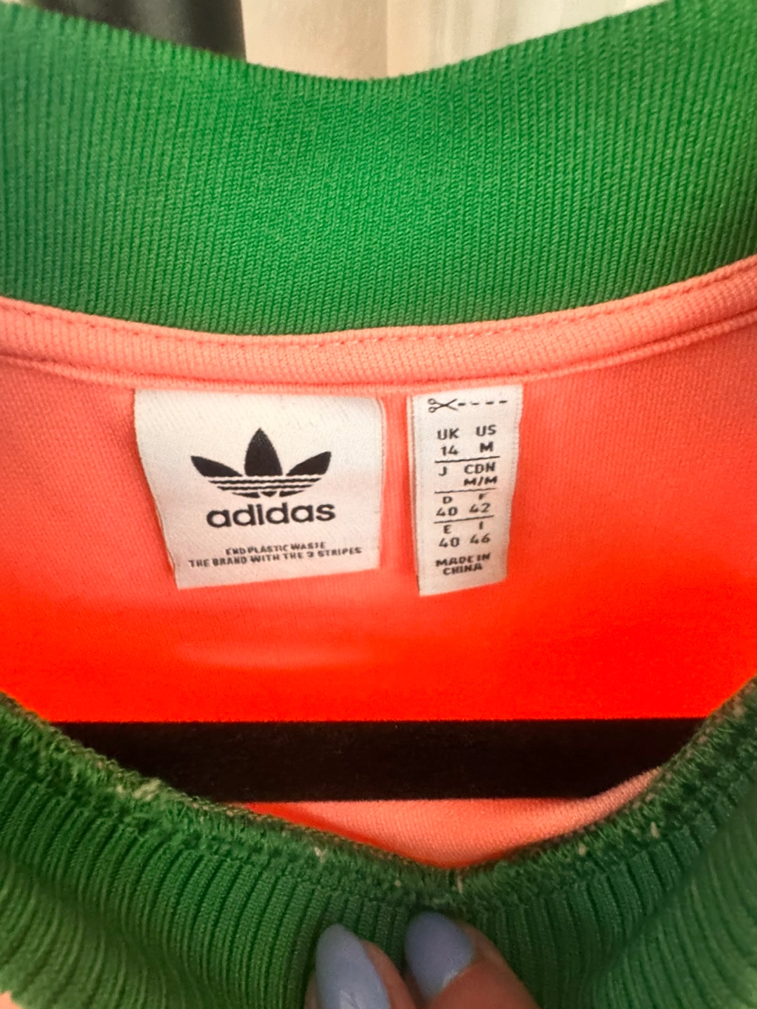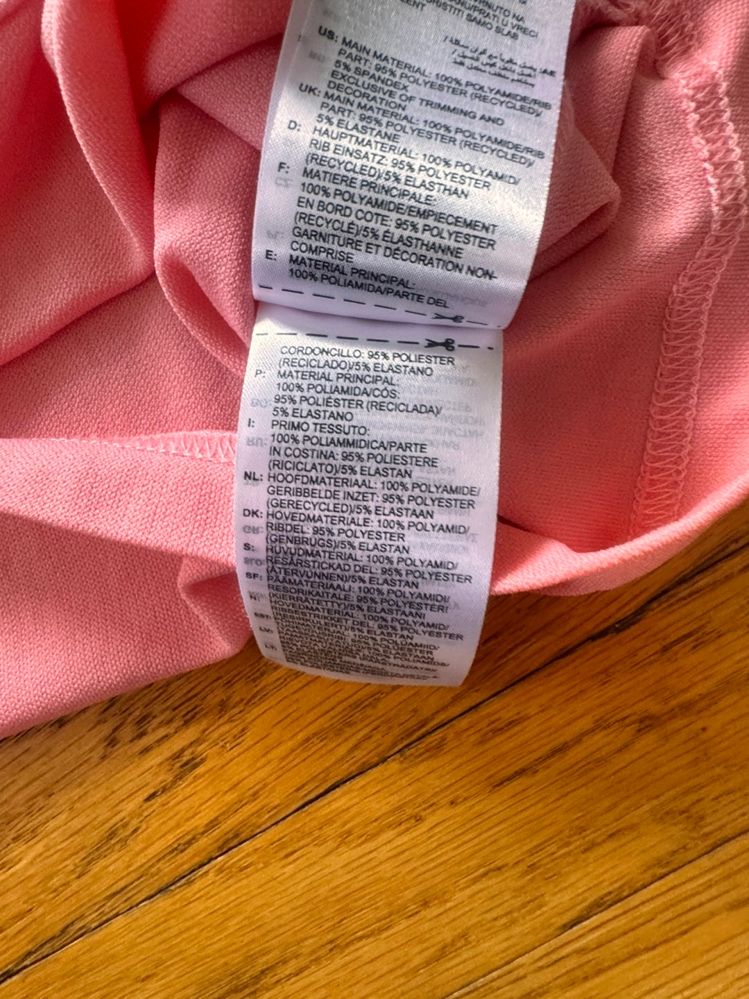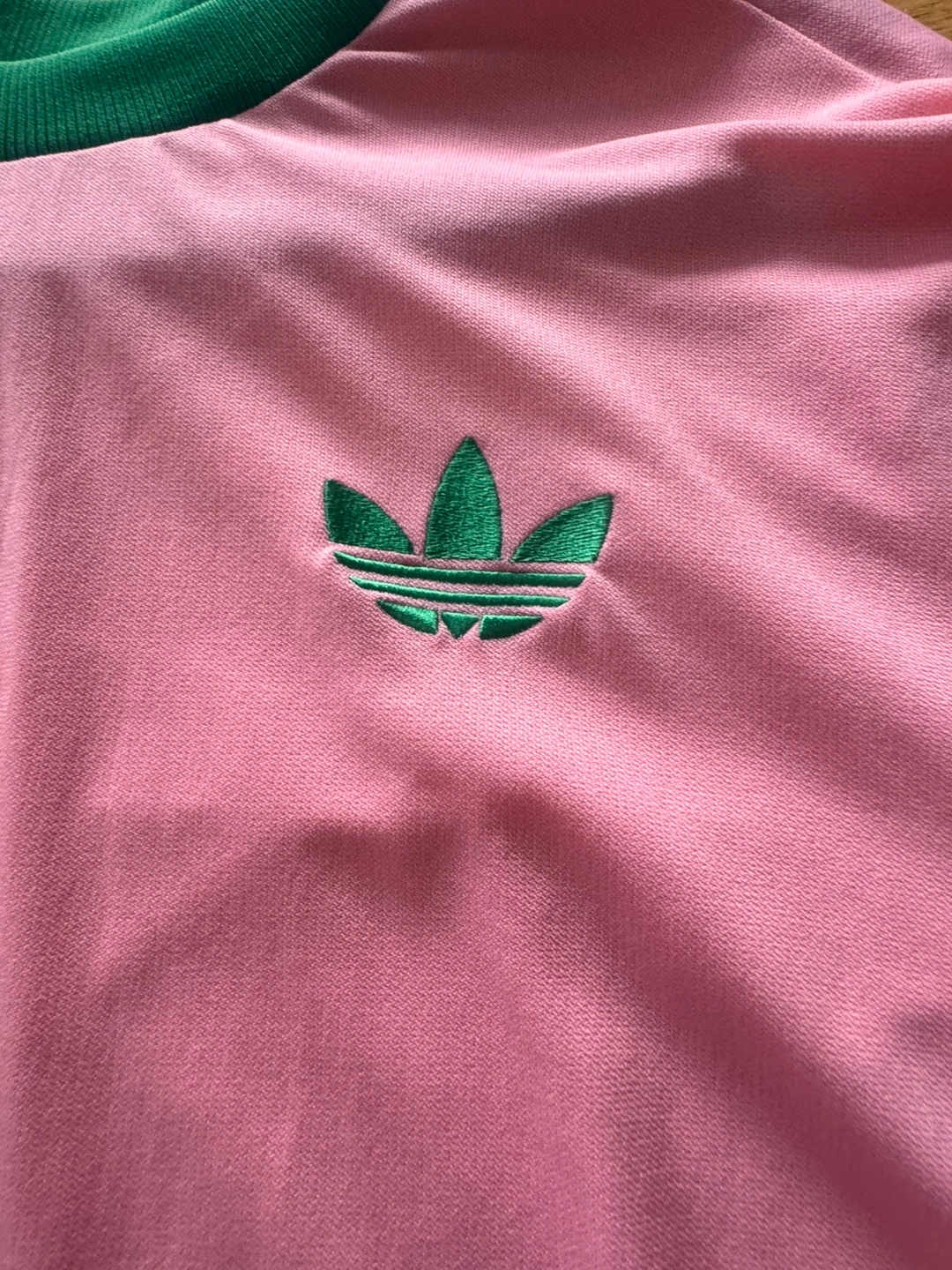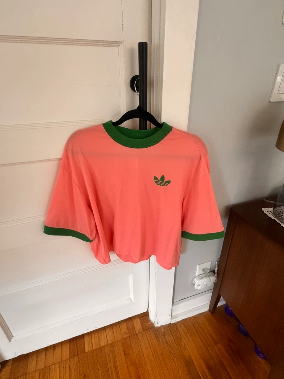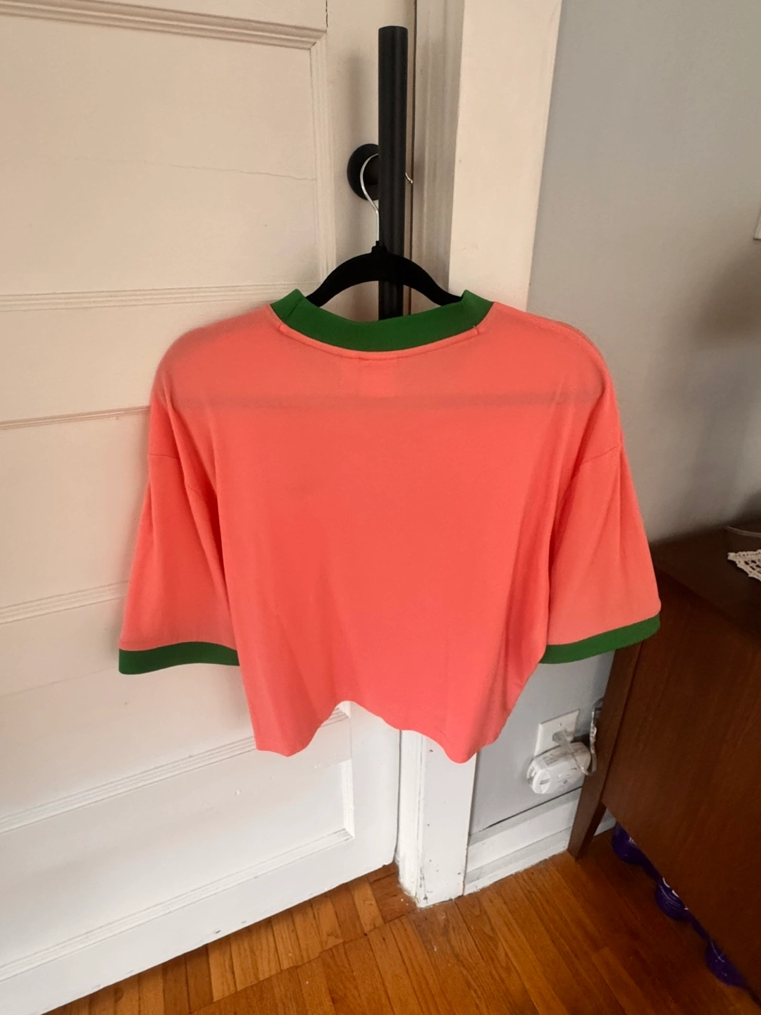 Pink t-shirt with green trim. Features an embroidered logo. It's a very comfortable item for daily wear. Reasonable offers too low will be ignored and serious buyers This item is to pickup to long branch since I reduce the price.