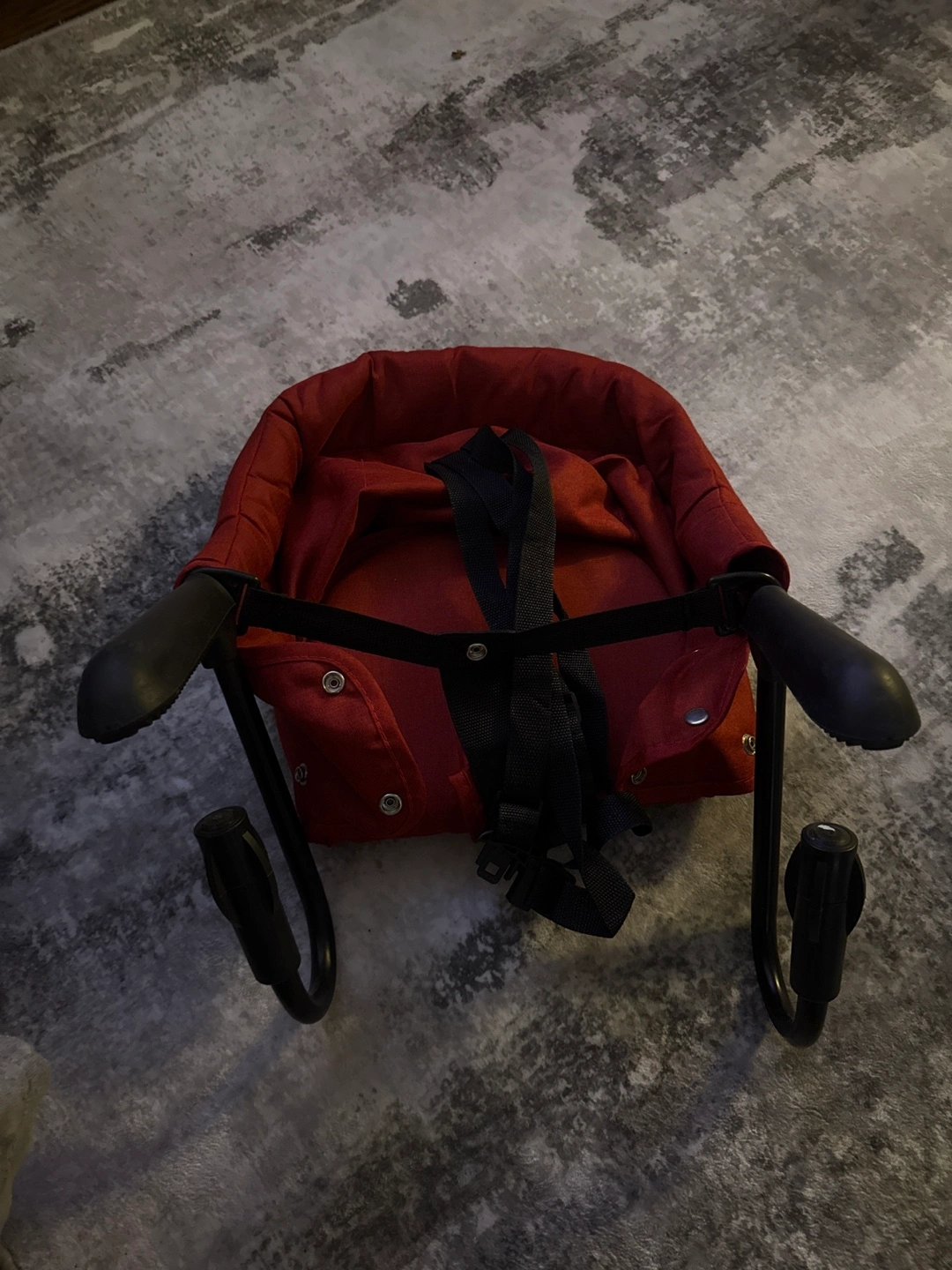 Chair in red fabric. Includes straps and black metal legs. Use this chair to create moments of peace while enjoying family meals.