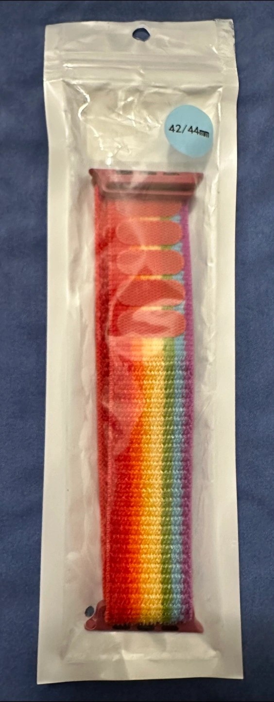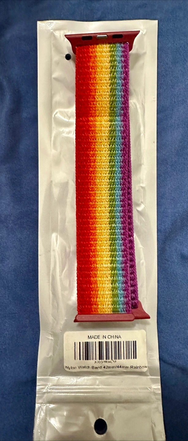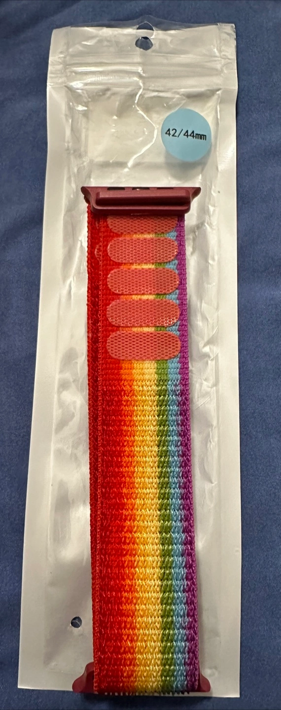 Nylon watch band with a rainbow design. Fits watch sizes 42mm/44mm. Wearing this watch band can add a pop of colour to your day.