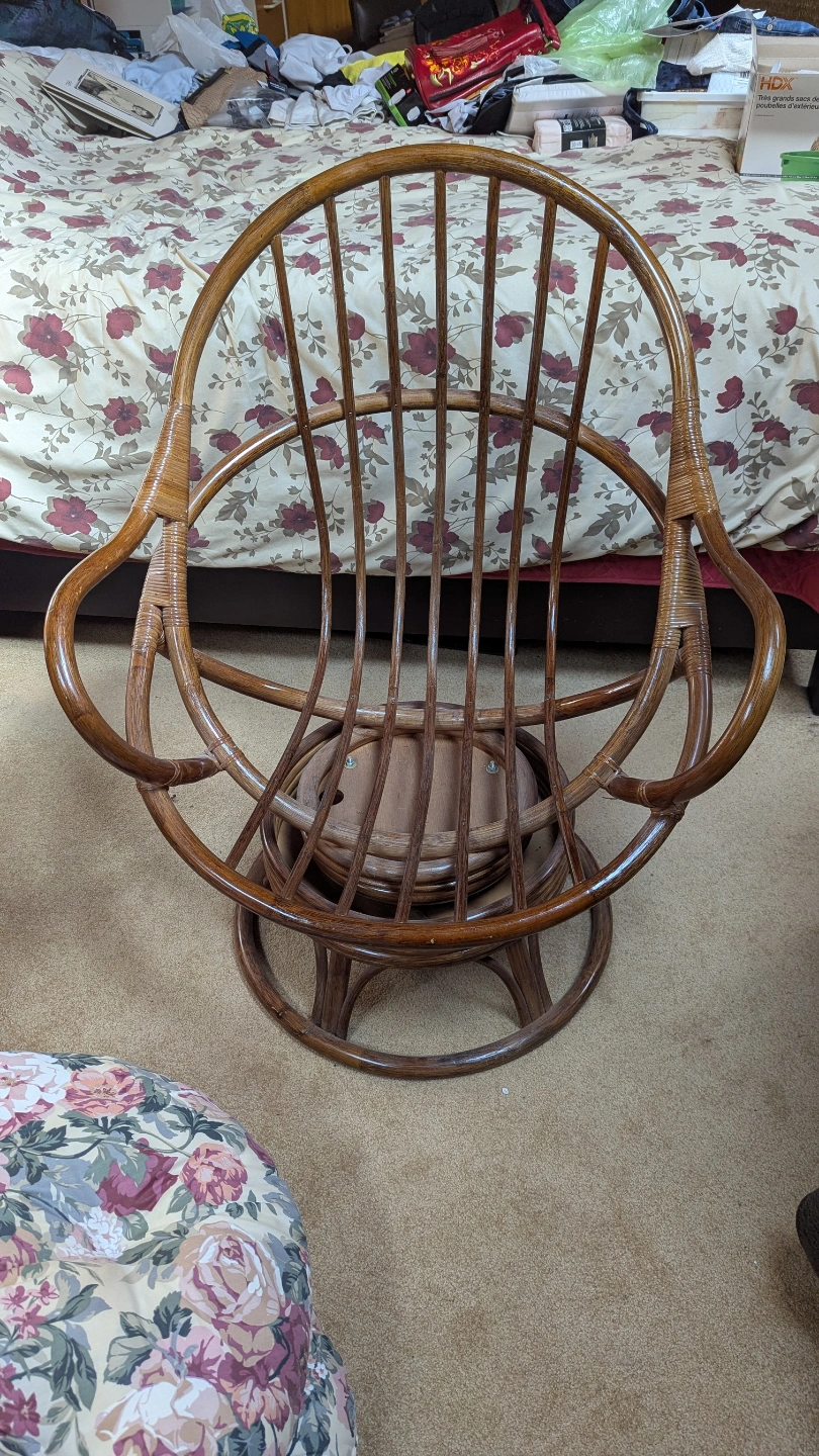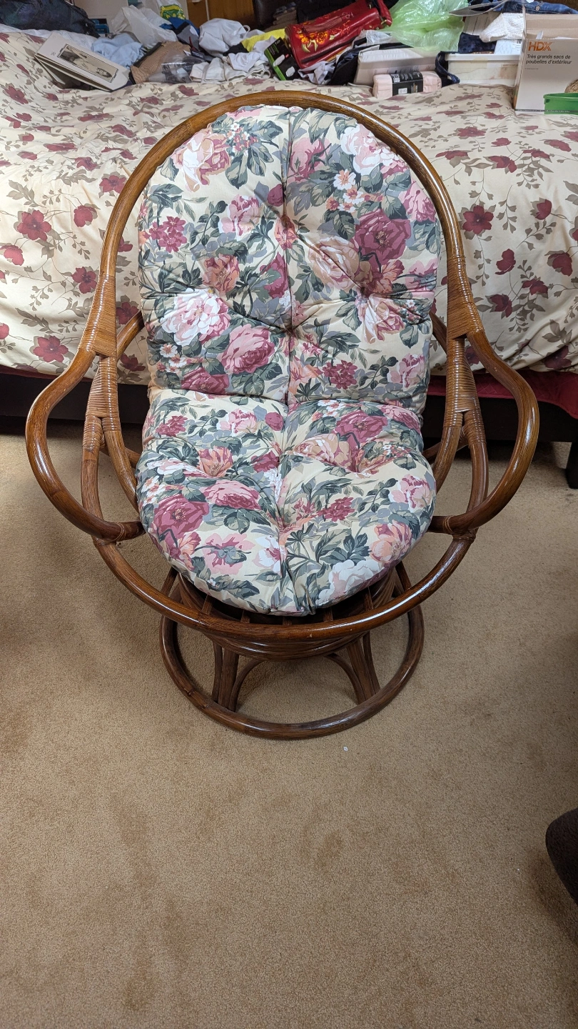 A wooden rattan swivel chair. Features a floral cushion. The chair's frame is a warm brown colour. Would be perfect for a relaxing read after a long day. Quantity 2 at $250.00 each or $425.00 for both.