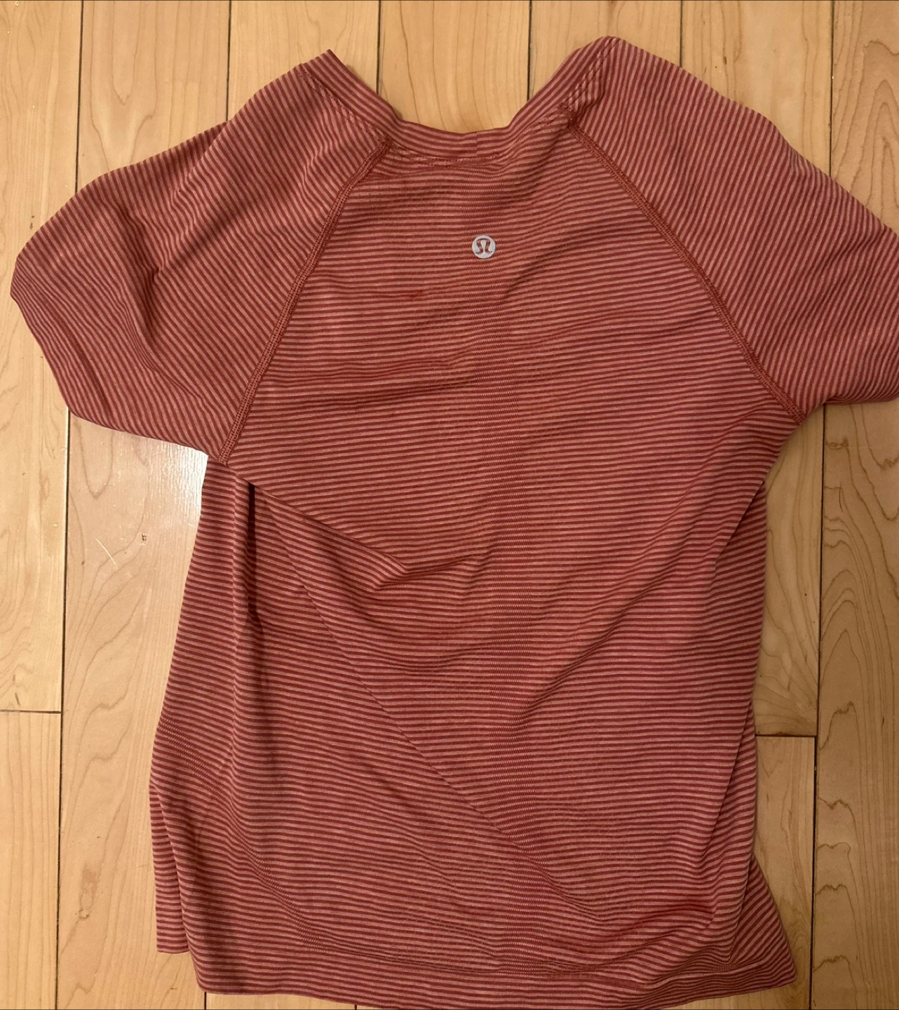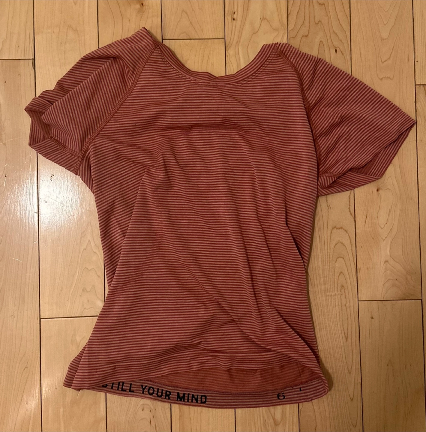 Red and pink striped workout top. Crew neck style. Short sleeves. "STILL YOUR MIND" text on the bottom. Great for yoga classes to help recenter yourself after a long day.