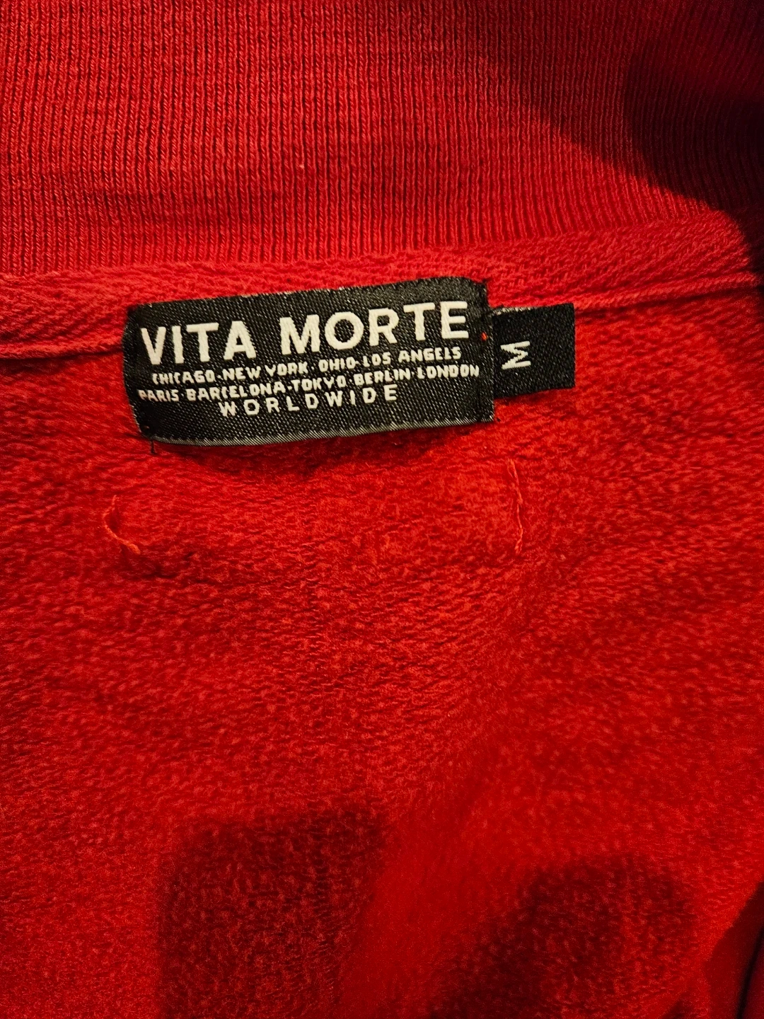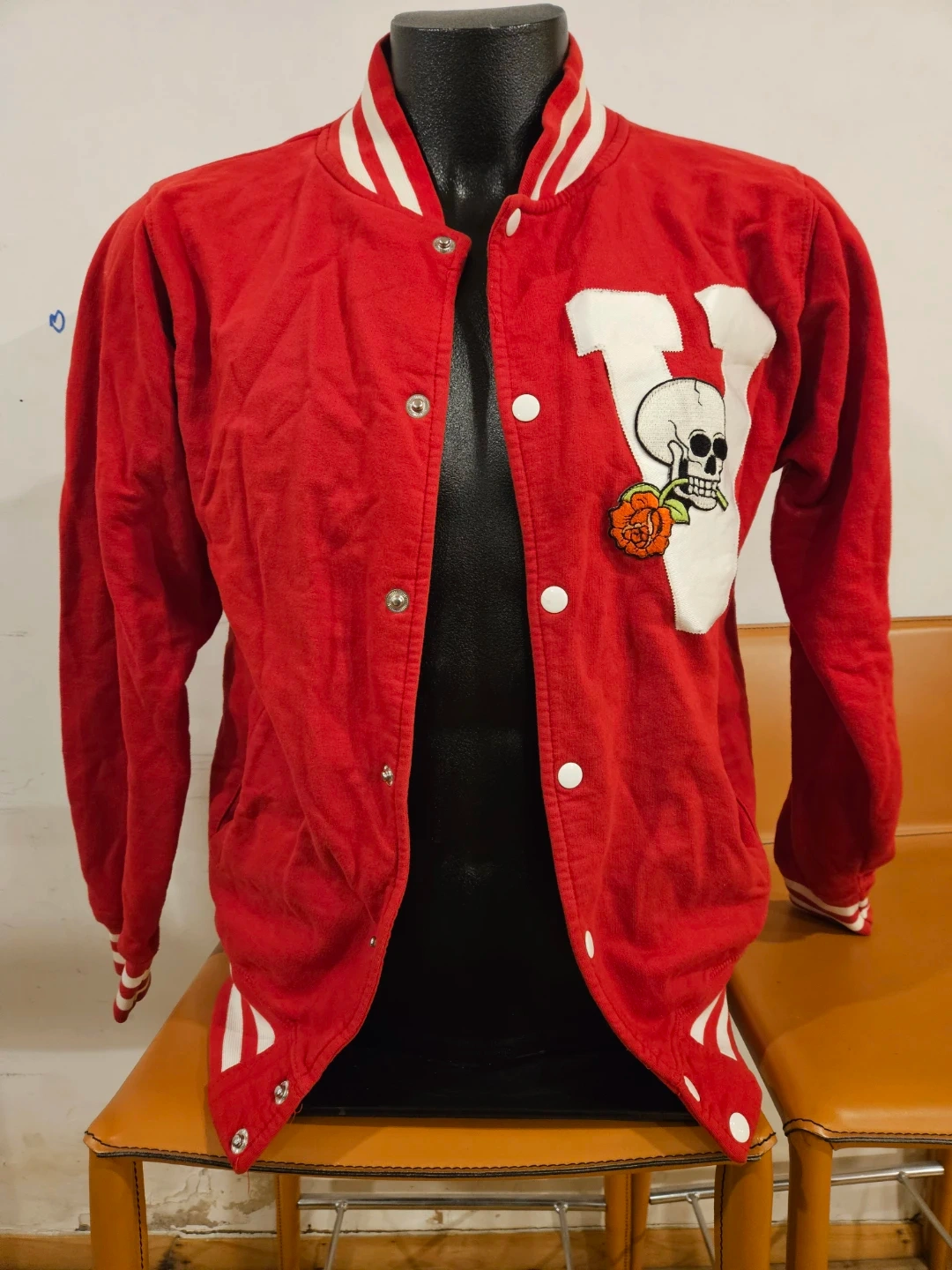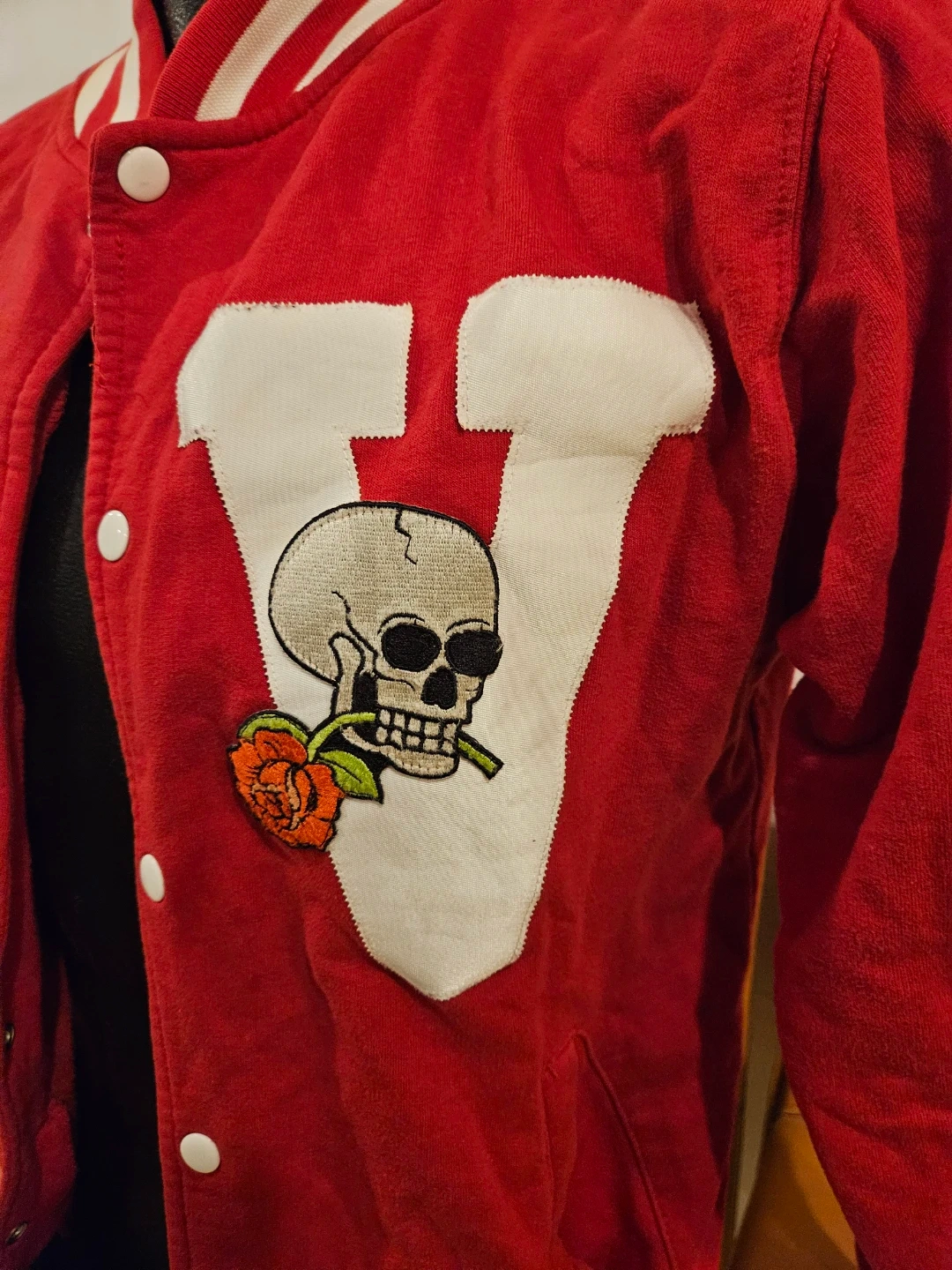 Vita Morte varsity jacket in red with a skull and rose patch. It's a size medium with striped ribbed cuffs and collar. This jacket has a snap button closure.