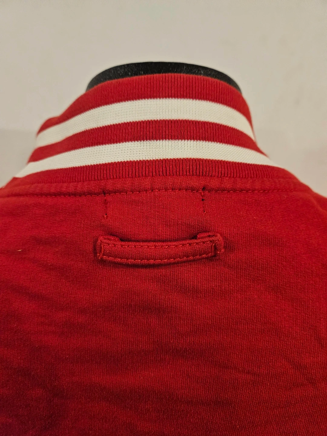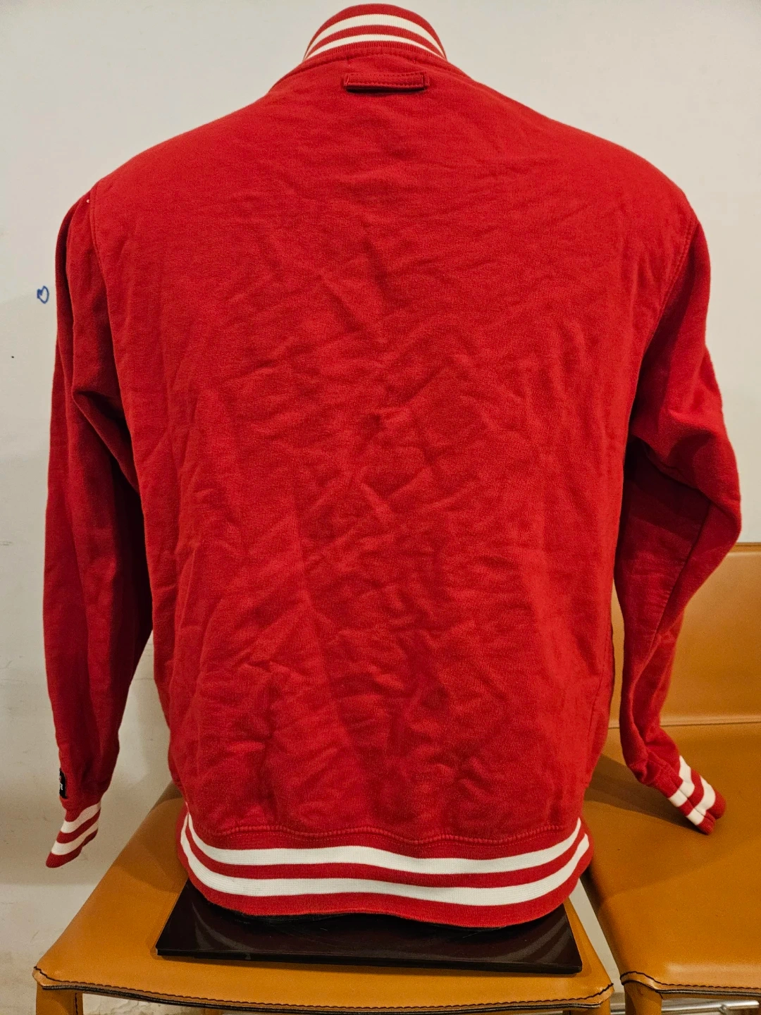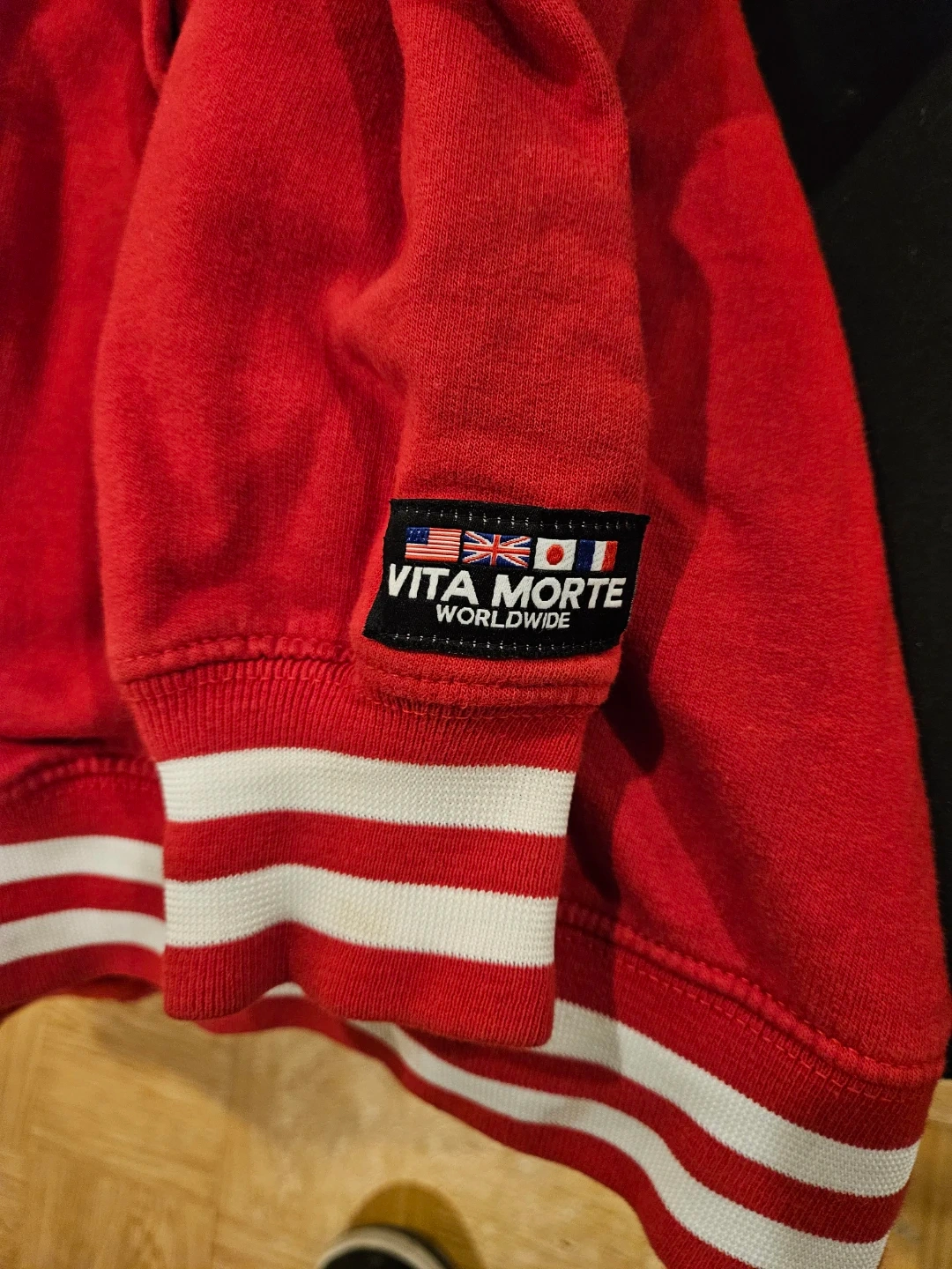 Vita Morte varsity jacket in red with a skull and rose patch. It's a size medium with striped ribbed cuffs and collar. This jacket has a snap button closure.