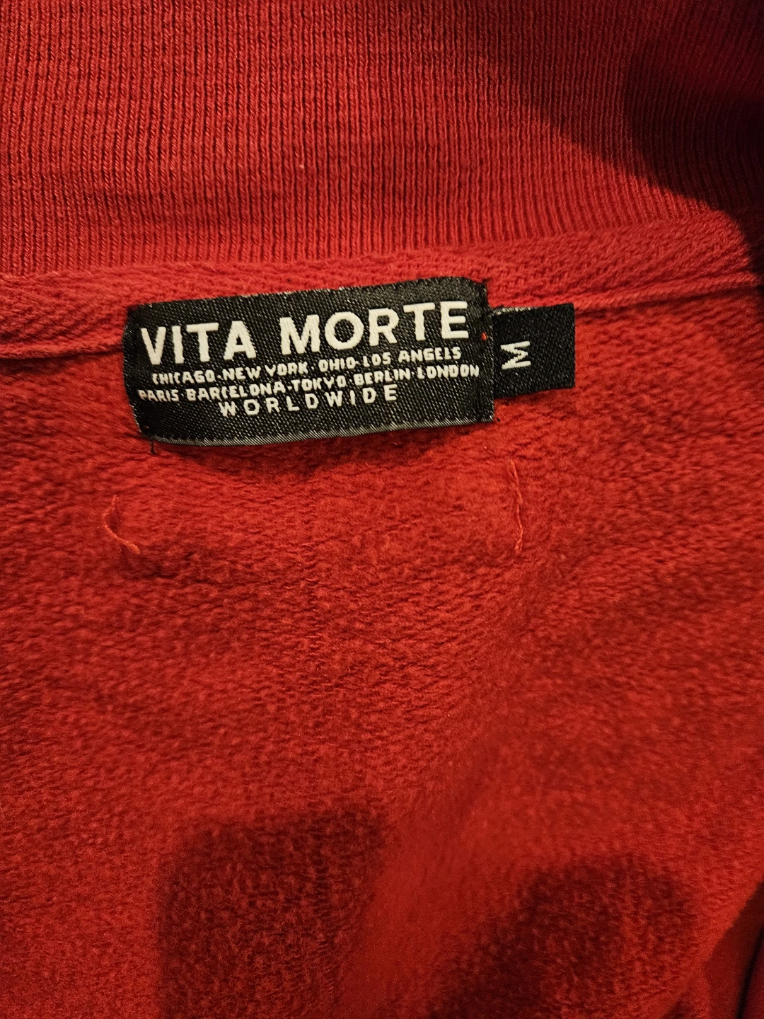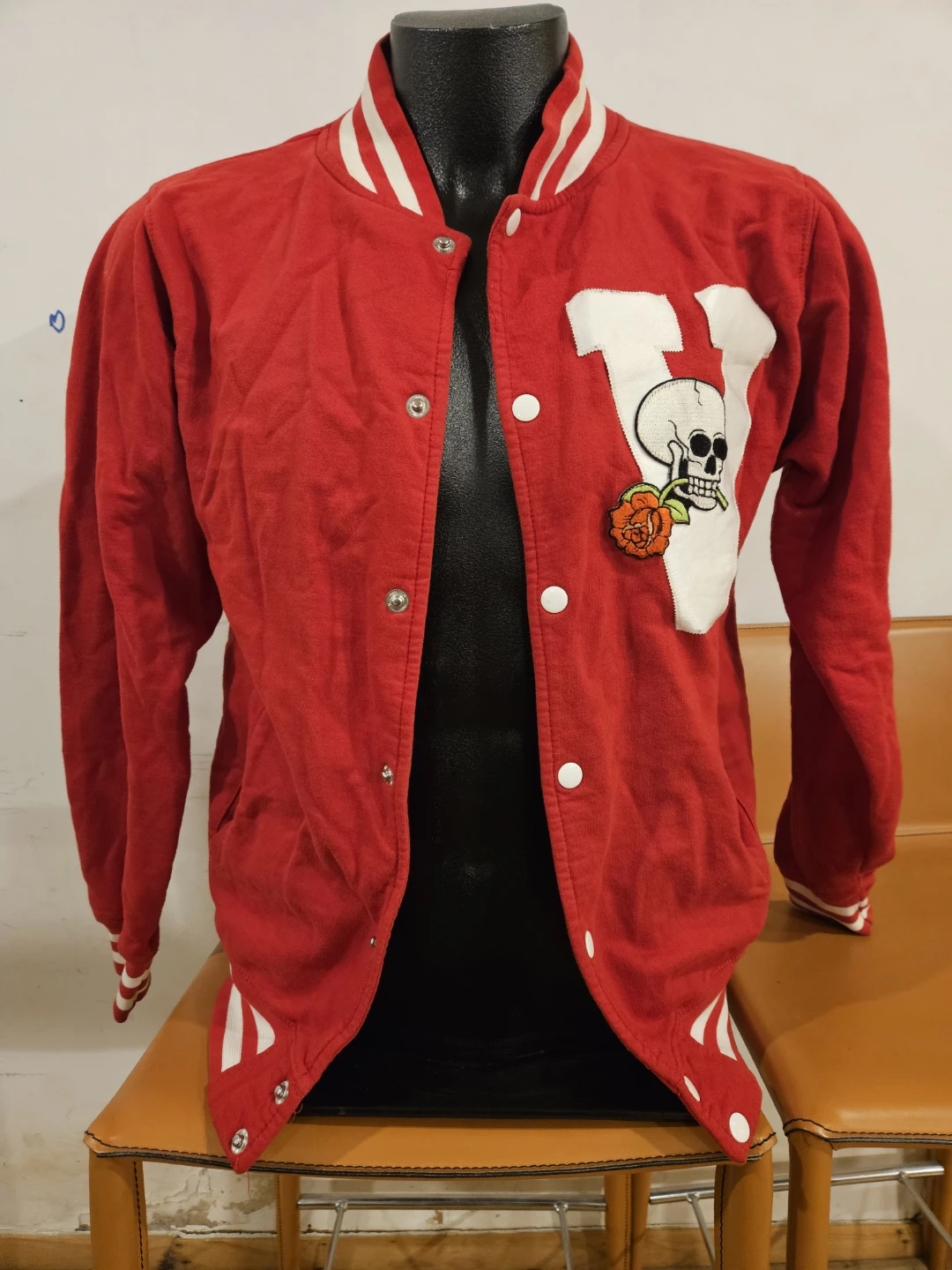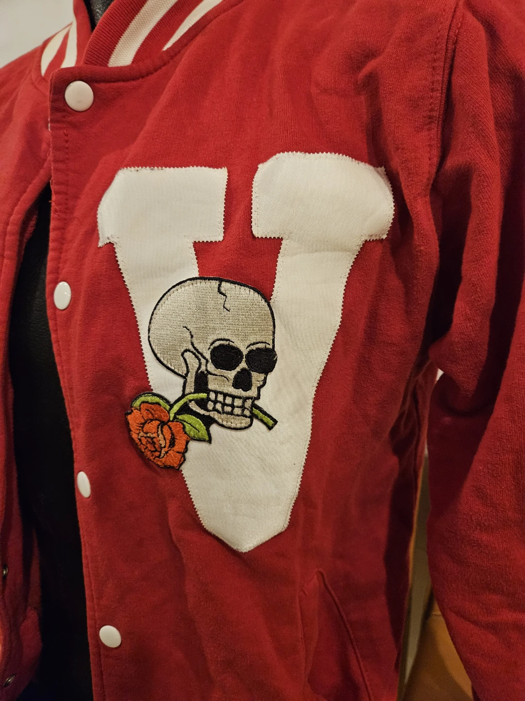 Vita Morte varsity jacket in red with a skull and rose patch. It's a size medium with striped ribbed cuffs and collar. This jacket has a snap button closure.