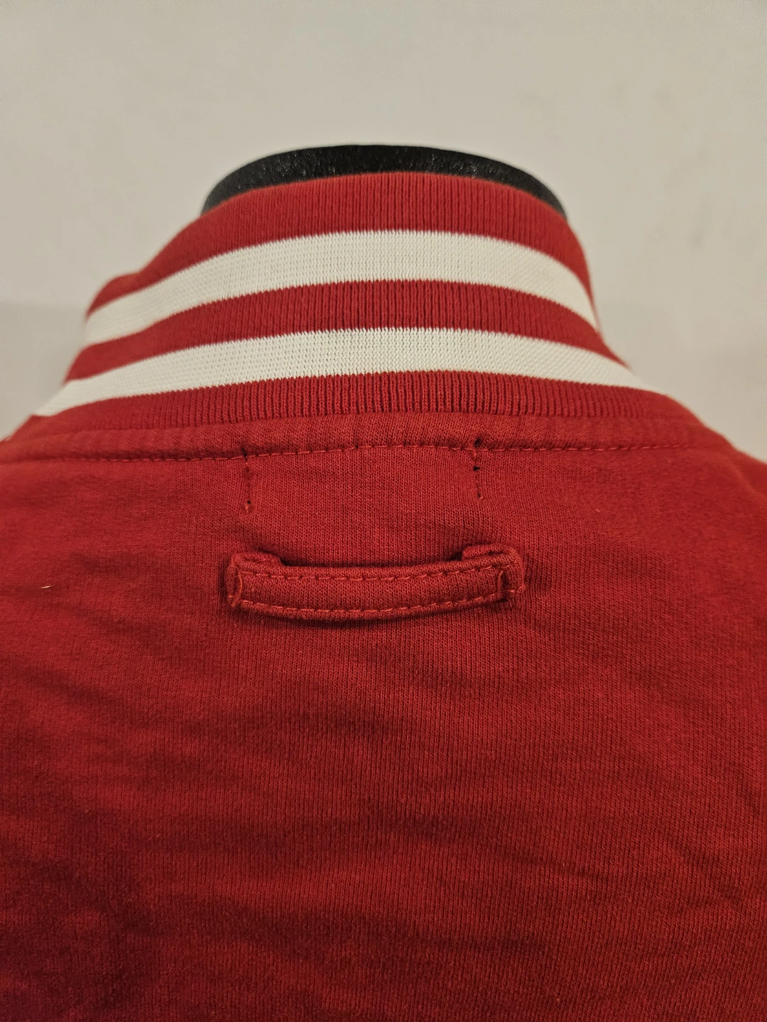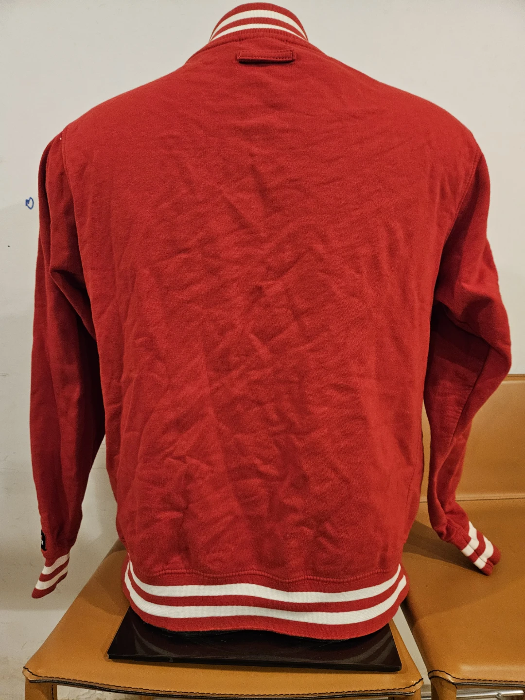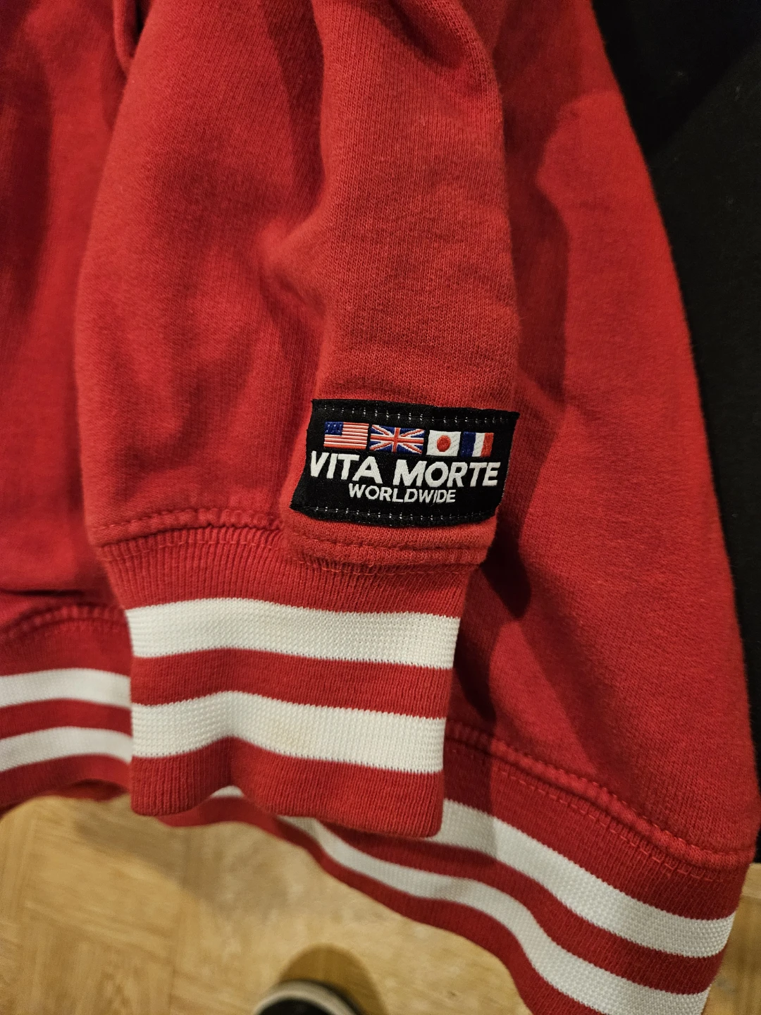 Vita Morte varsity jacket in red with a skull and rose patch. It's a size medium with striped ribbed cuffs and collar. This jacket has a snap button closure.