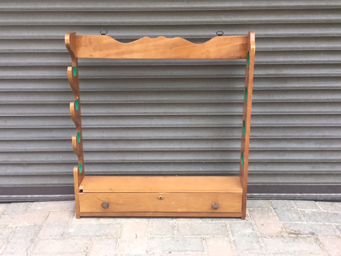 Wooden rack with a drawer. Four gun rests along the side. Shelf space underneath. Hooks at the top for mounting.