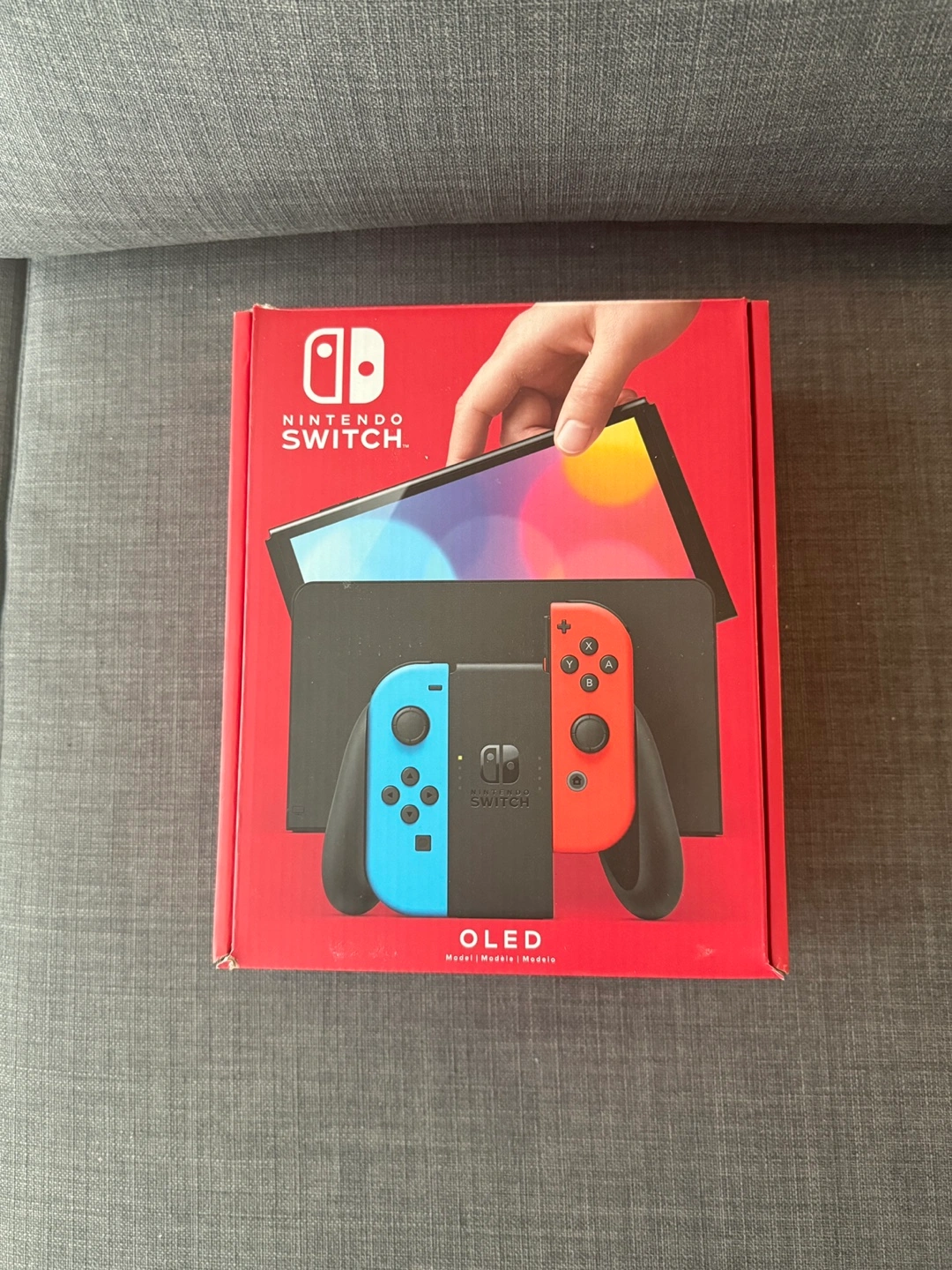 Console with a screen. Featuring blue and red controllers. Also a dock, charger, and other accessories. A great way to relax and unwind after a long day.