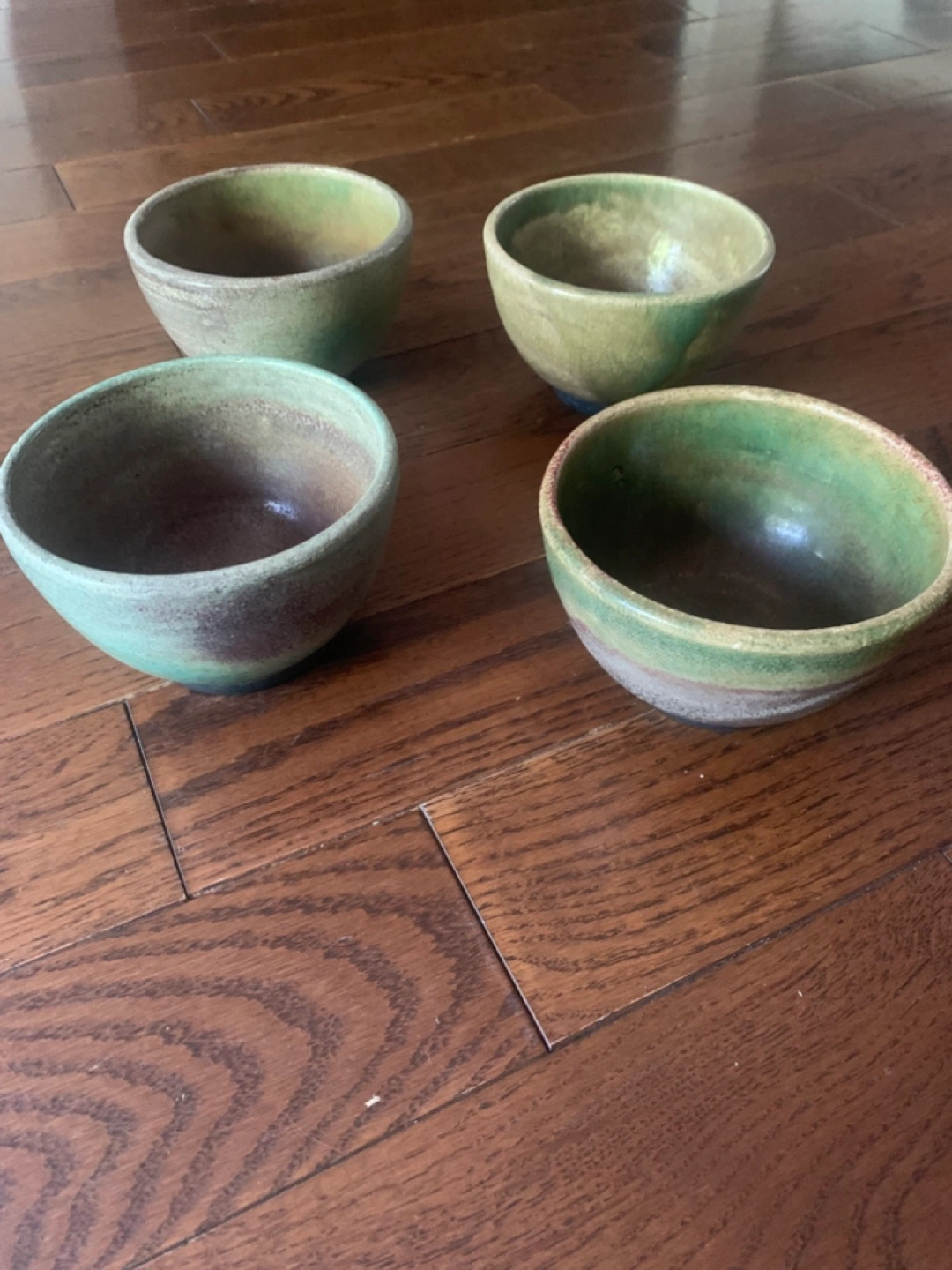 Four small, rounded pottery bowls. Each bowl is glazed in shades of green. These bowls are perfect for enjoying soup, cappuccinos or lattes