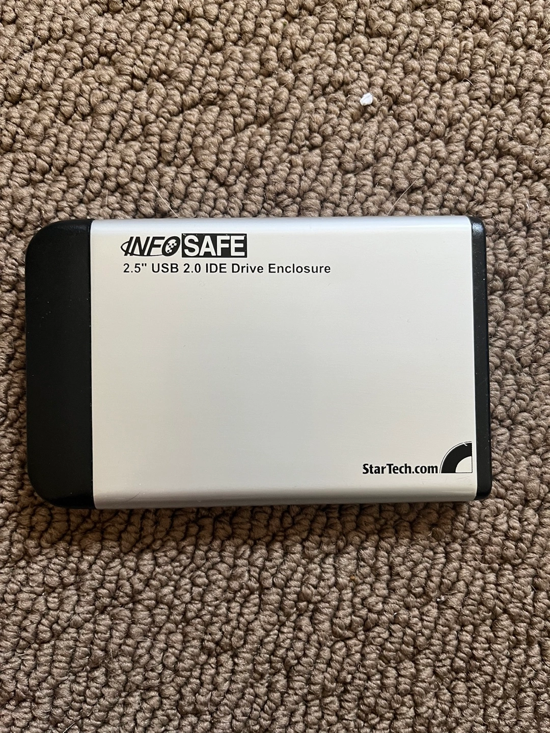 71Rectangular shaped enclosure with a silver top and black ends. Reads "2.5 USB 2.0 IDE Drive Enclosure". You can use this item to store and backup important files.