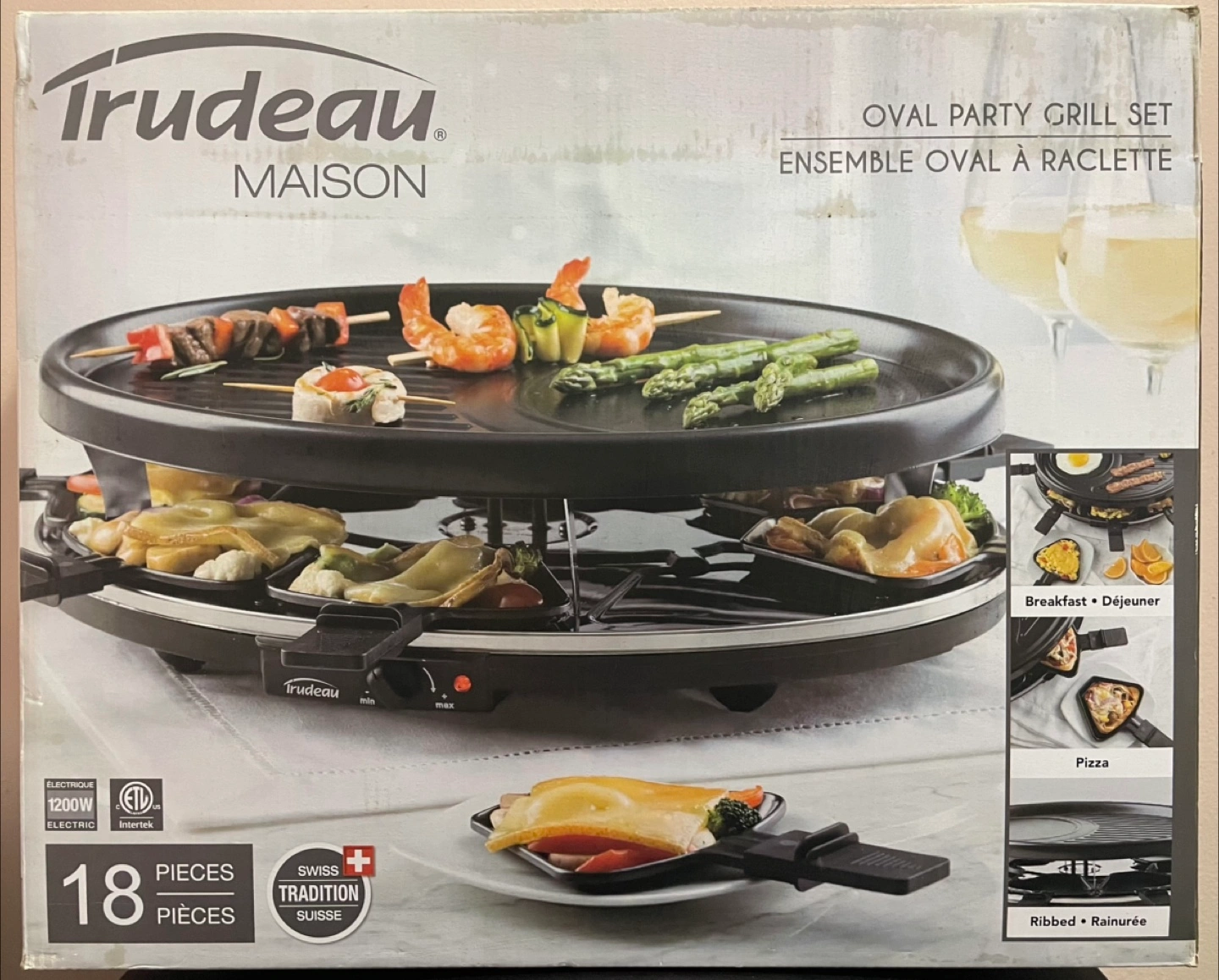 Oval raclette party grill set with 8 multiple raclette trays and wood scrapers. Perfect for a quiet night in with friends.