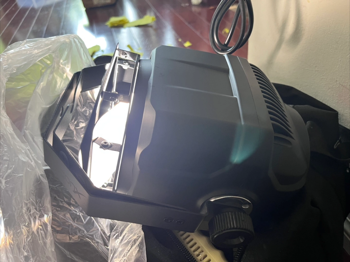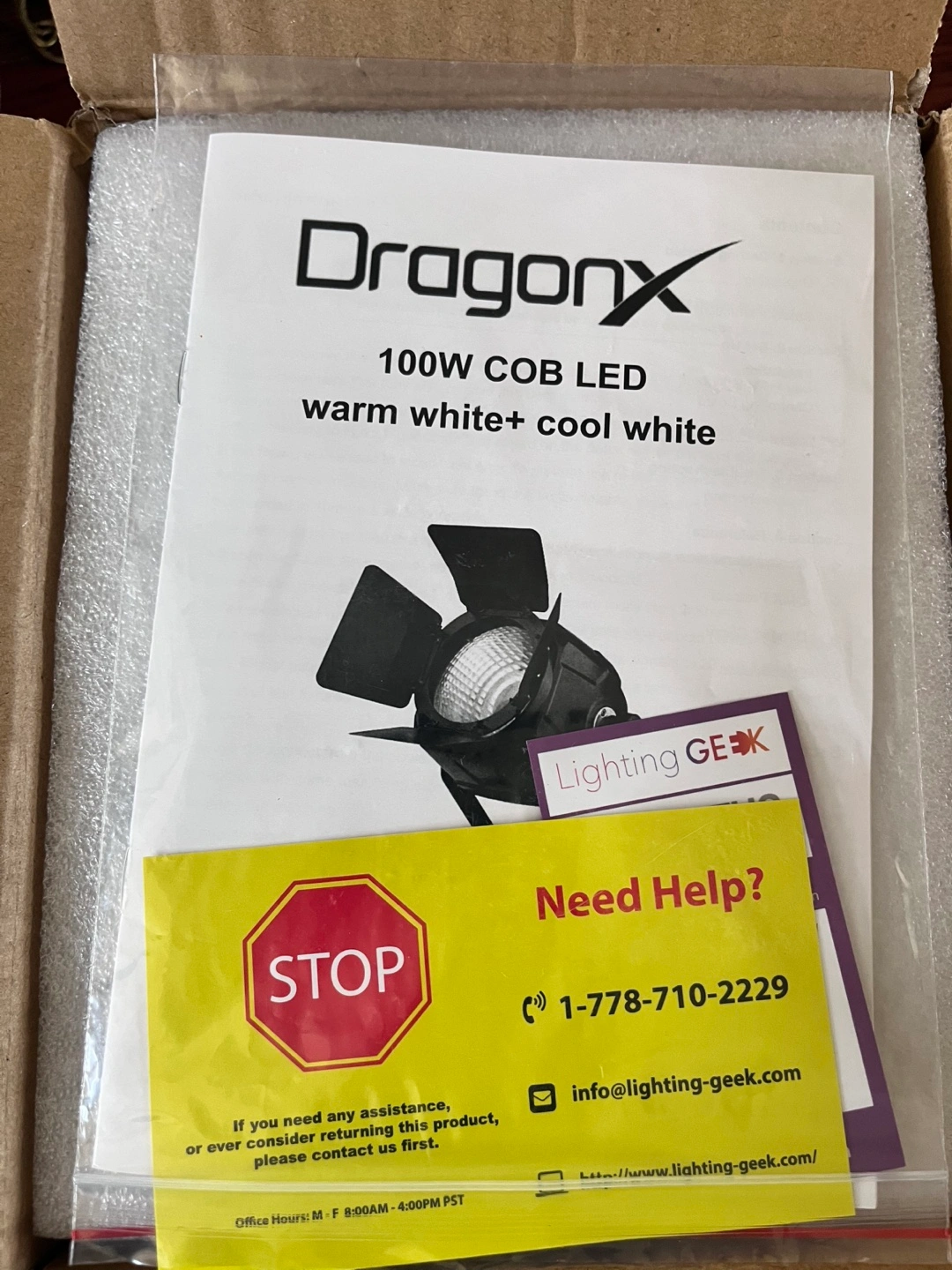 Spotlight with a black body. Attached cable. Some packaging and a manual is also included. This spotlight is perfect for creating soft ambient lighting in any room.